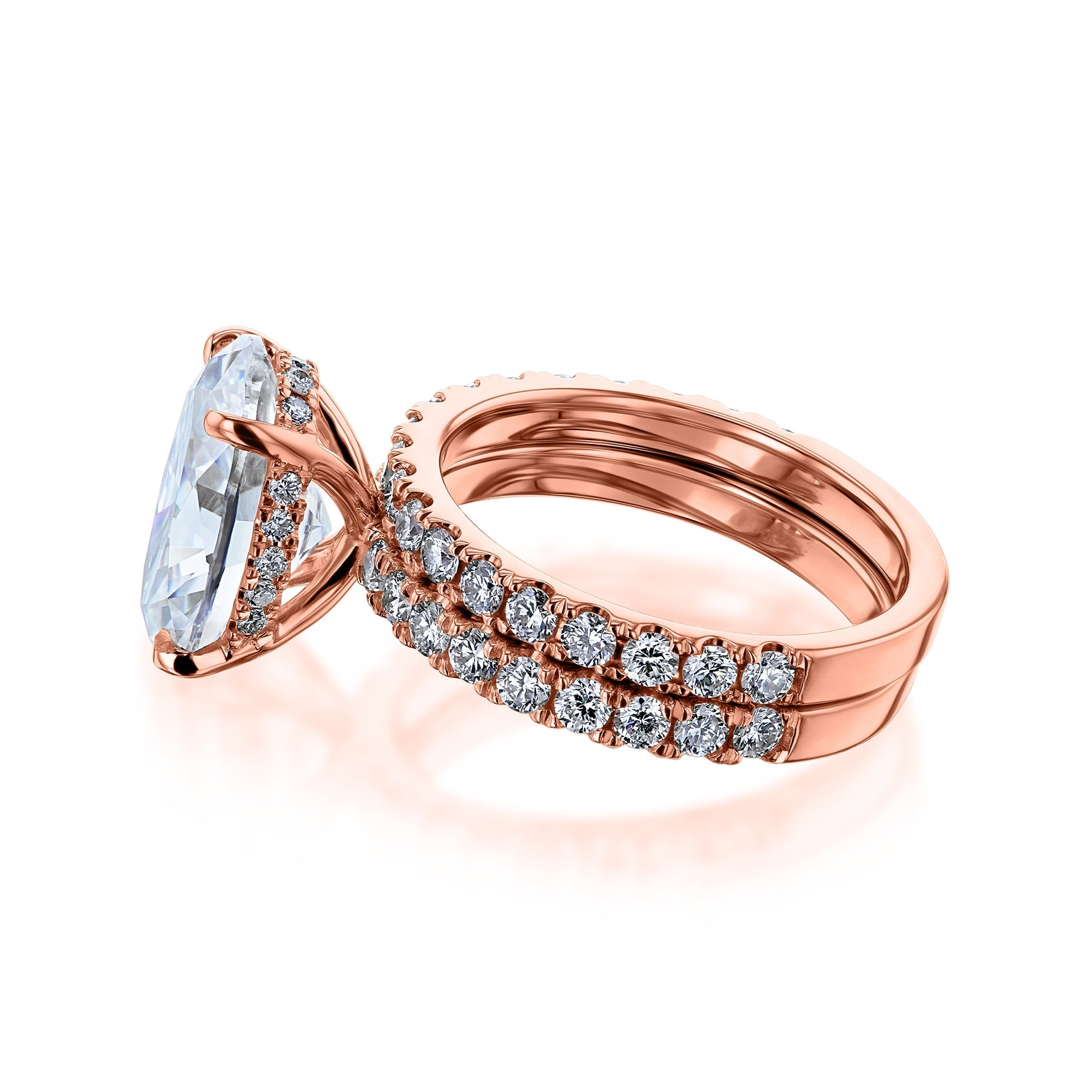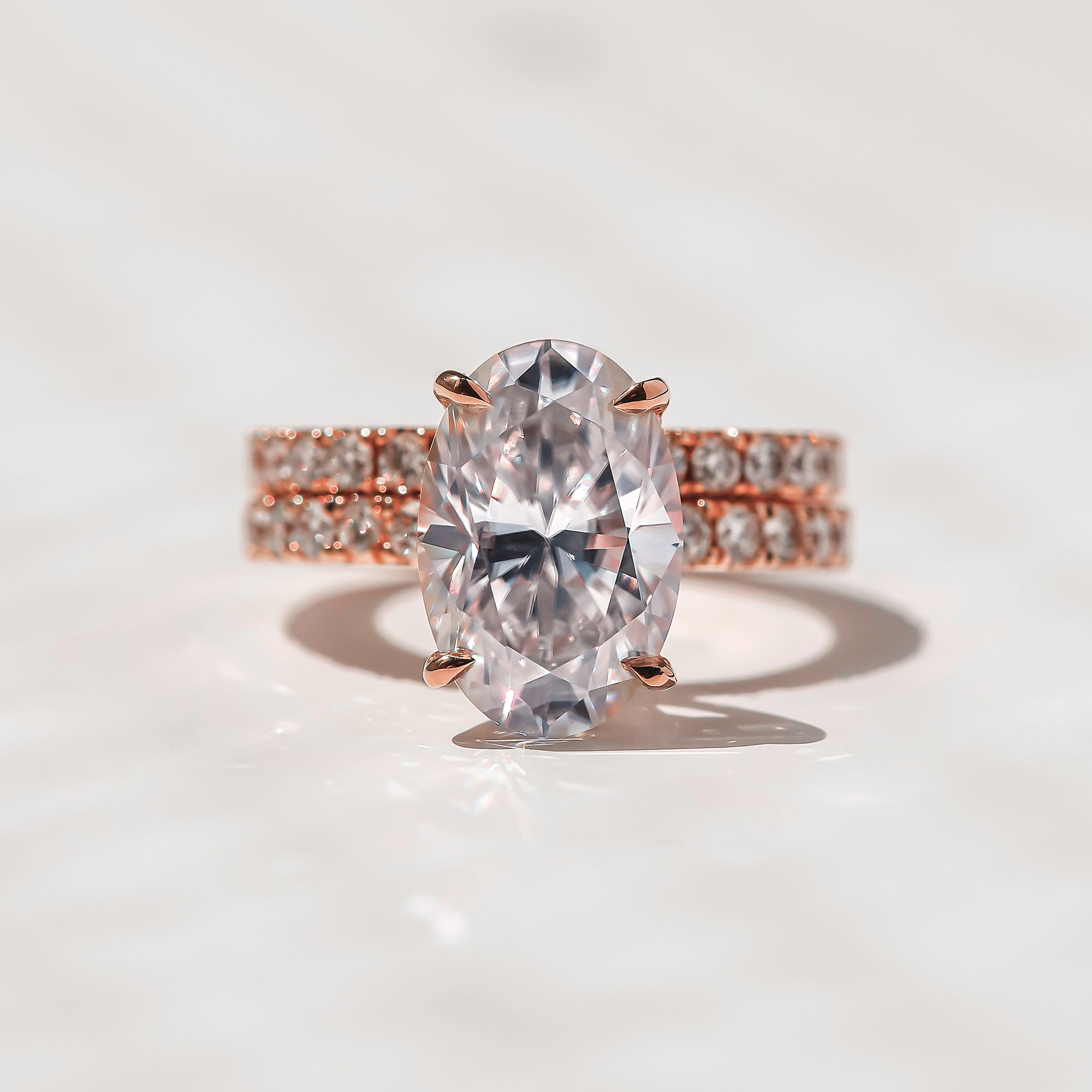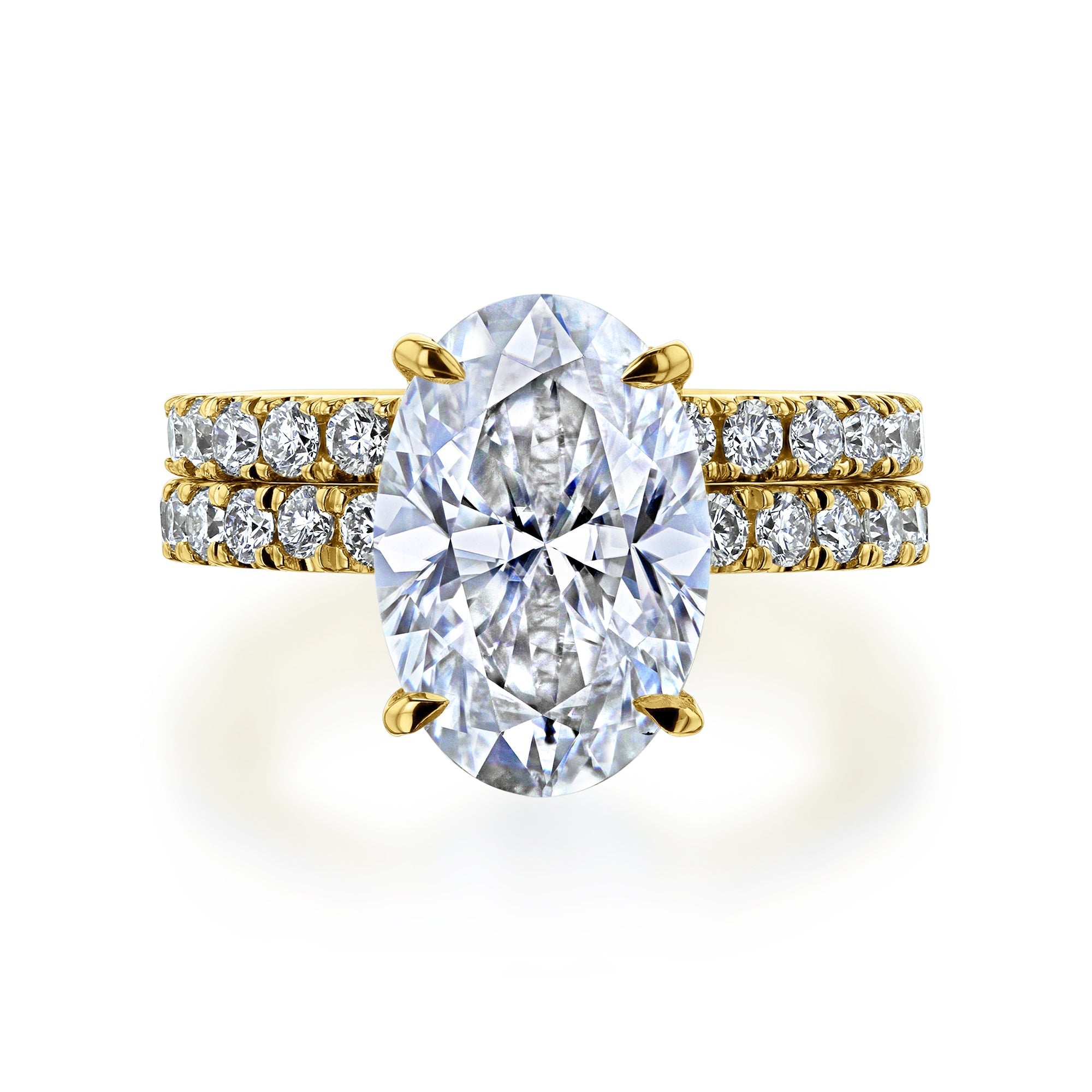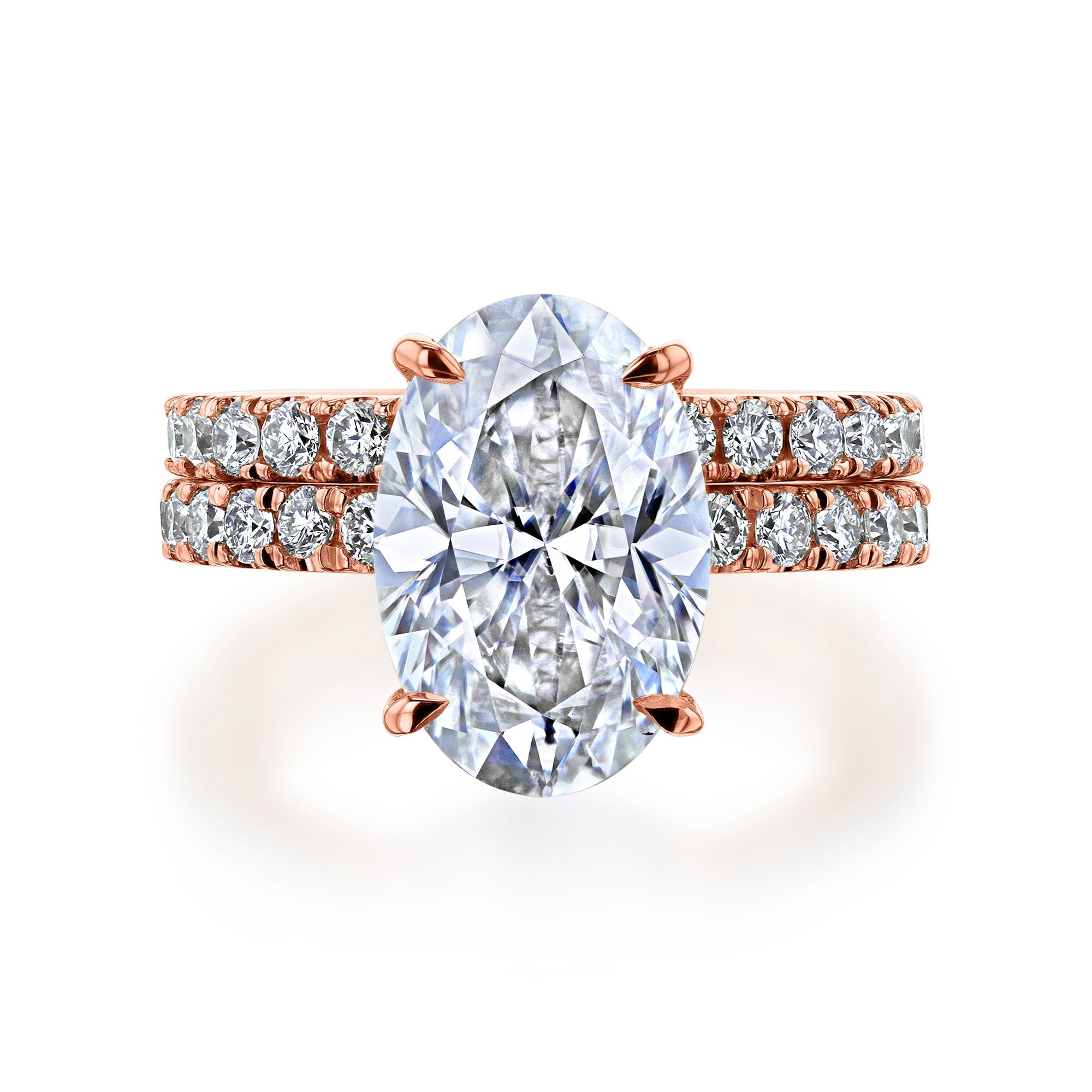 The Odette Bold Series Bridal Set features a 3.00* Carat Oval Diamond center stone with a hidden halo of additional lab-grown diamonds in a slim floating basket setting.