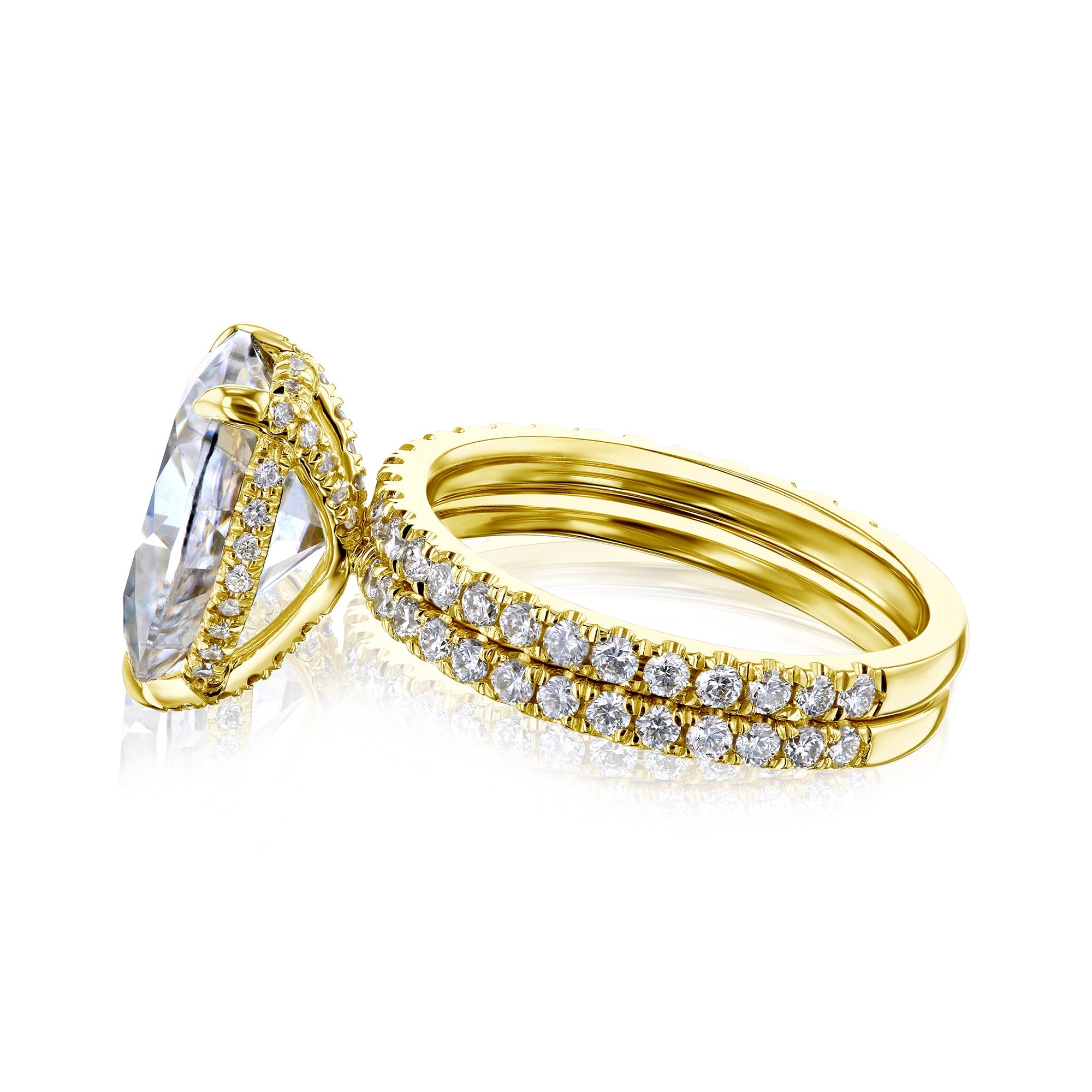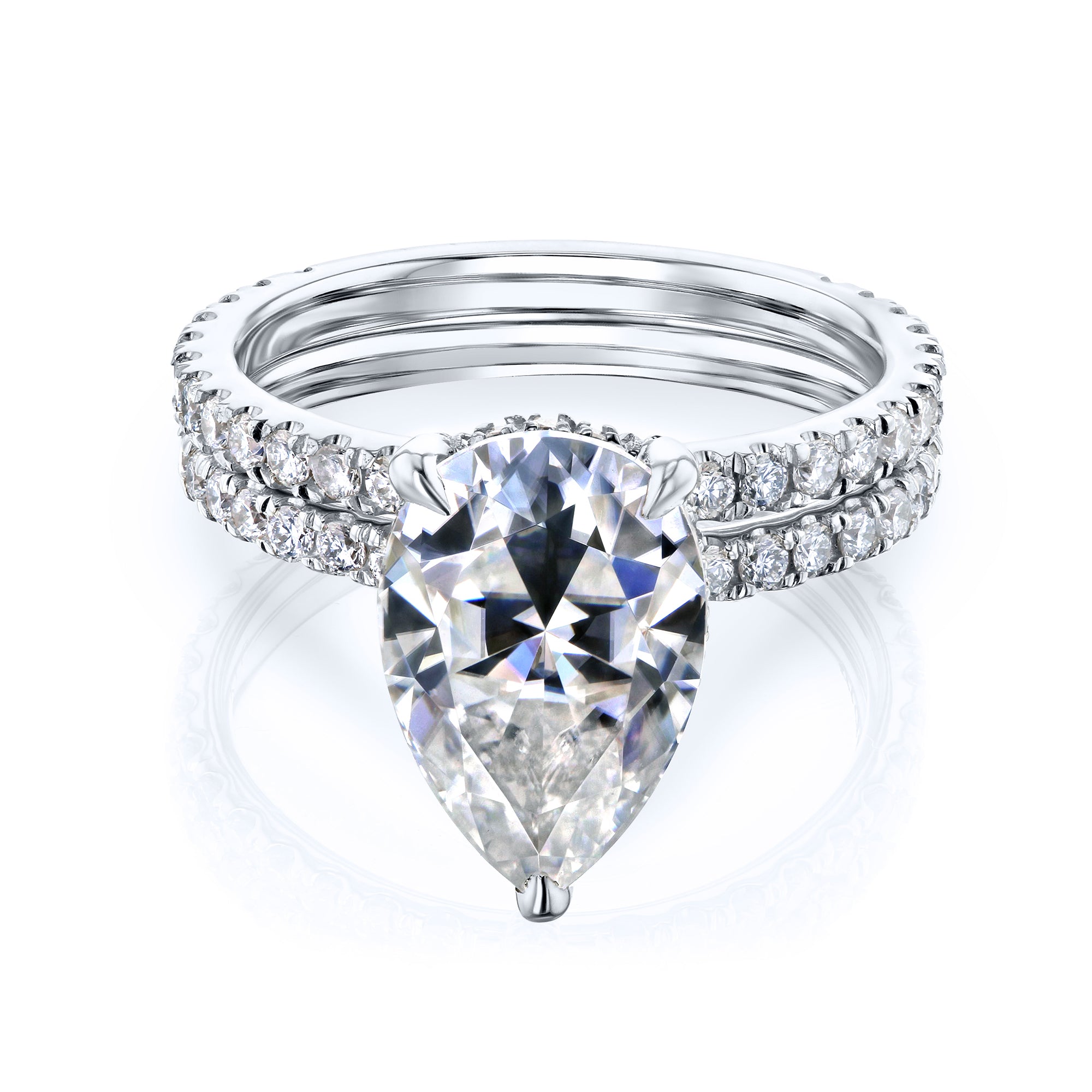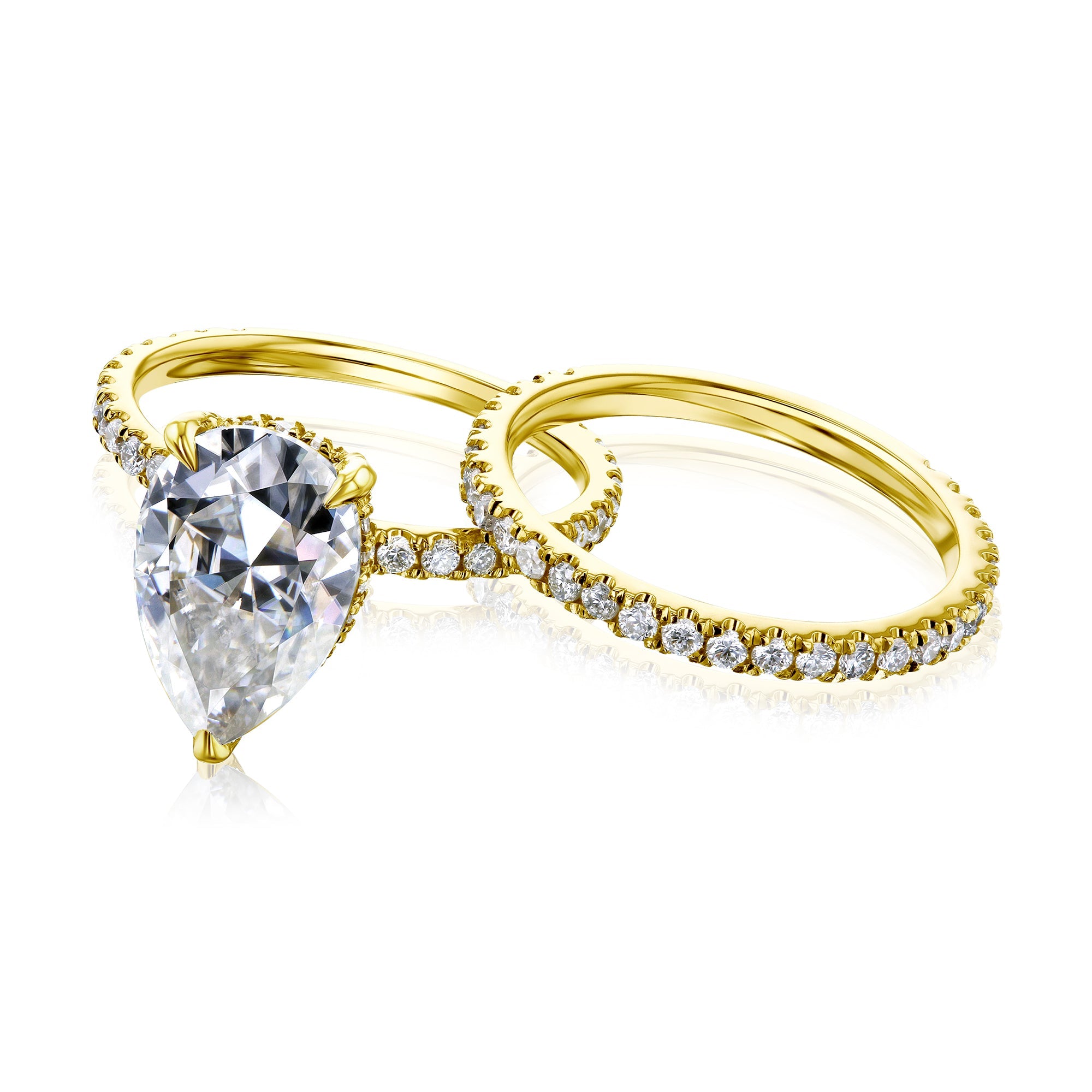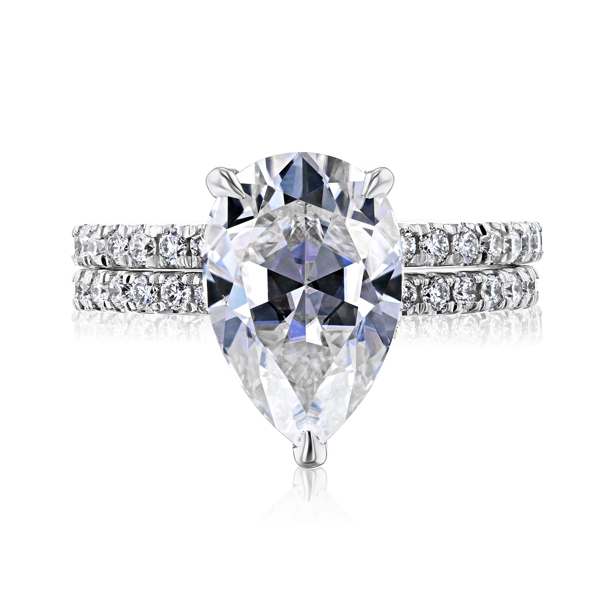 The Peri 12x8 bridal set features a 12x8 mm (3.5 carats diamond equivalent weight) pear moissanite center stone with a hidden halo of lab-grown diamonds in a slim basket setting. The basket and both bands are illuminated with pavé lab-grown diamonds in a semi-eternity fashion.