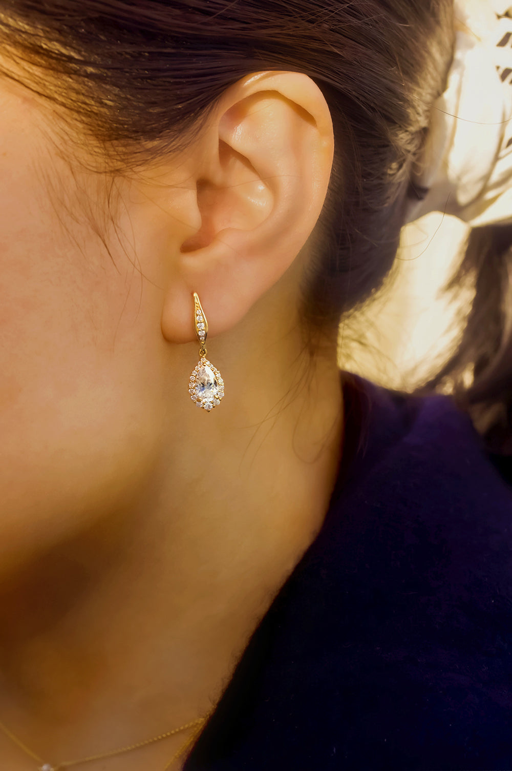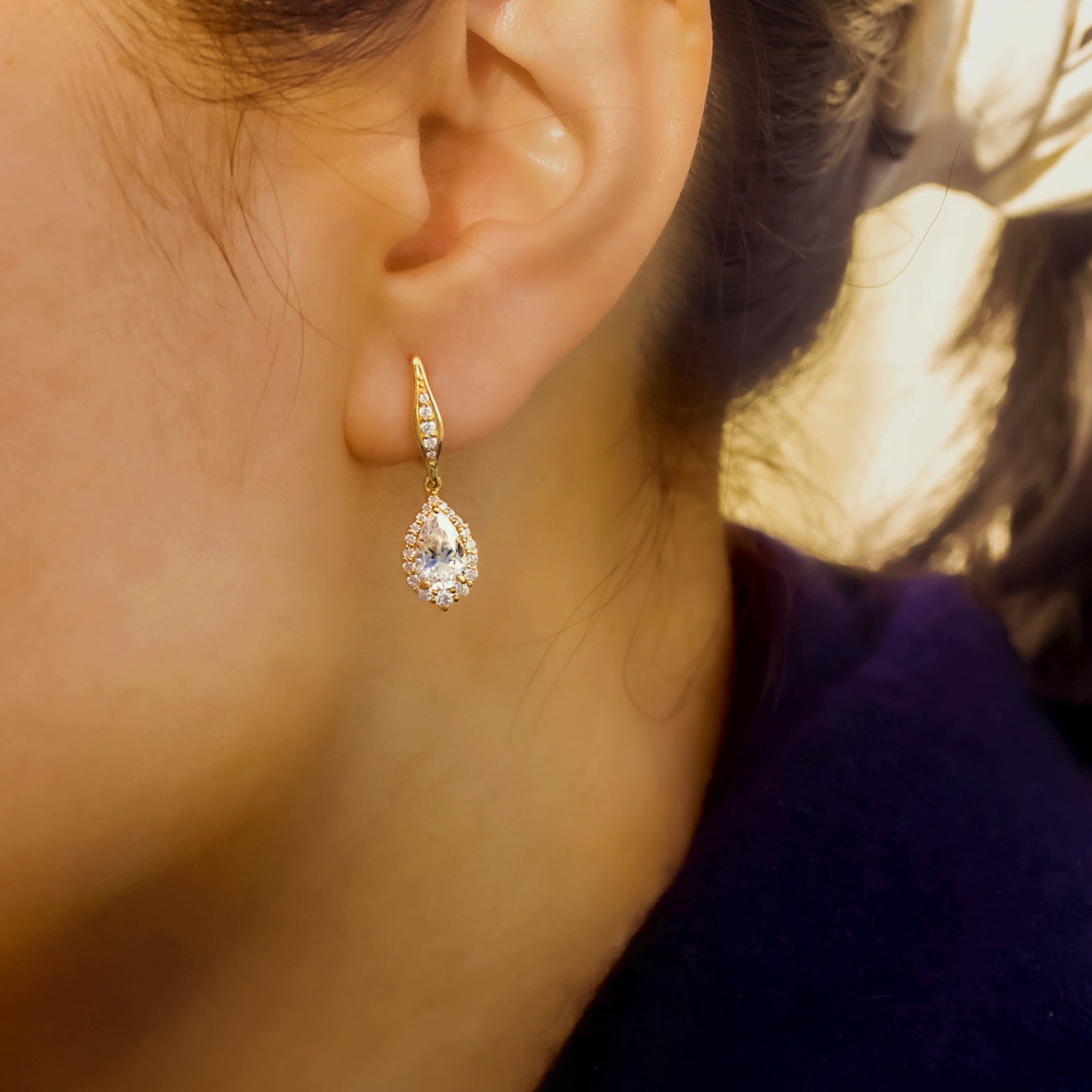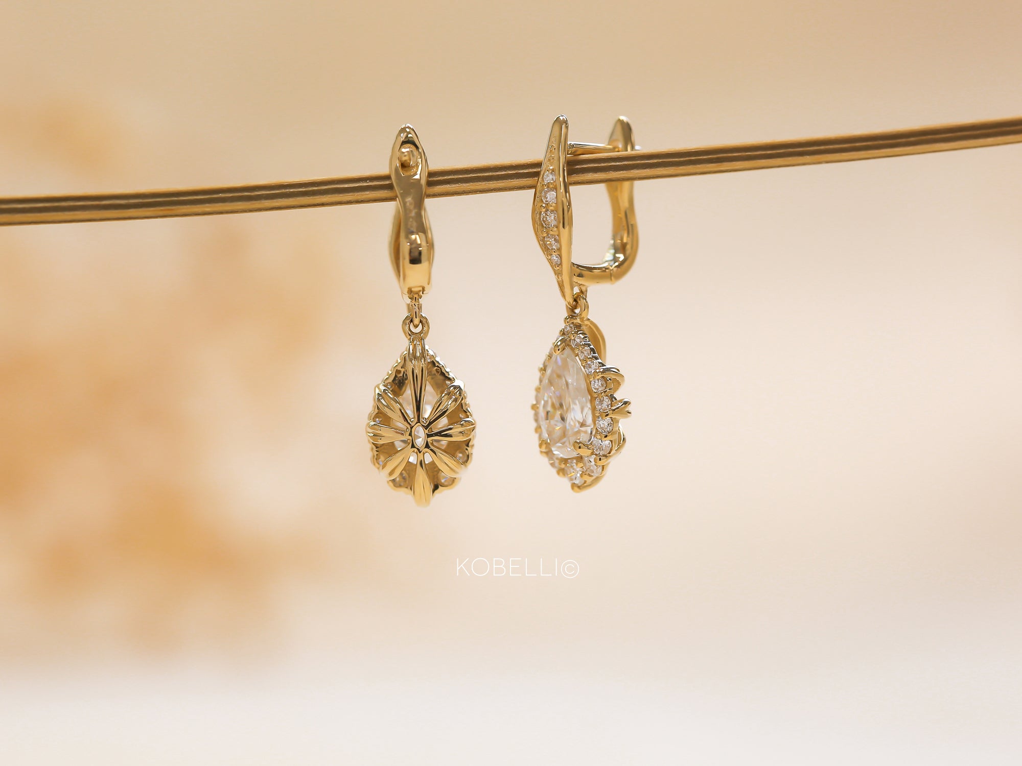 Our pair of Phoebe Earrings comes affixed to hook clasp backings with bright dangling pendants. A graduating halo comprised of genuine lab-grown white diamonds frames each of the beautiful 8x5 mm pear-cut moissanite center stones. The stones are set in 14-karat gold metal and are finished with a high polish. Diamond-lined spades decorate the clasps for a regal continuity leading directly to the hanging adornments. Caging arches of solid gold streamers bind the backside of the pendants in a simple yet antique fashion flare.