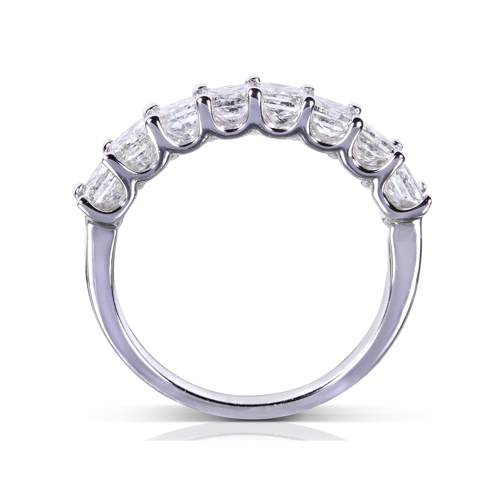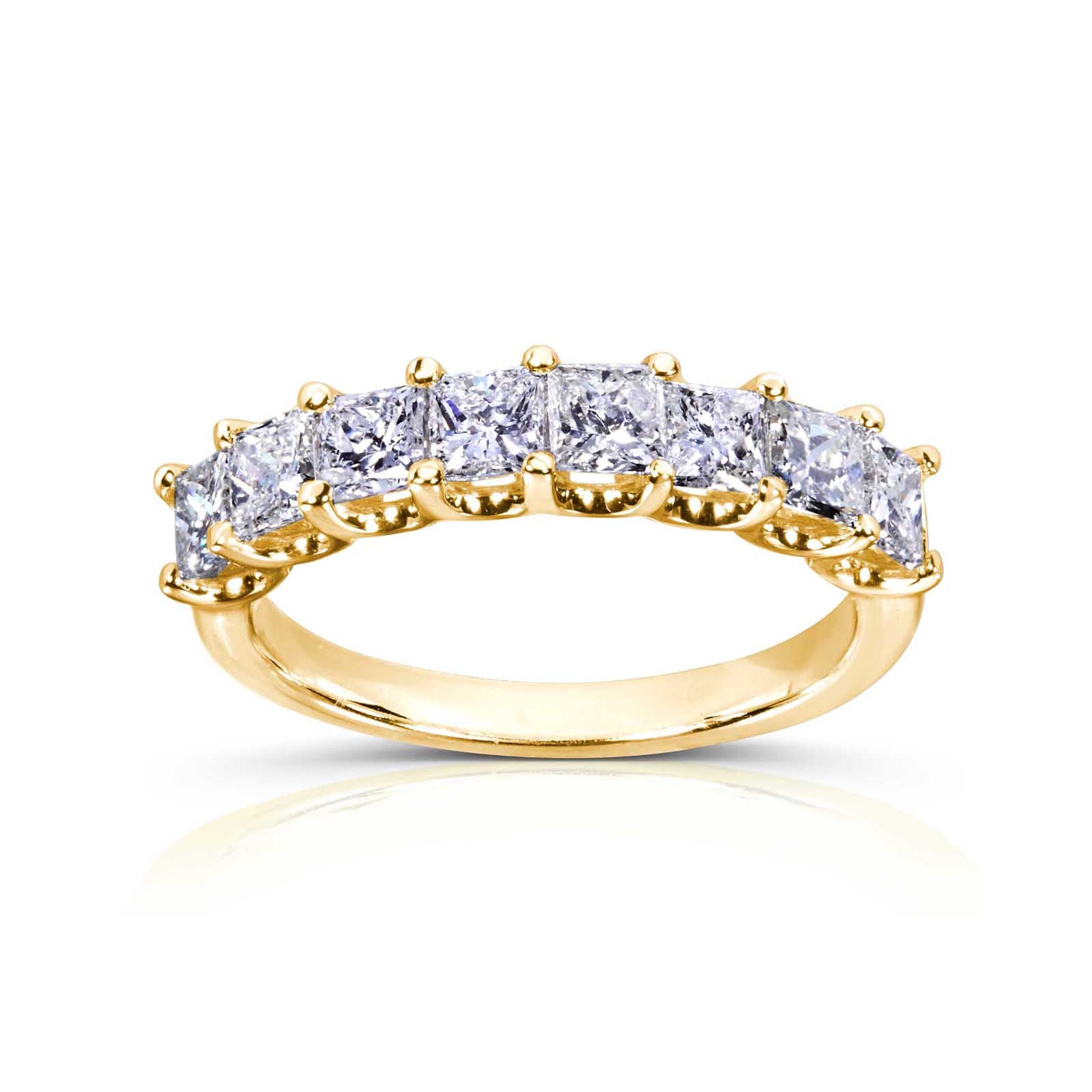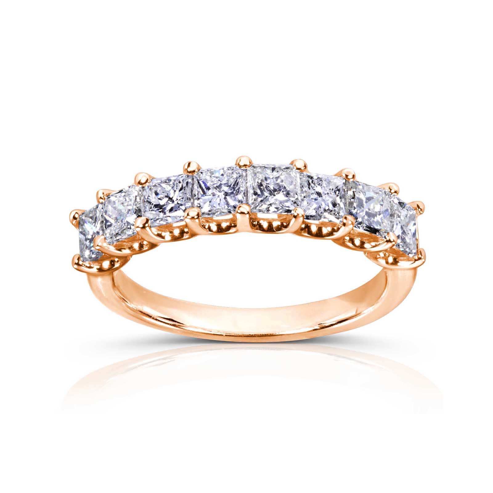 This princess diamond wedding band is a jewelry piece that knows your angles and your need for striking brilliance. For this ultimate reason, you have 8 lustrous princess diamonds to completely rely on and let them do the job for you. They are all dazzling from a futuristic shared prong setting. The ring is available in 14K white, yellow and rose gold.