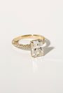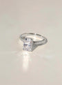 The Raya Diamond-Coated Ring features a gorgeous 3.25 carat moissanite center stone and approximately 0.95 carats in lab-grown side diamonds. The brilliant-cut elongated radiant center offers a captivating radiance that is fully complimented by the shimmering rows of diamonds sitting beside it.