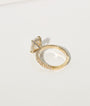 Completing the glimmering design, the center setting is held with a diamond basket and diamond hidden halo, for a full-on diamond decked mounting. The wrap-around hidden halo tucks just under the surface of the center moissanite allowing for light to hop right onto that center stone and bring out its overflowing fire.