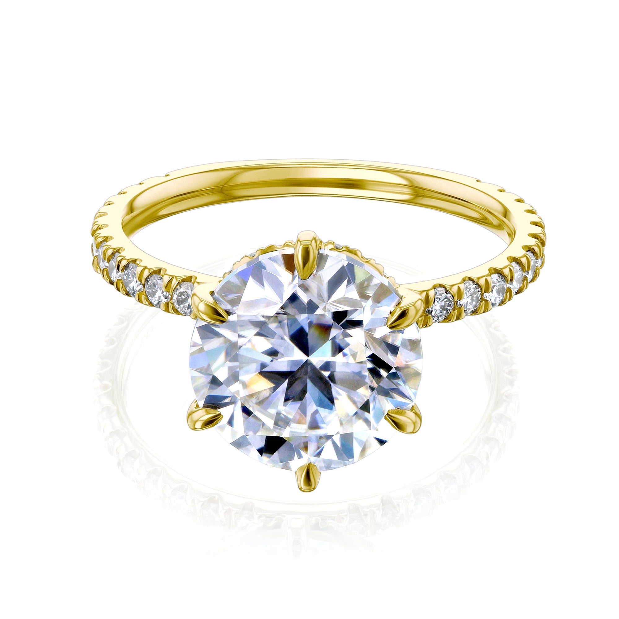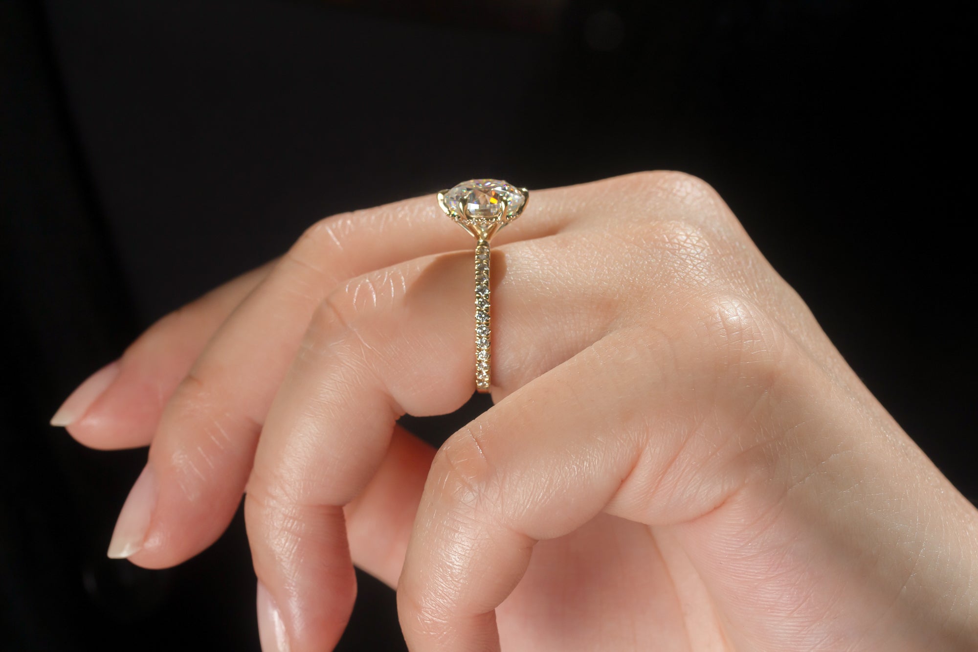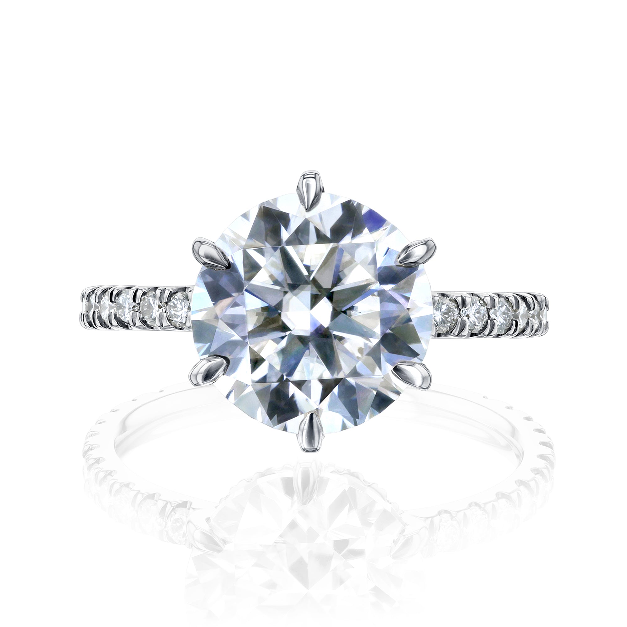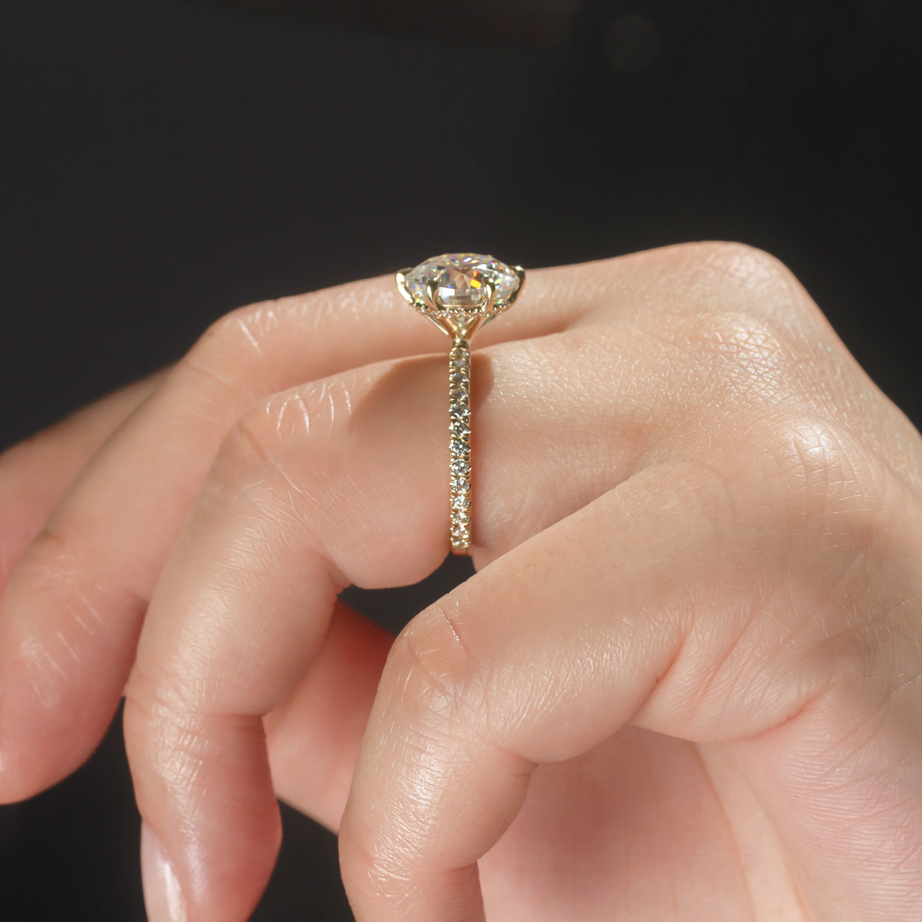 The Rowan 9.5mm Engagement Ring features a 3.1 carat (diamond equivalent weight) round moissanite center stone with a hidden eternity halo of lab-grown diamonds in a slim basket setting. The shank is illuminated with pavé lab-grown diamonds in a semi-eternity fashion.