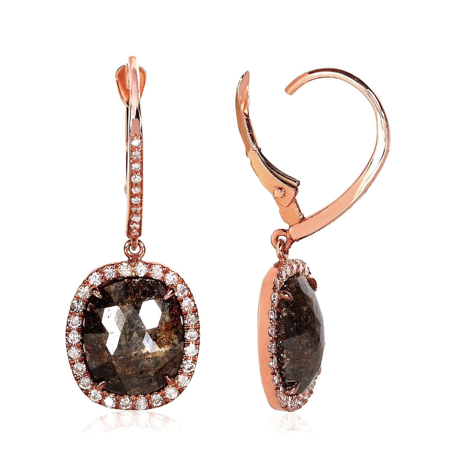 Rustic Opaque Brown & White Diamond Leverback Halo Earrings 5 4/5 CTW in 14k Rose Gold