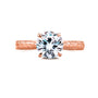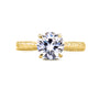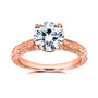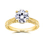 Gold etched engravings define this distinguished top selling antique engagement ring with masterclass craftsmanship. A cathedral setting carries to the top the generously sized round brilliant-cut moissanite. The engravings along the band are framed by milgrain edges for an extra pop of shimmer and dynamic textures. Two bezel-set hidden diamonds are embellished to either side of the profile for additional detailing. With the high polish finish on the 14-karat gold, this ring will shine with wonderment the moment you pop open the box.