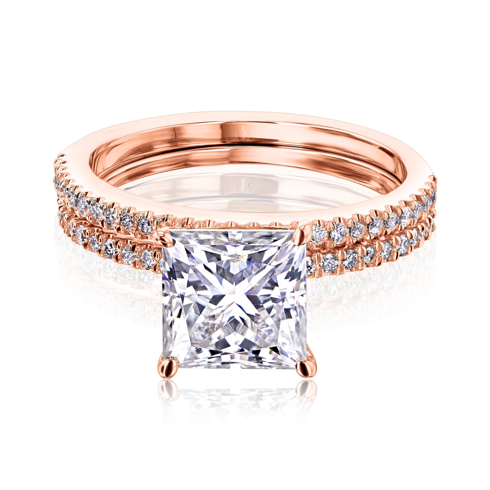 Weddings are a culmination of hard work and dedication to put love above all else and rings are tangible representations that last a lifetime. Our Princess Petite Bridal Set is a pair of 14K solid gold rings handcrafted in a micro-prong style carrying 49 round diamond side stones that enrich each shank in a semi-eternity fashion. This Kobelli bridal set showcases a petite princess-cut 1.8 carat moissanite center stone that is handcrafted in high detail and sophistication.