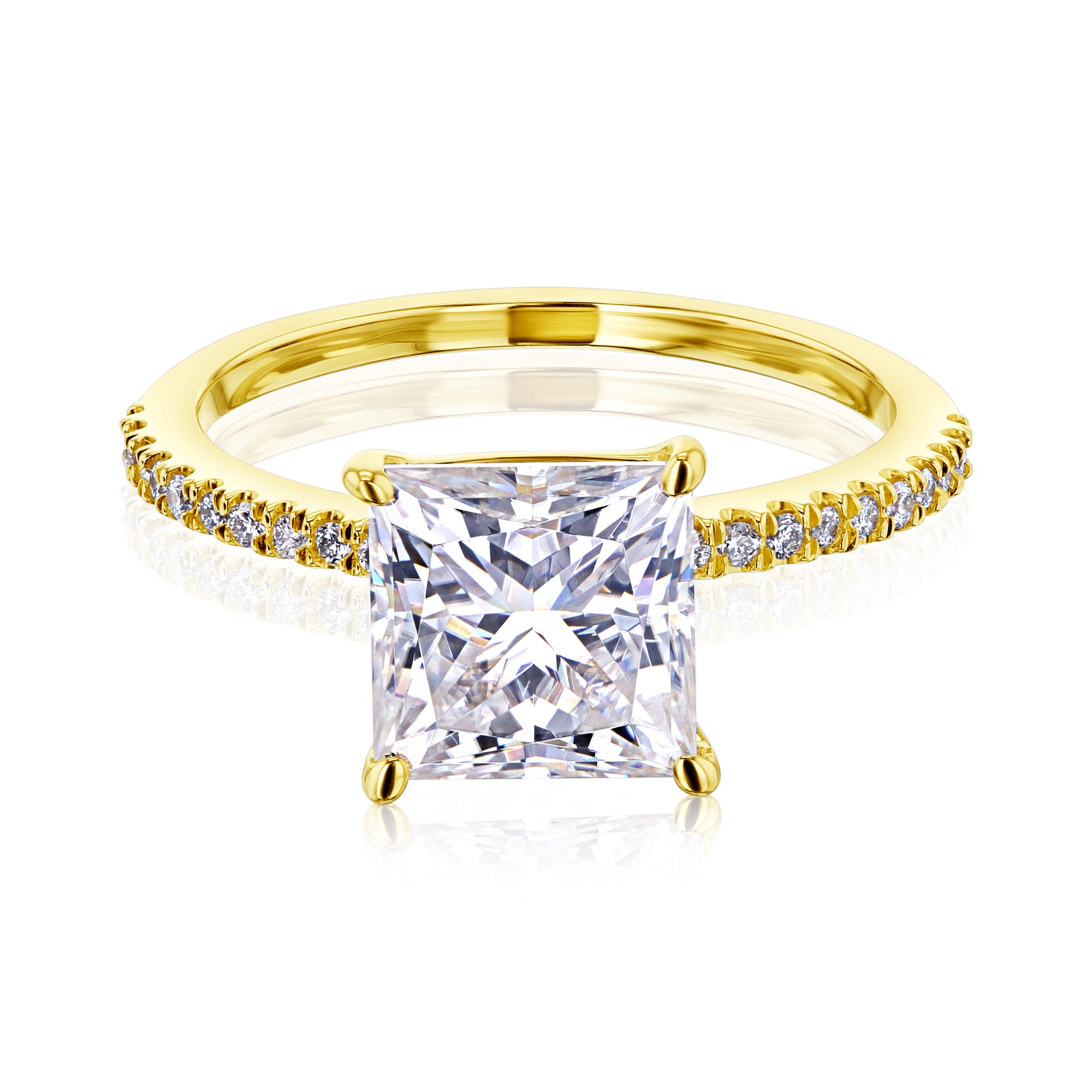 An engagement is a celebration of two people who came into a mutual decision to stay together for as long as they live. Our fashionable Princess Petite Engagement Ring is a simple ring, true to its form but can bring your commitment to a higher level. Its 1.8-carat moissanite princess-cut center stone sits in a 4-prong basket setting accompanied by 22 round diamonds that grace half the shank and delicately encrusted in its 14K solid gold body. This adorable ring has a high amount of brilliance that can out sparkle standard engagement rings.