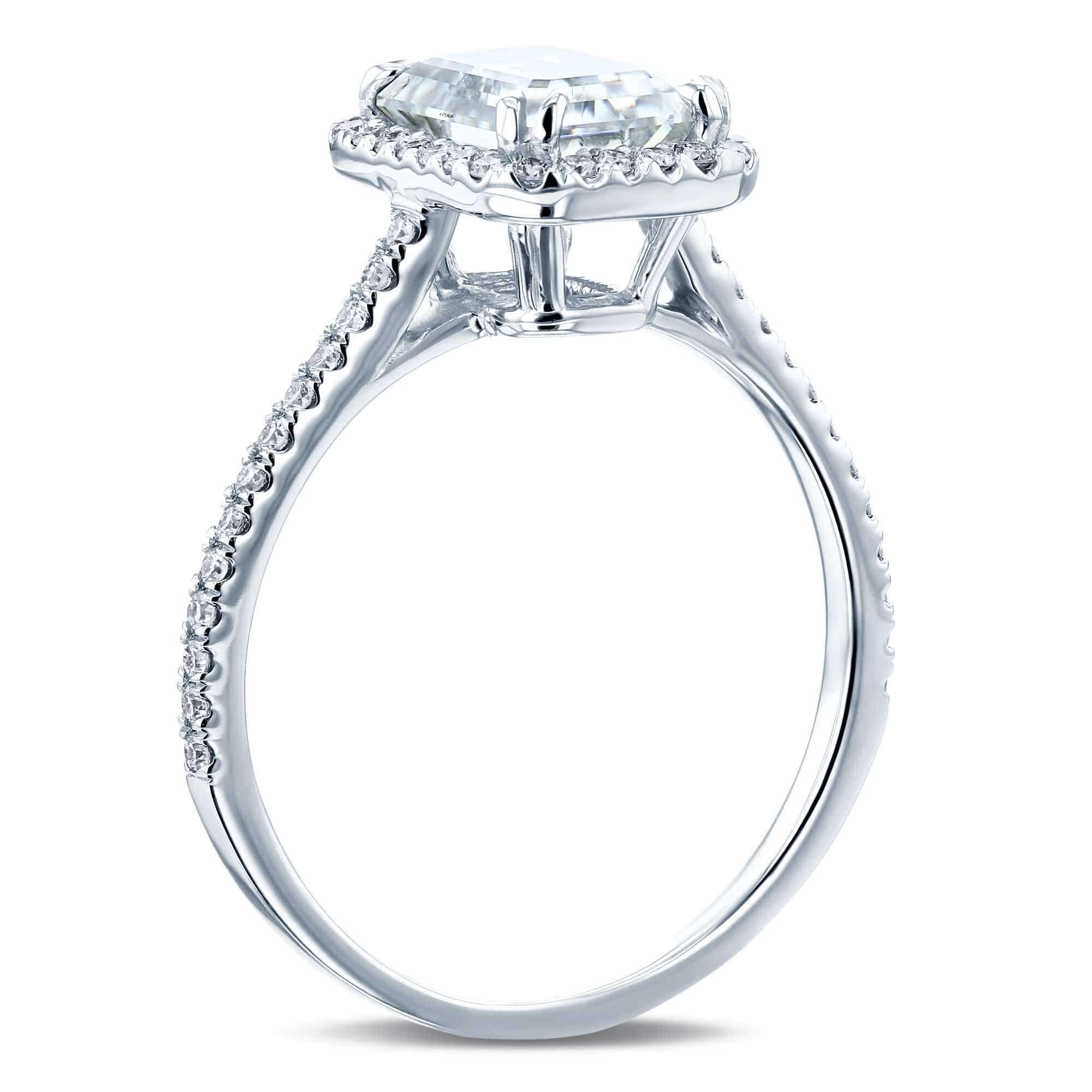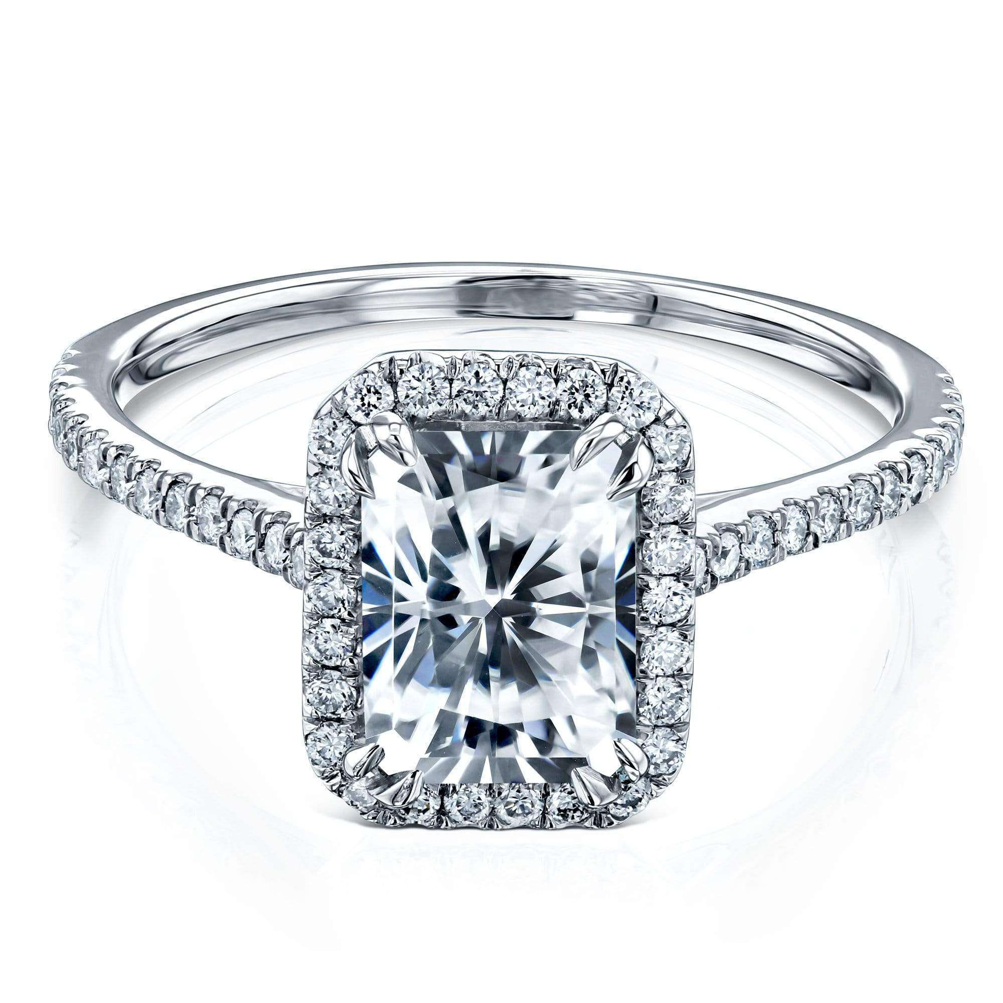 A slender 1.5mm diamond-lined band contrasts your halo center setting with an radiant-cut moissanite at the very center.