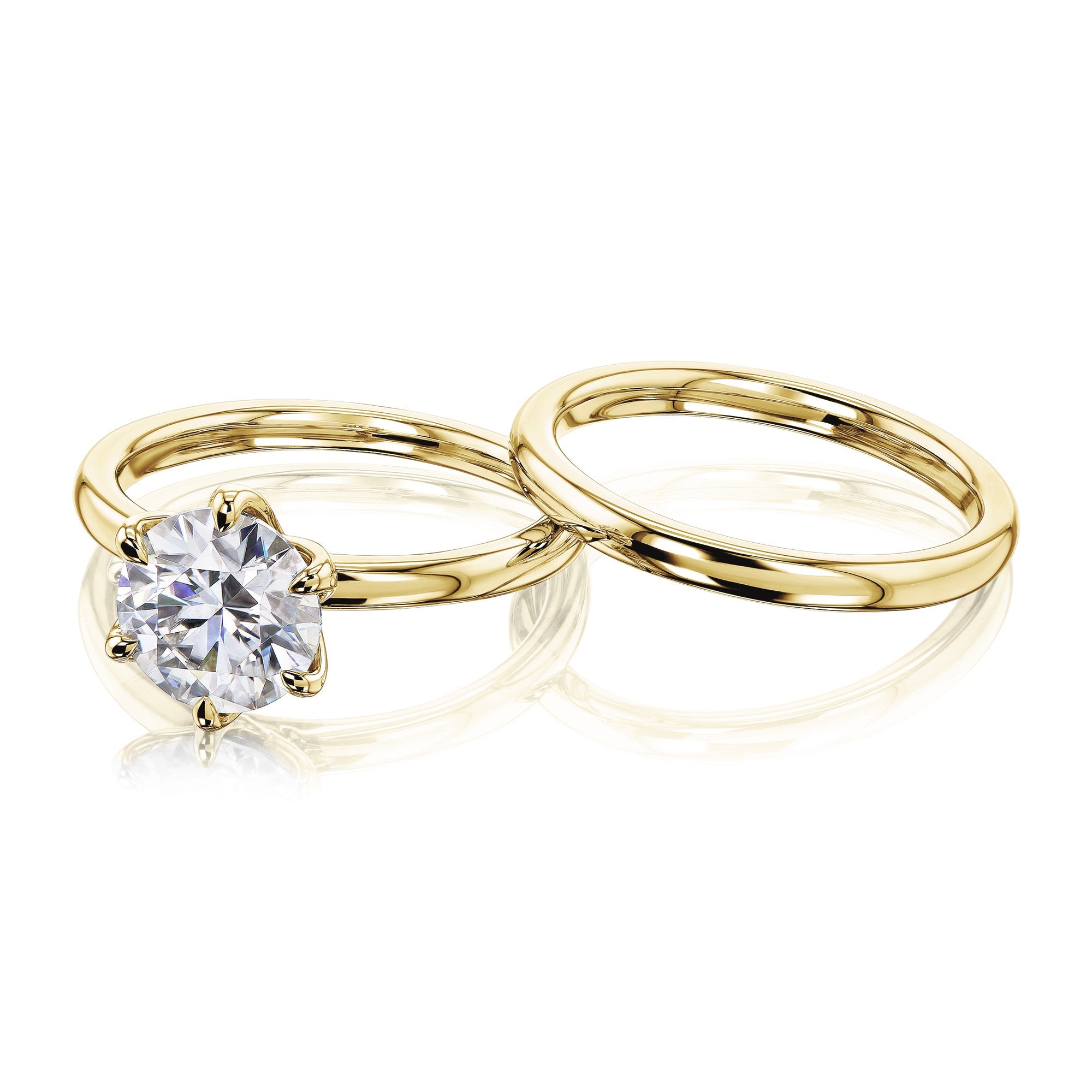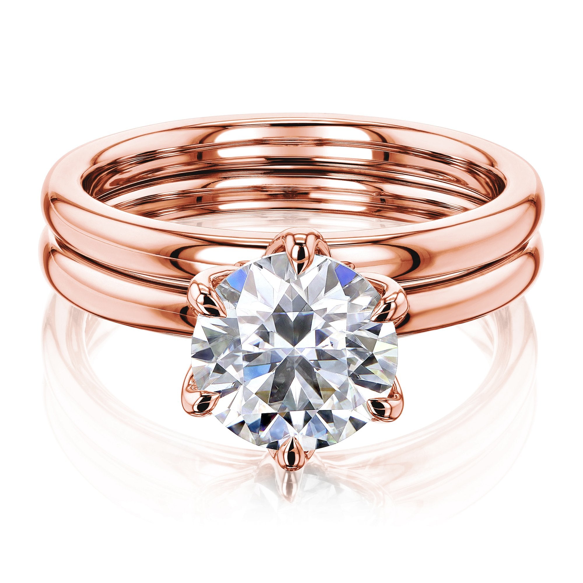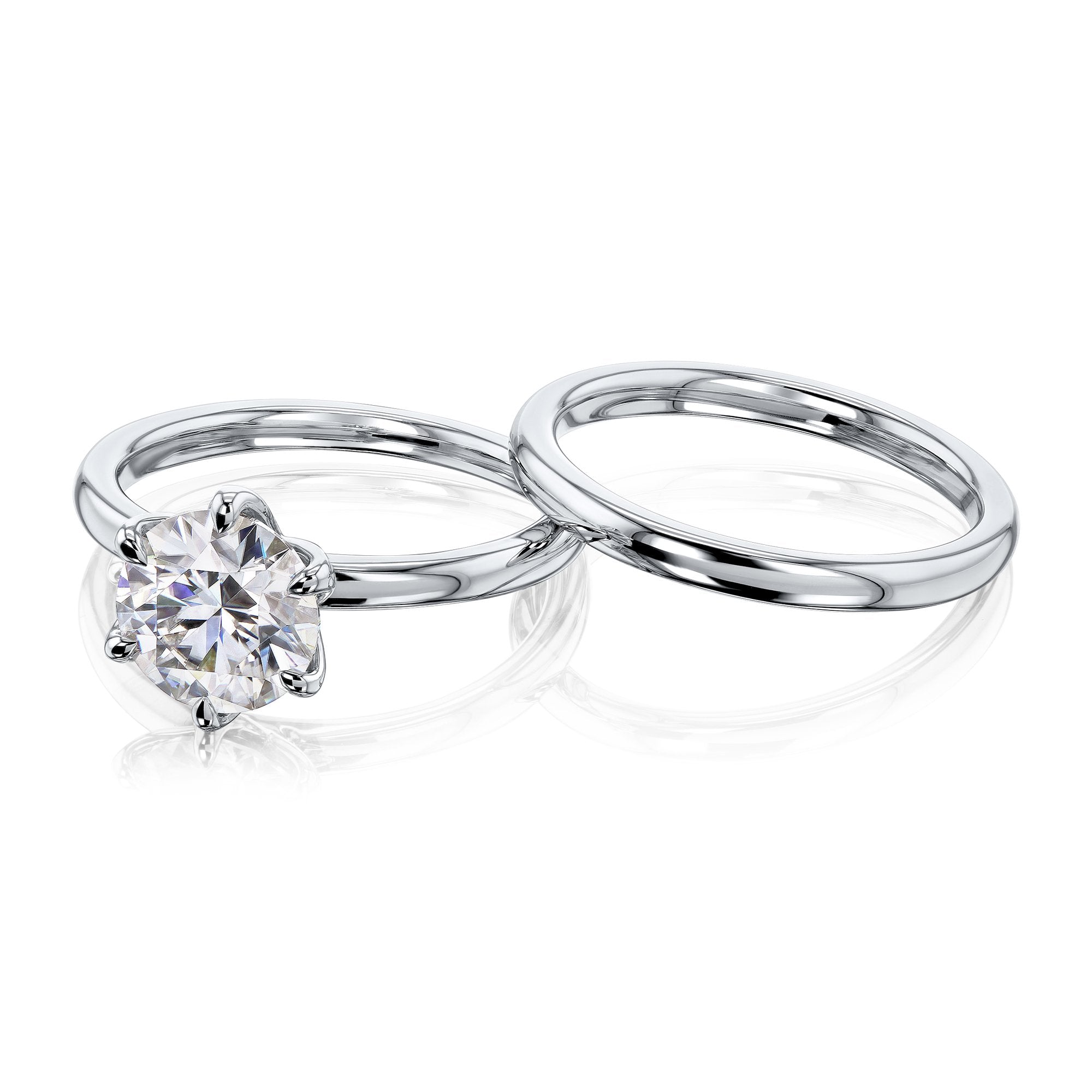• Design Features: Comfort Fit (Smooth Rounded Band), Floating Setting, Taper Shank, Solitaire Style, 2-Piece Set