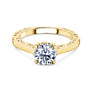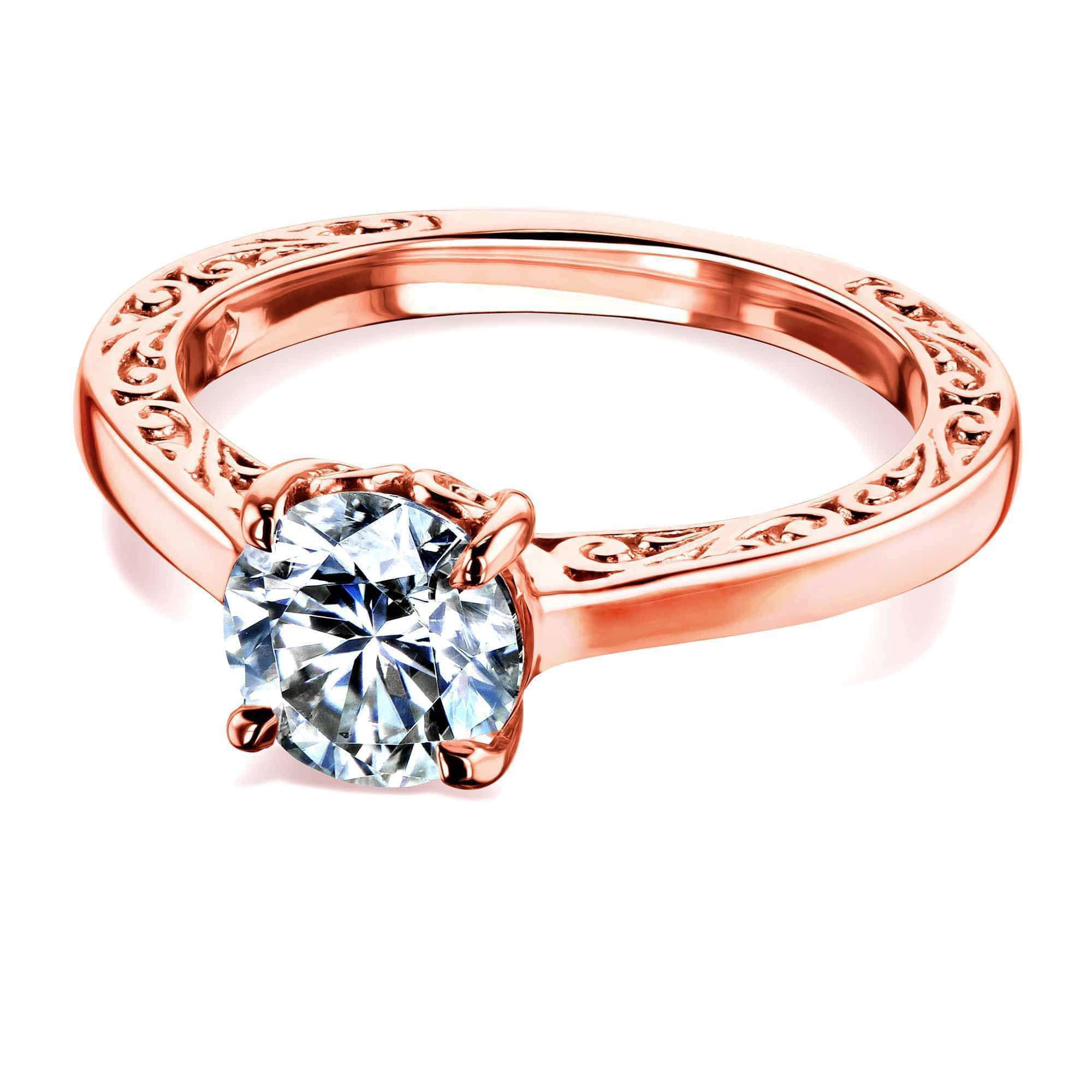 Filigree engravings carry a one carat moissanite gemstone to the top of this engagement ring in solid 14-karat gold.