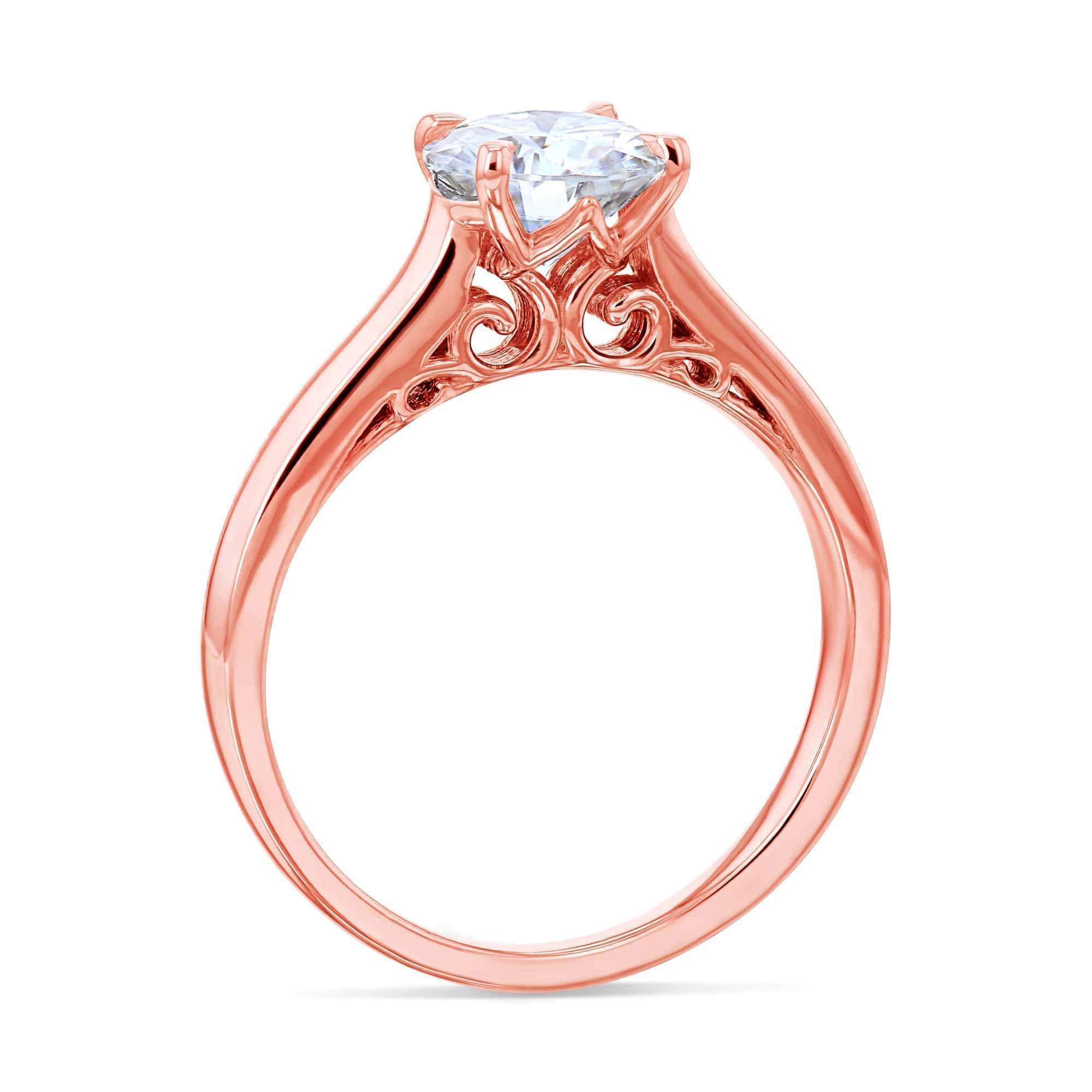 Our 1ct round solitaire commemorates classic charm with a subtle twist. Seen from the profile view, swirling arches lead towards the w-shaped prong setting lifting your 6.5 millimeter gemstone. The sleeve of the ring is fully solid (as opposed to having a hollowed gallery as some rings do). This feature offers a more comfortable grip and exhibits quality craftsmanship.