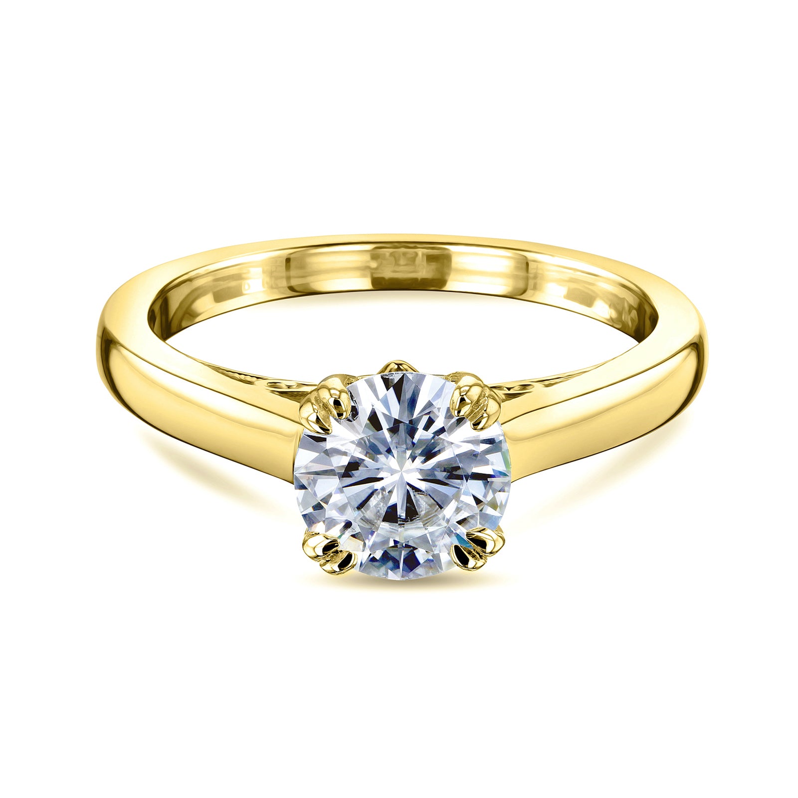 The bridge hoists the 6.5mm round moissanite in solid 14-karat gold. Four double prongs secure the stone in place with a W-shaped profile where the head joins on both sides of the engagement ring.