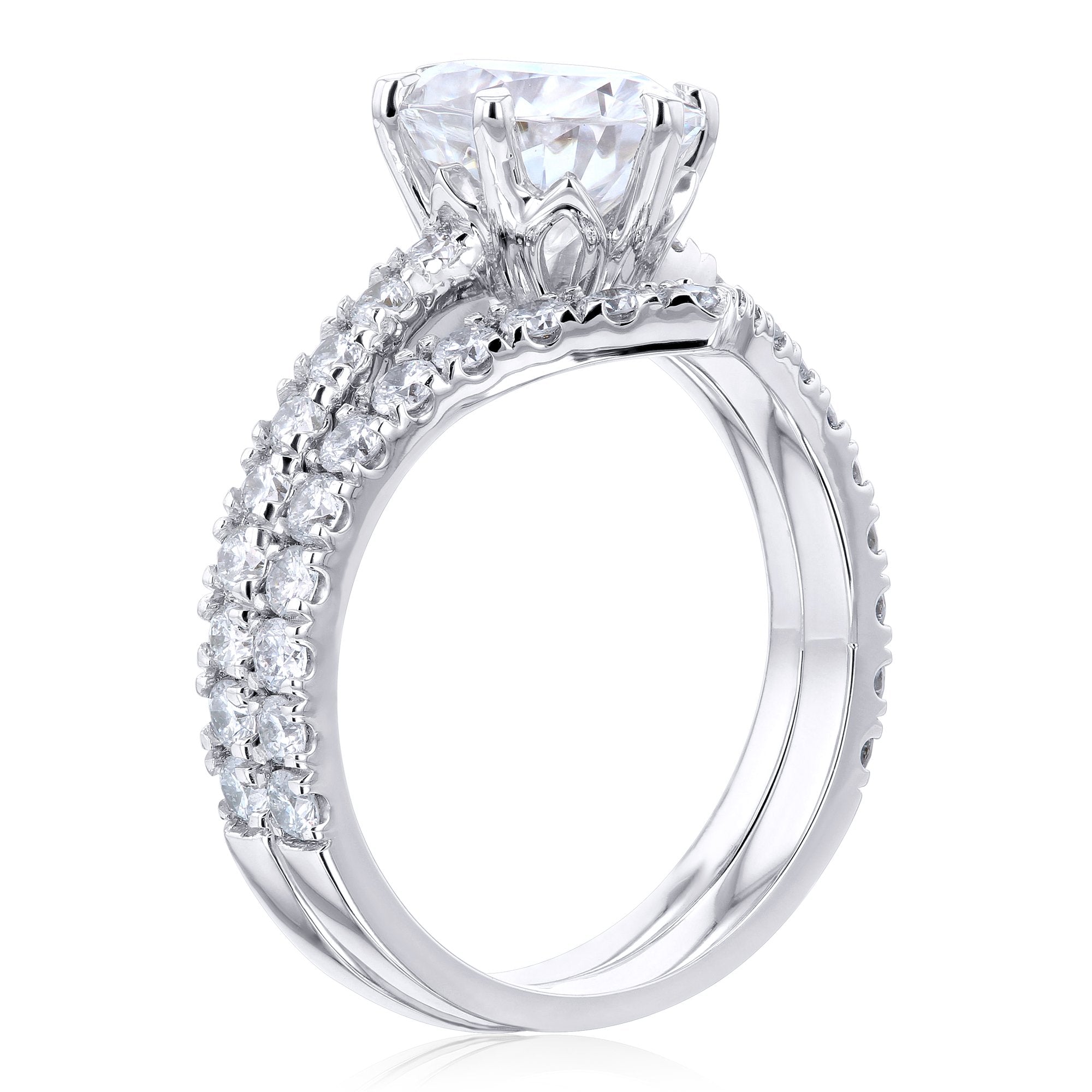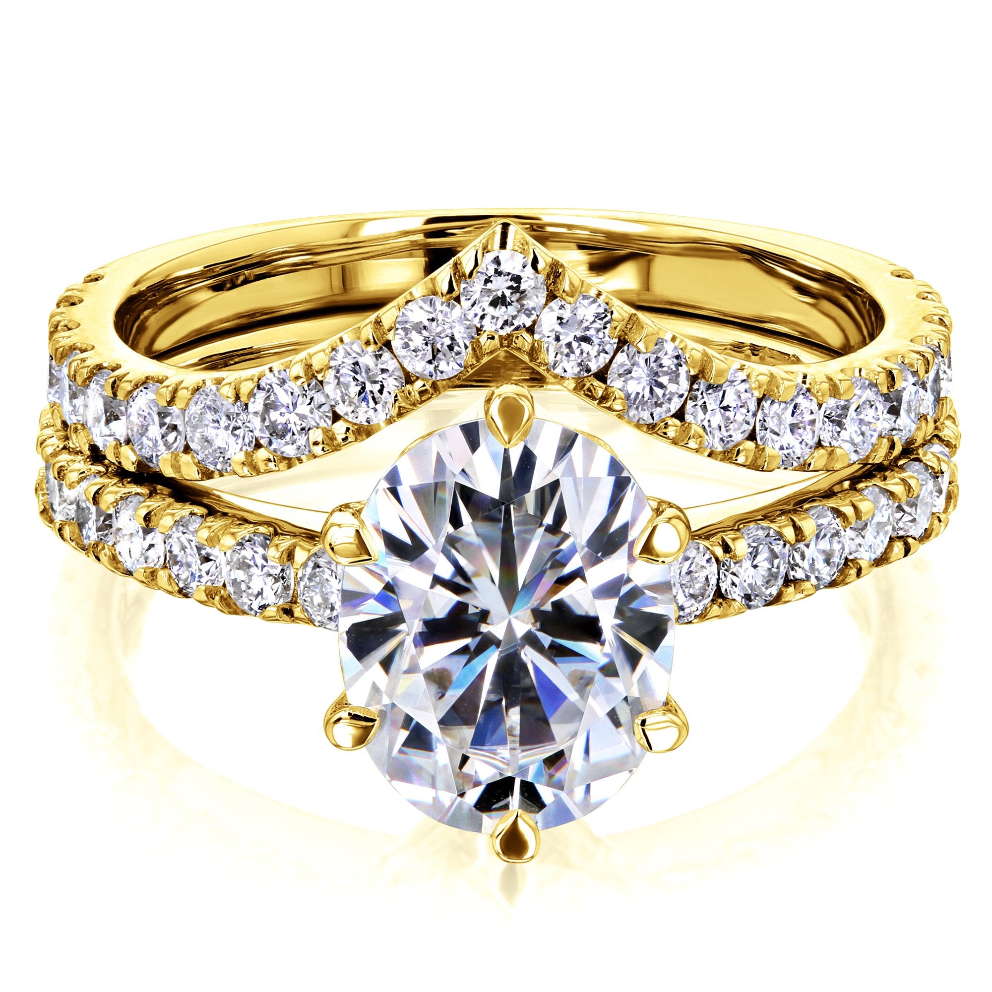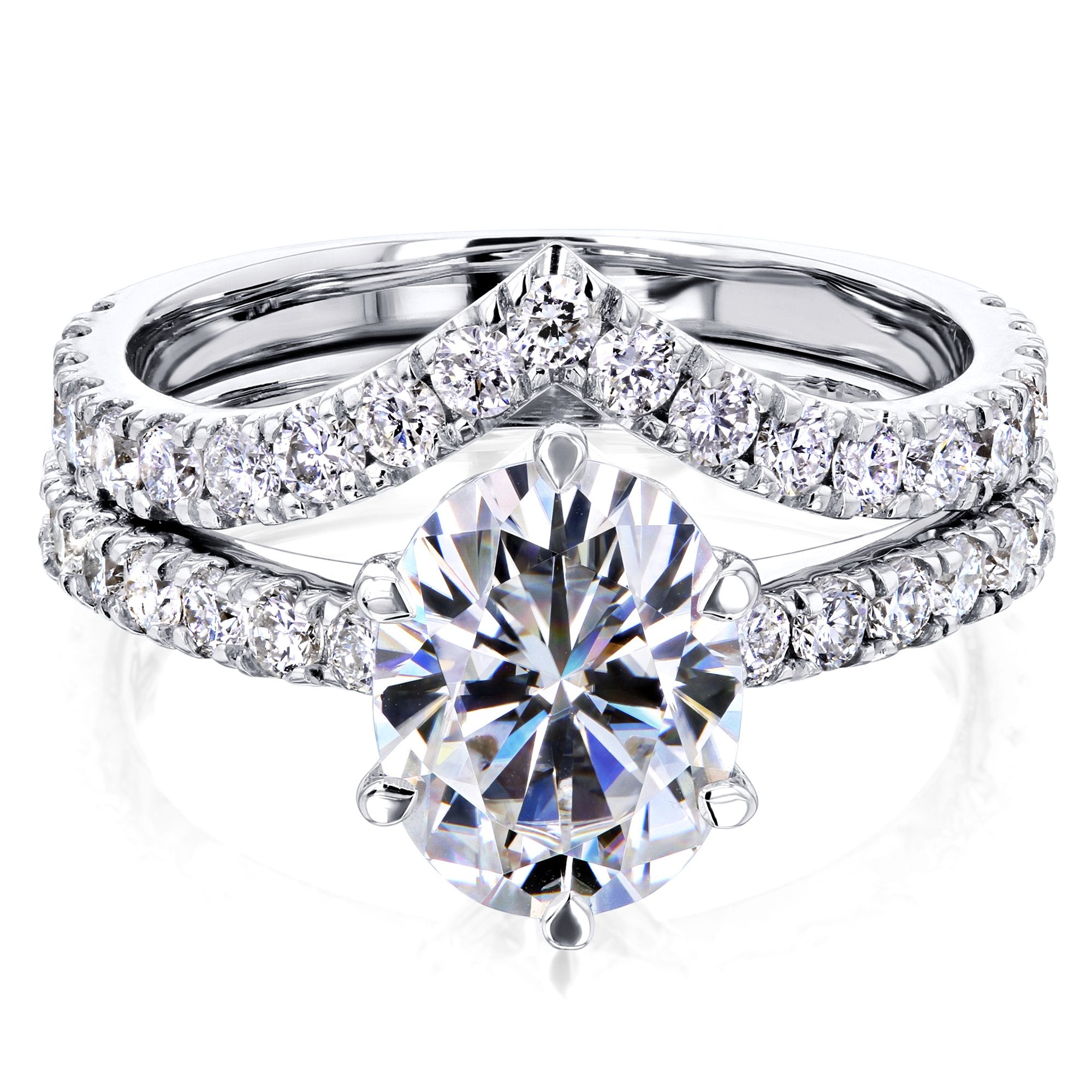 A 2.10 carat oval shaped moissanite tops this diamond band in solid 14-karat gold. Six prongs grip your center stone ensuring that beautiful big rock is going nowhere. A crescent-v chevron diamond band matches to the engagement ring in composition as it accentuates the elongated center shape for a traditional beauty with a fashionable twist. Natural white diamonds decorate both bands of this wedding set (1 carat total).