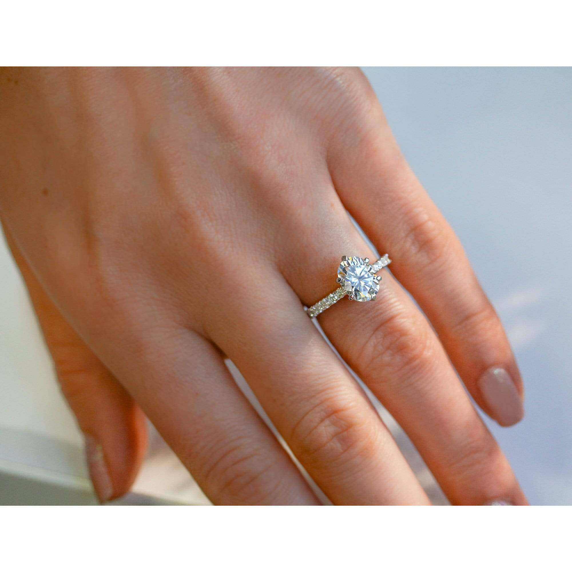 A 2.10 carat oval shaped moissanite tops this diamond band in solid 14-karat gold. Six prongs grip your center stone ensuring that beautiful big rock is going nowhere. All smaller stones on this engagement ring are natural grown white diamonds mined from Earth's finest sources (1/2 carat total). The conflict-free diamonds pair to the moissanite center stone in synchronized harmony.