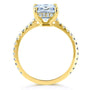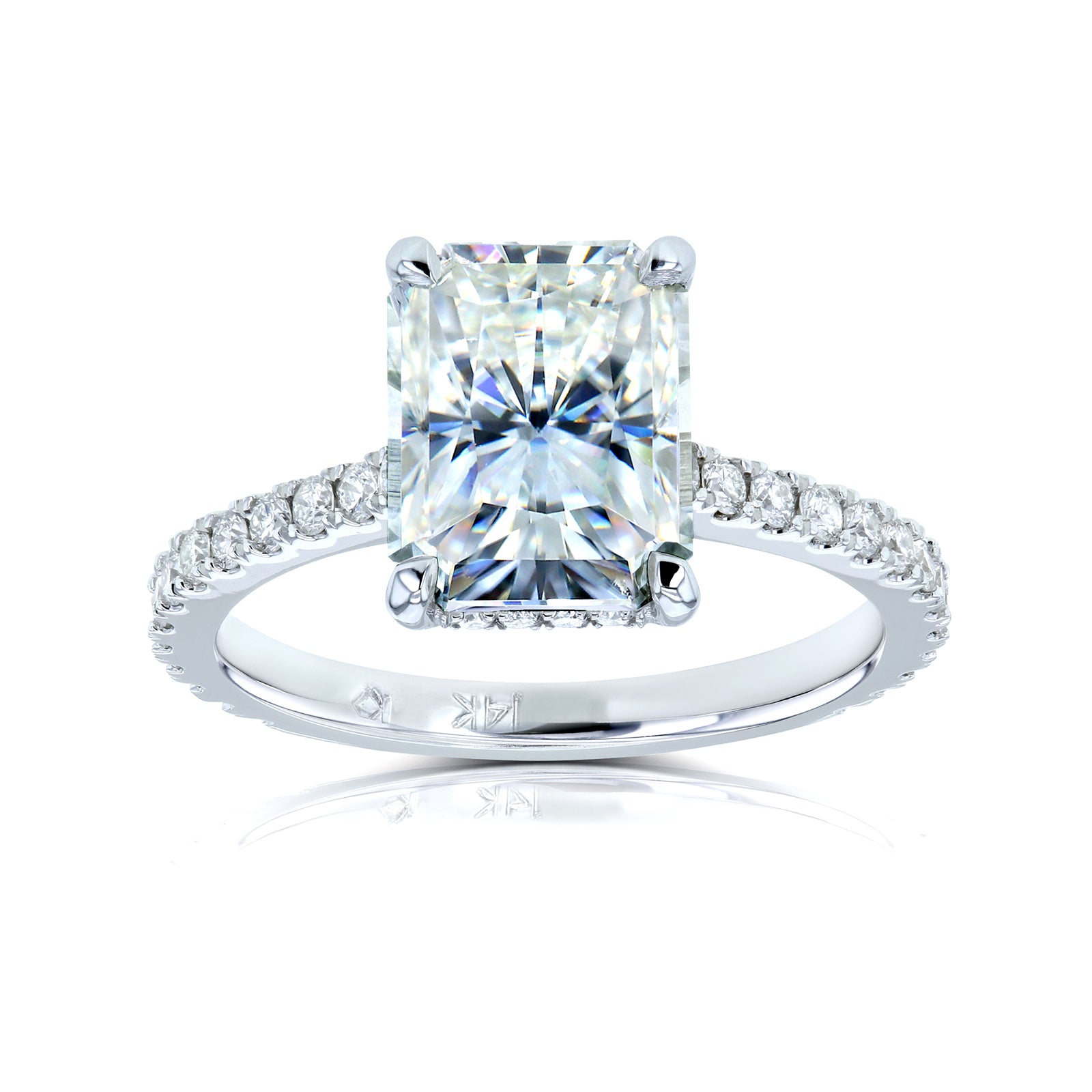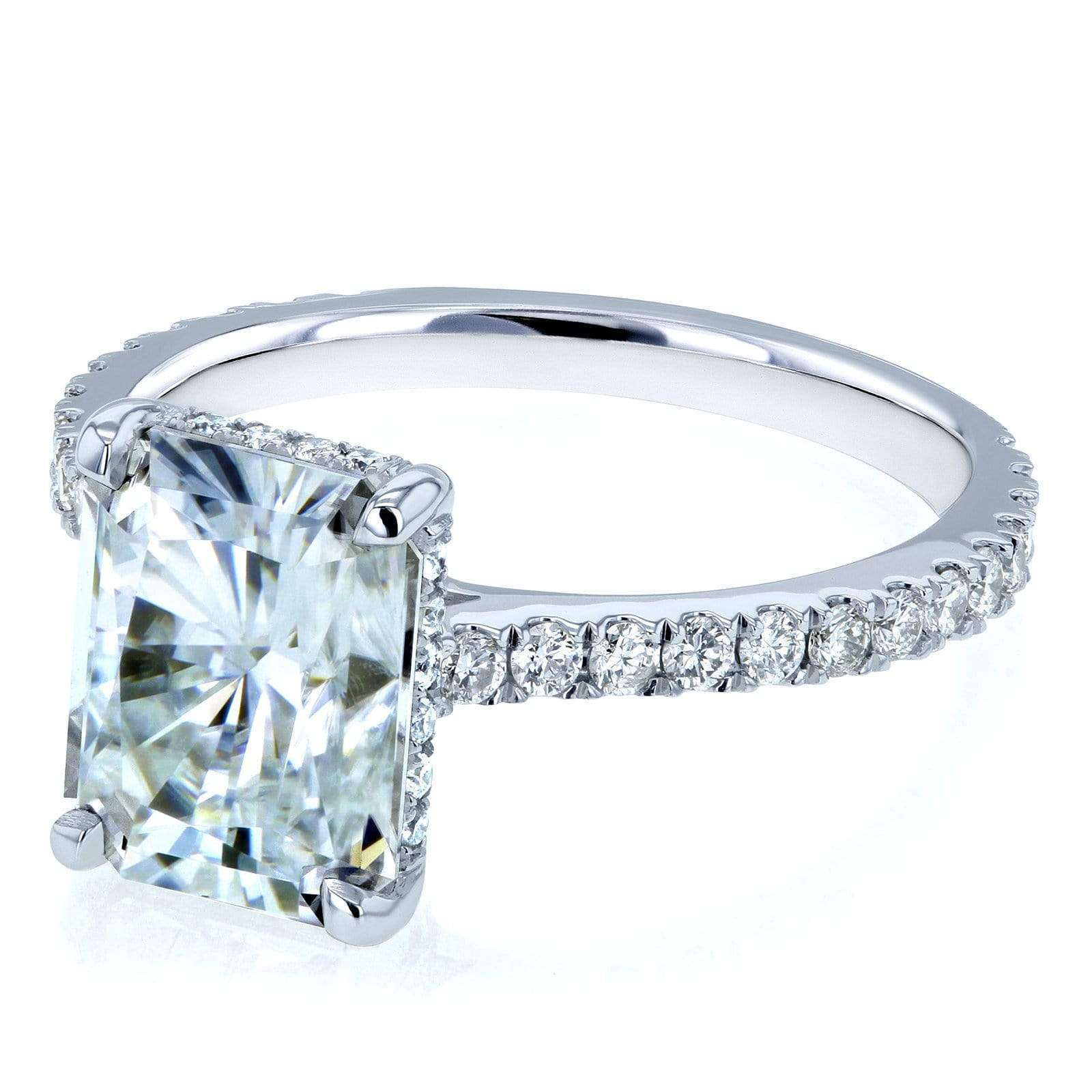 Proudly flaunt your wifey status with this crowd-pleasing engagement ring that sparkles in all the right places. A large 9x7mm radiant-cut moissanite is carried to the top of this diamond-lined engagement ring. Mixing the lab-created center stone with the earth-mined side stones makes for ideal use of both these stone types. The moissanite is best displayed in large sizes to showcase its well-known trait of brilliance and fire. The diamonds string together for a glittering visual to enhance the ring in both beauty and luxurious rarity. The stones are set into 14-karat gold which is finished with a high polish to offer the ideal shine of wedding jewelry.