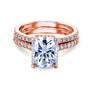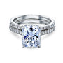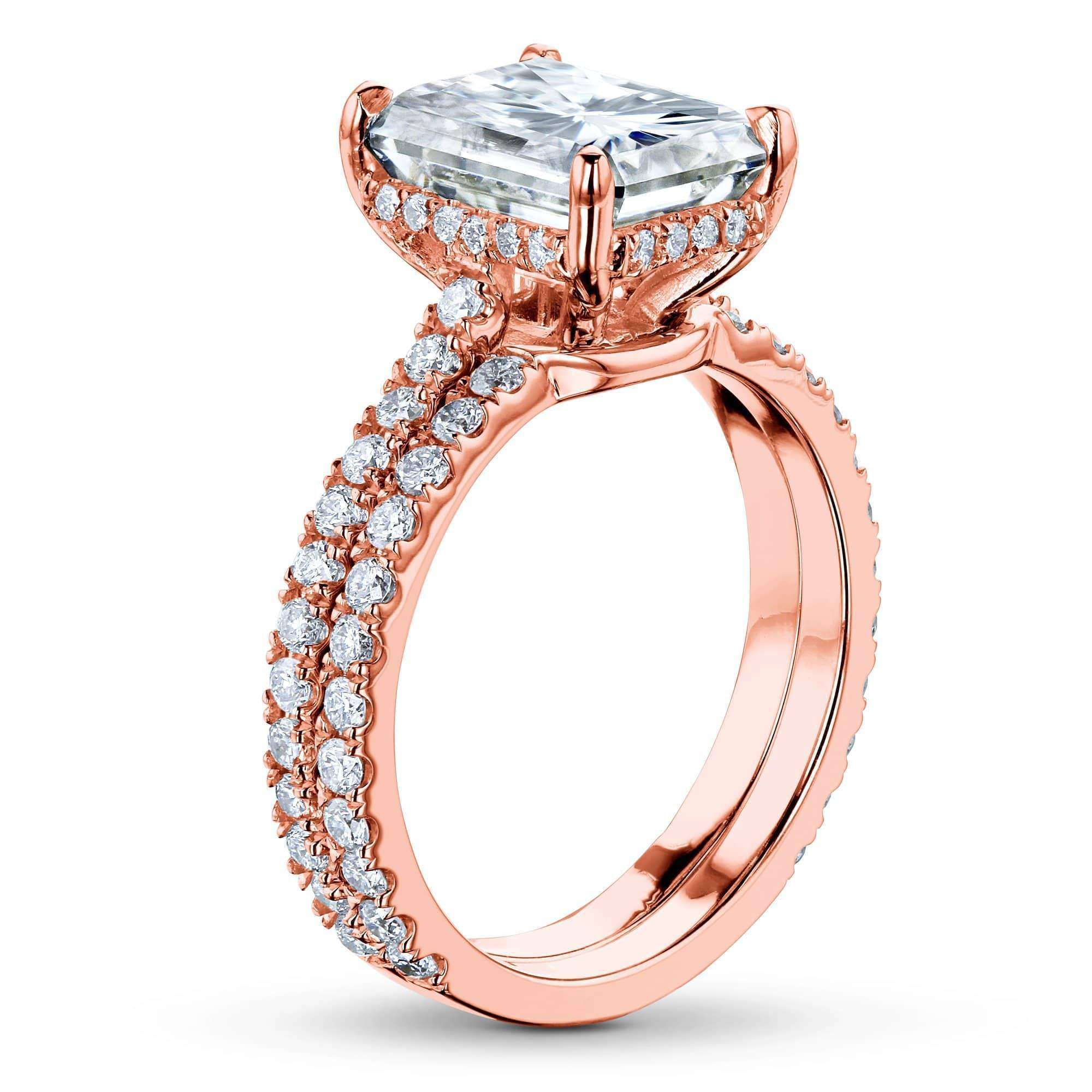 A drop halo carries a 9x7mm (2-3/4ct) radiant cut moissanite gemstone over this 2 piece bridal set in 14-karat gold.