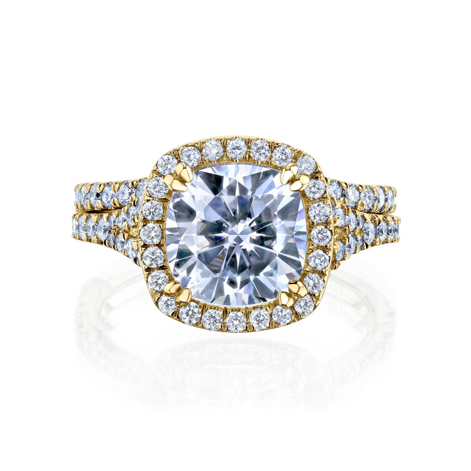 3-3/4ct.tw Cushion Moissanite and Lab Grown Diamond Halo Split Shank Cathedral 2-Piece Bridal Set in 14k Gold