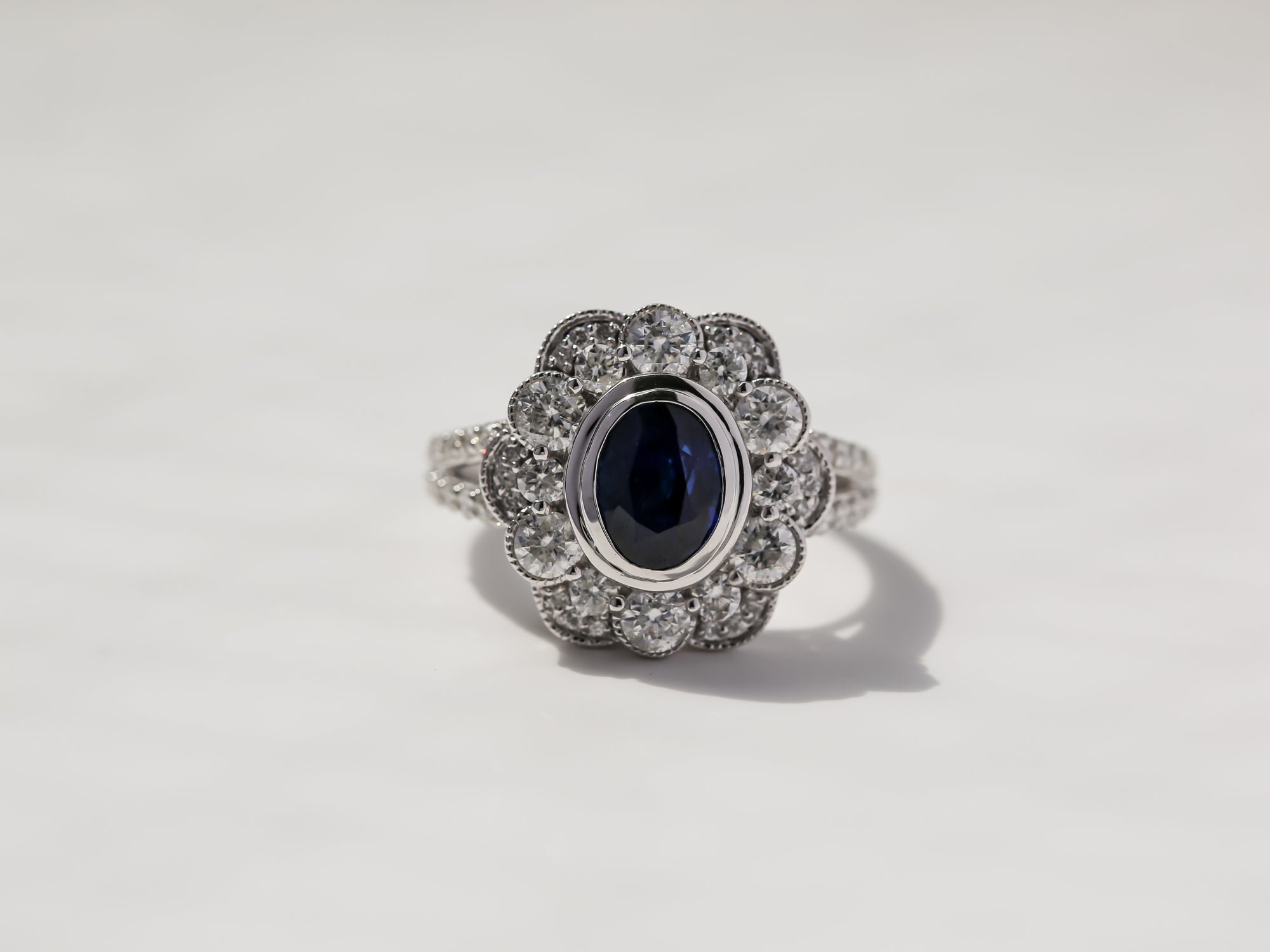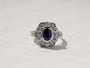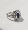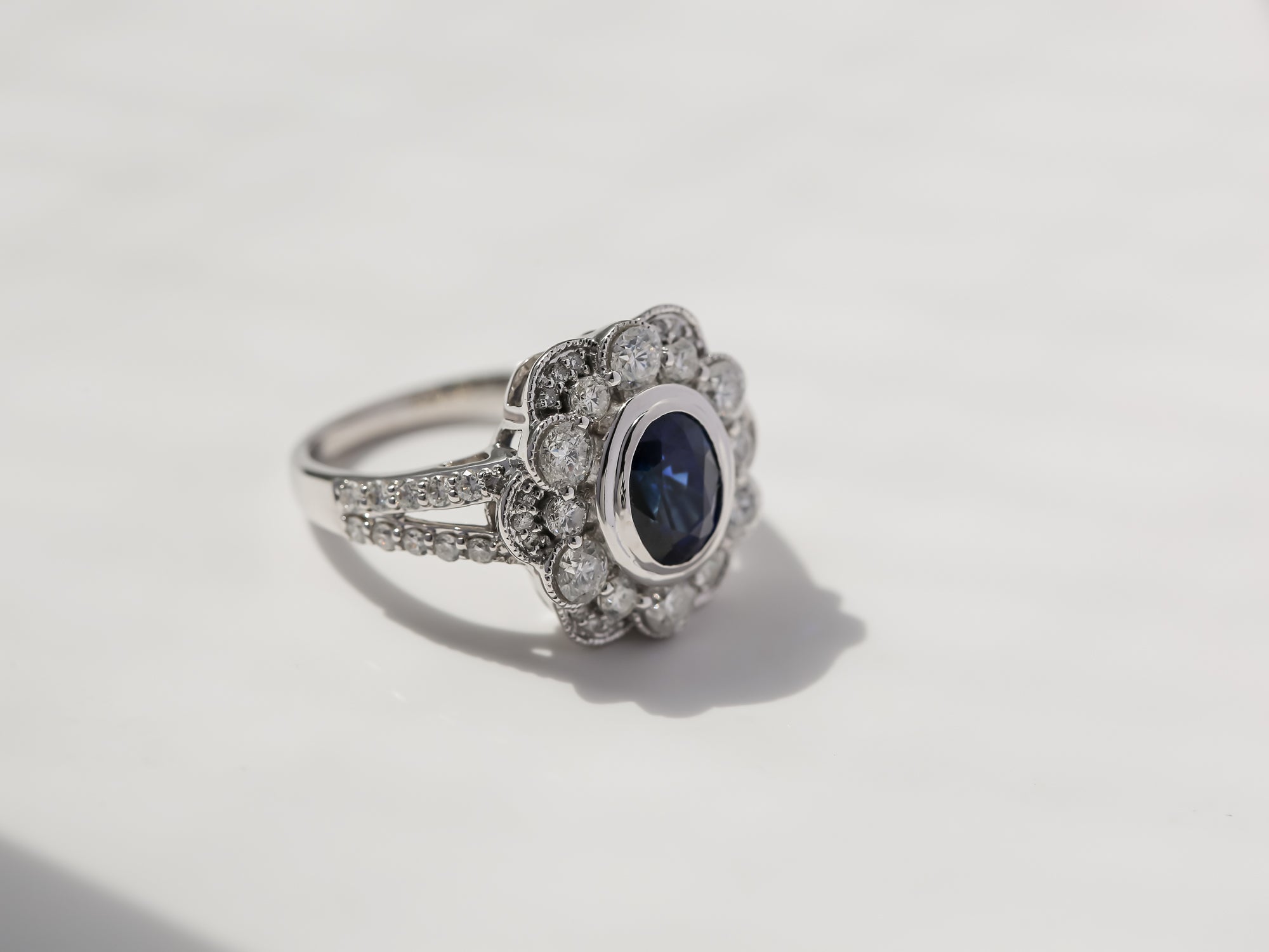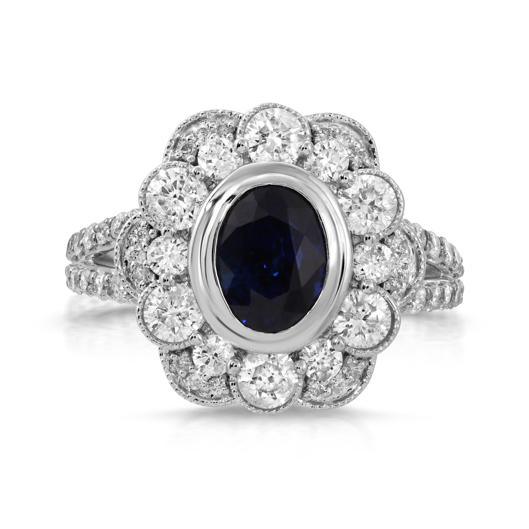 A blackish blue sapphire is bezel set in 10k white gold within a bountiful white diamond embellishment. Dual layered diamond petals are outlined in milgrain detailing over a diamond-lined split shank.