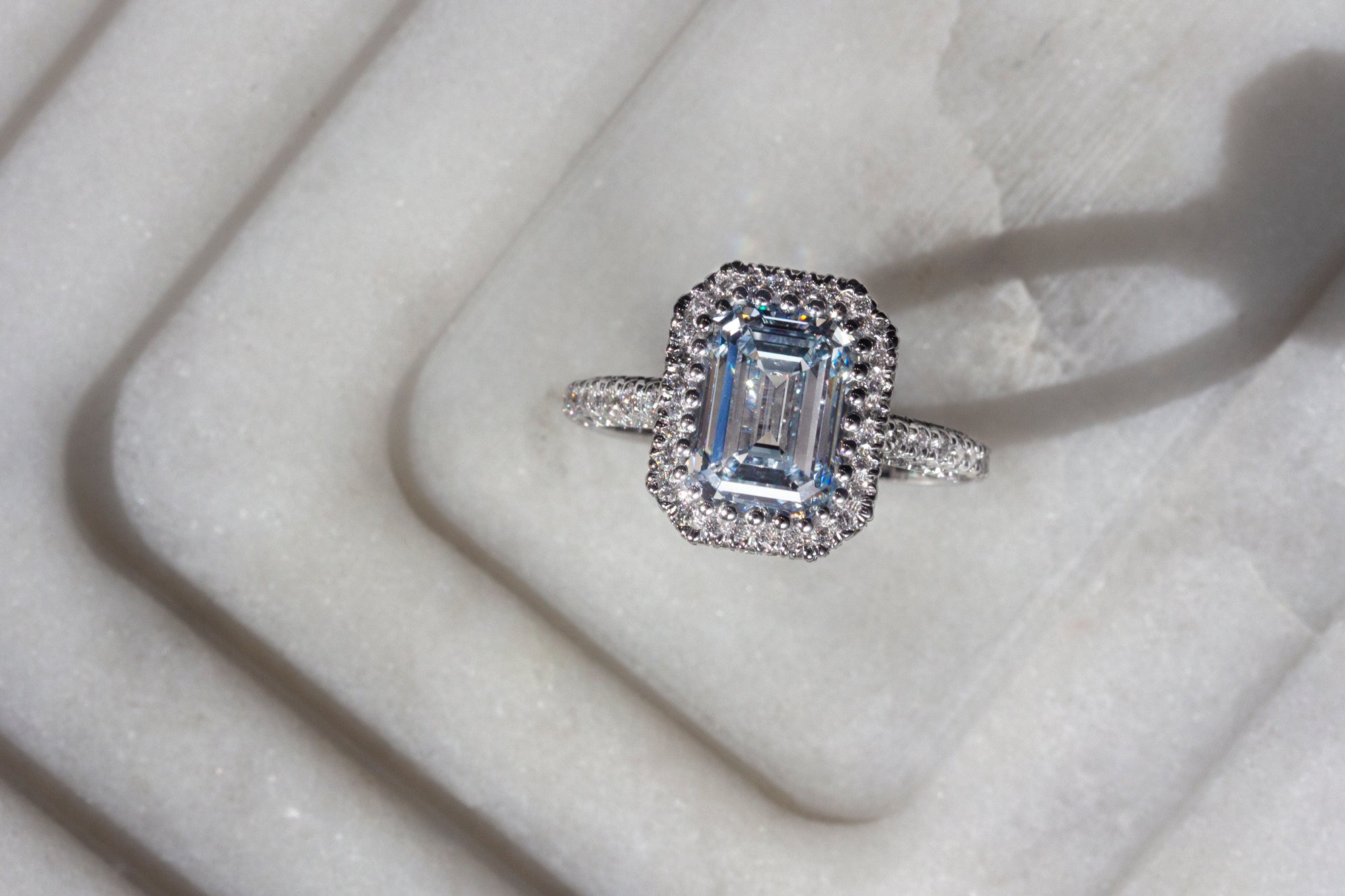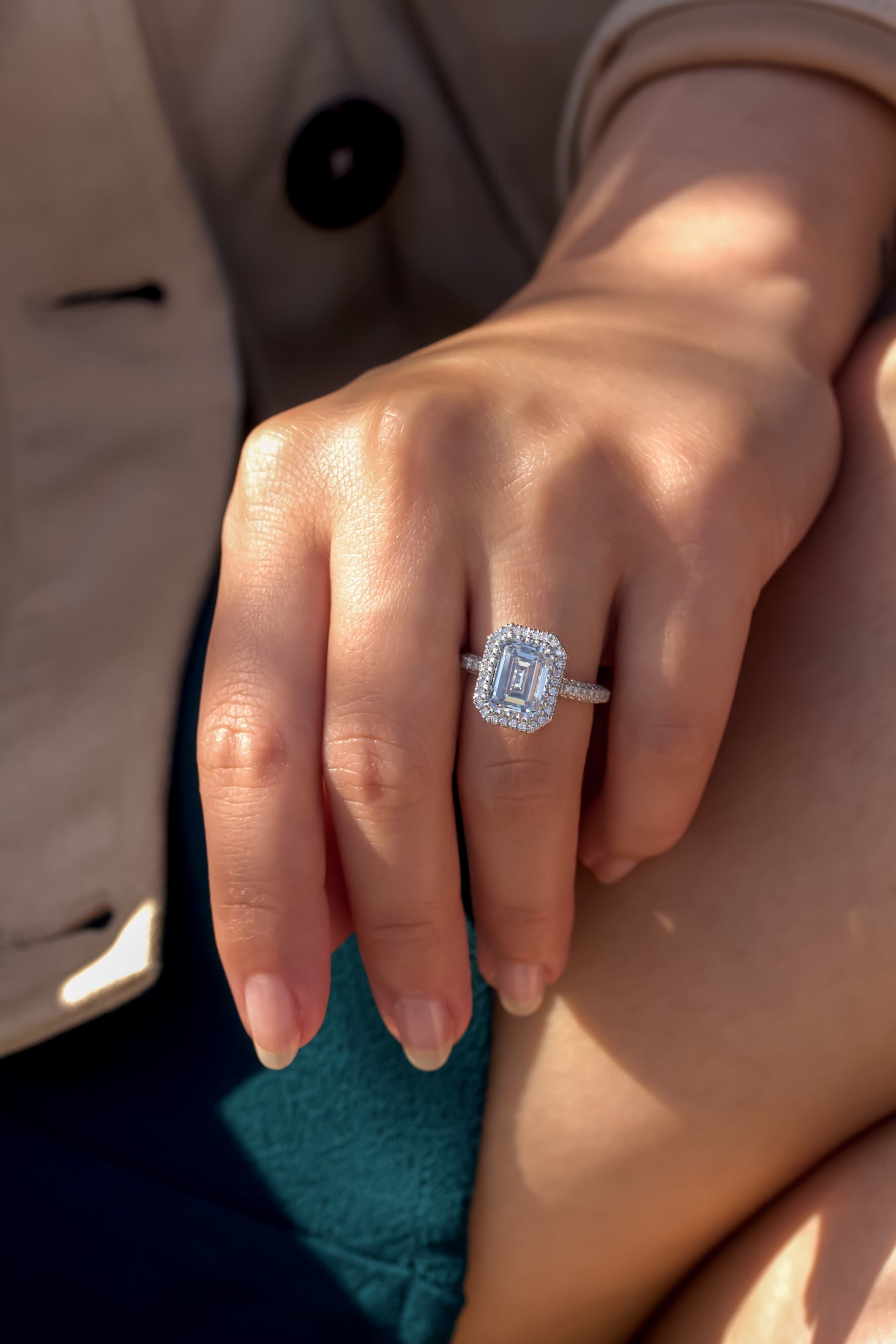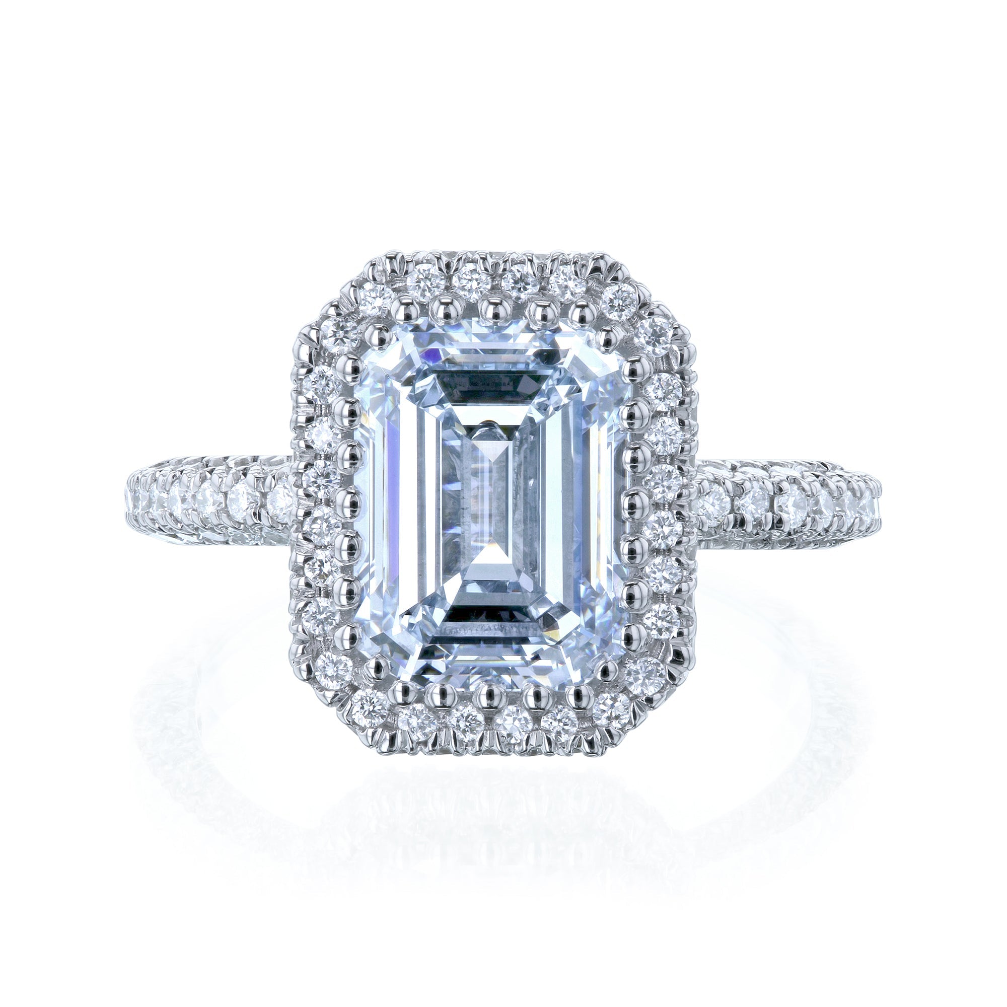 Swoonworthy design and execution takes this ring from yes, to ever-after. A mesmerizing hint of blue-grey on this lab-grown emerald-cut center stone will draw admirers in an instant. The stone is carried by an outline of ball prongs followed by a frosting of 168 lab-grown white diamonds wrapping it in a halo and along the band.