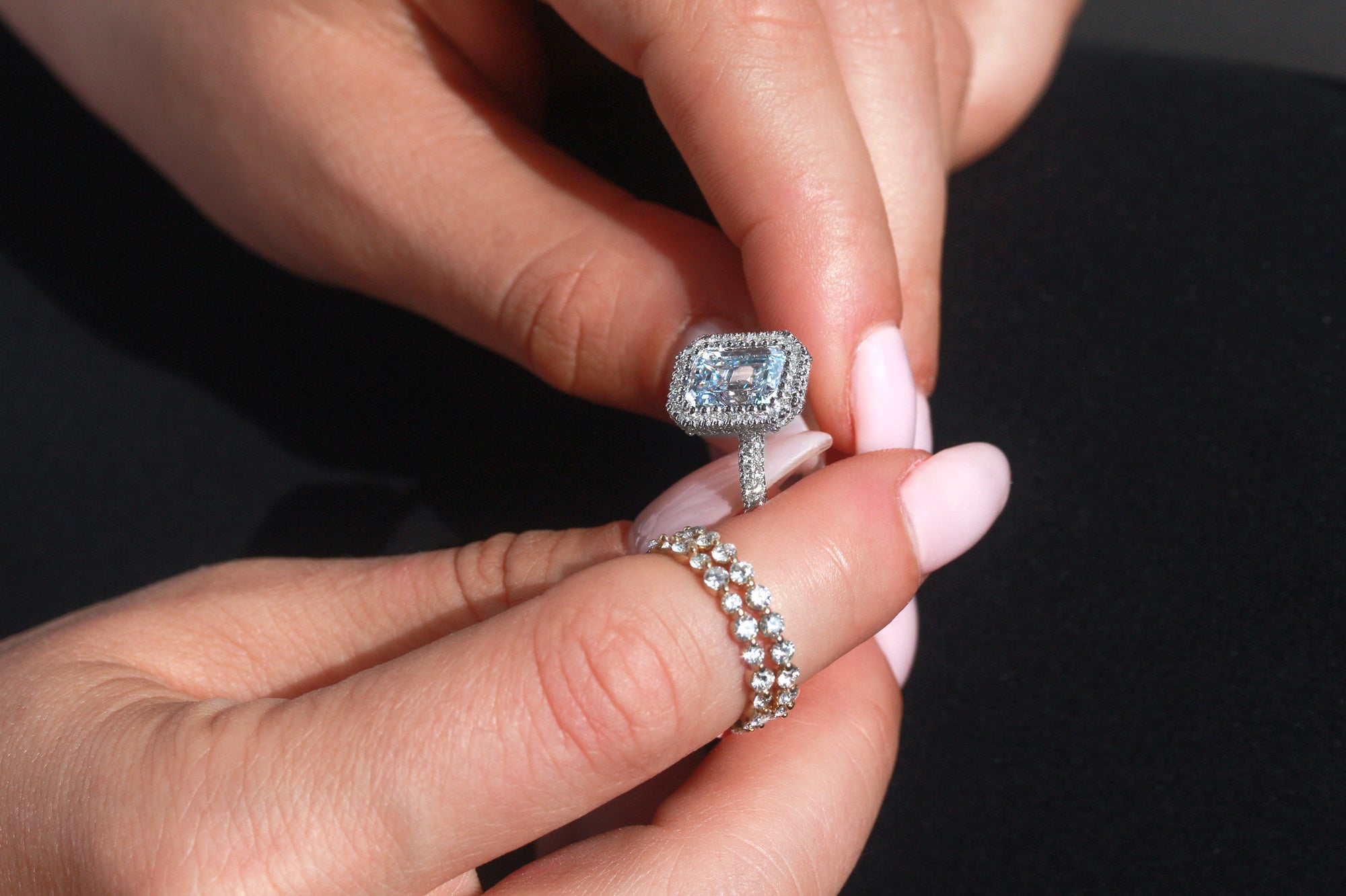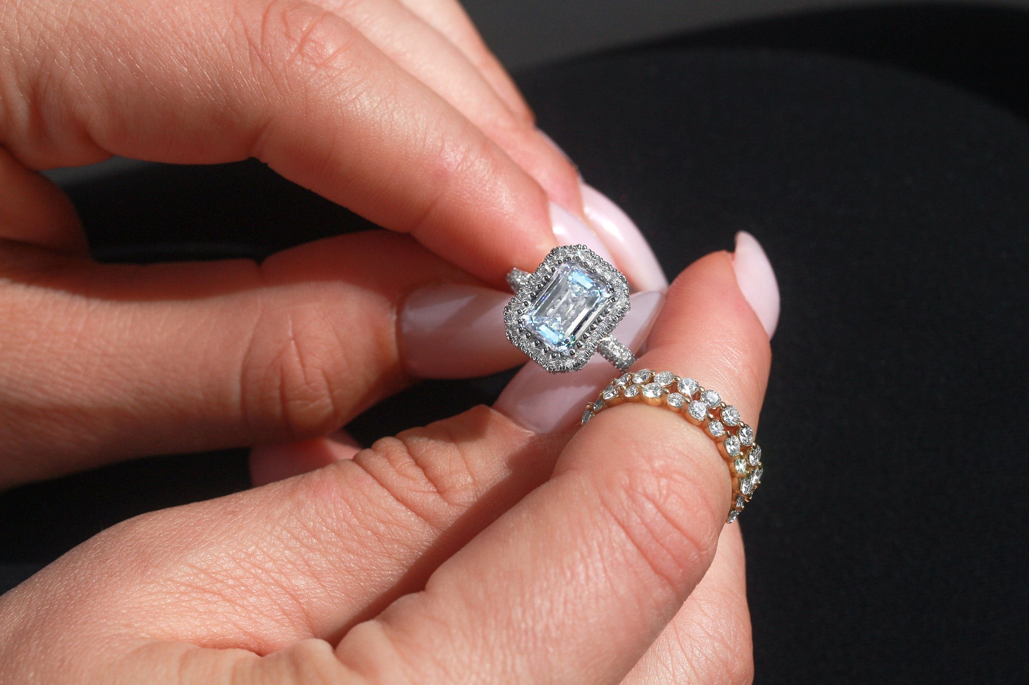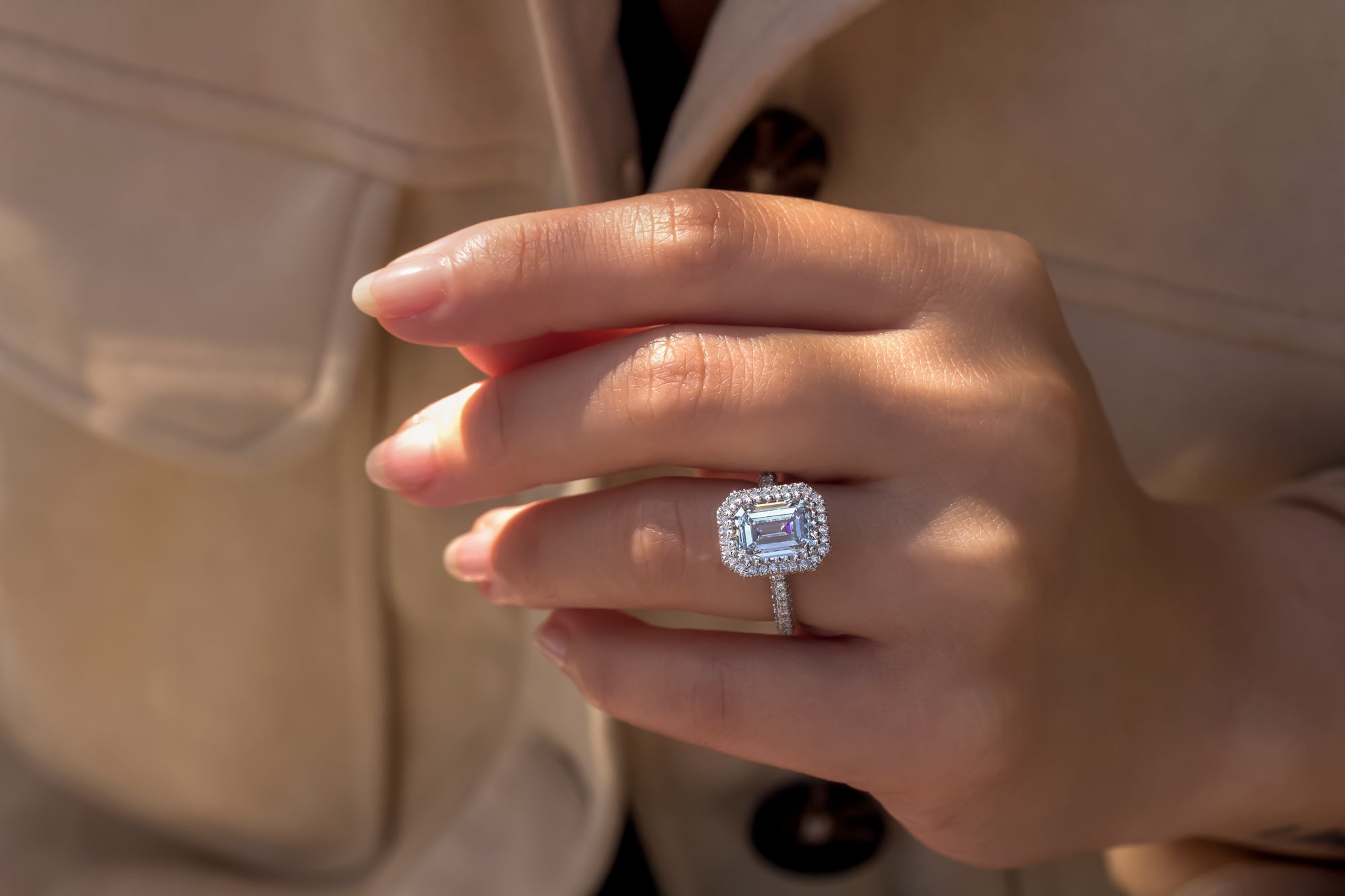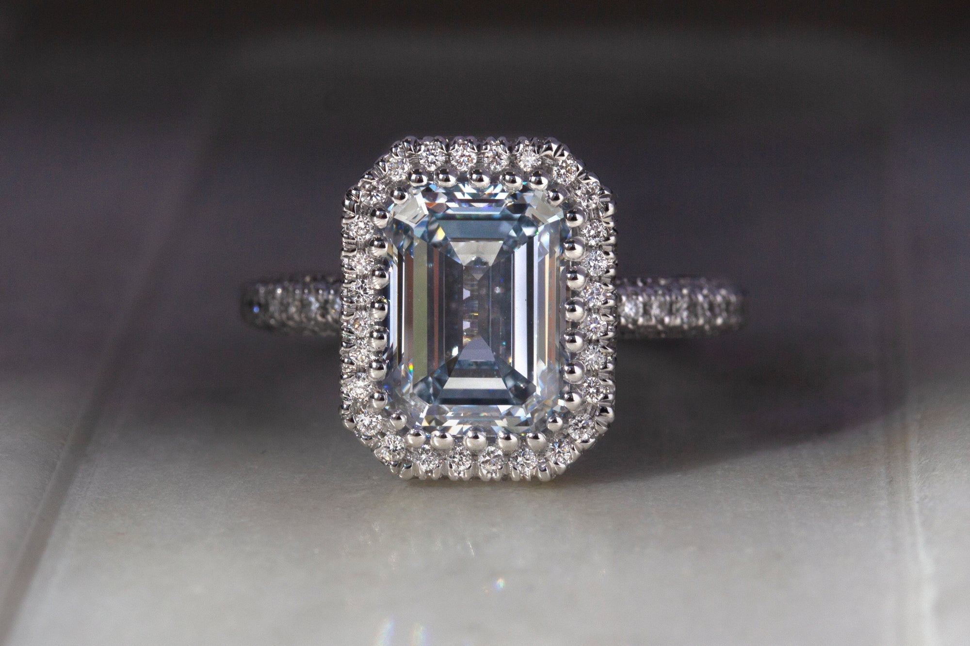Swoonworthy design and execution takes this ring from yes, to ever-after. A mesmerizing hint of blue-grey on this lab-grown emerald-cut center stone will draw admirers in an instant. The stone is carried by an outline of ball prongs followed by a frosting of 168 lab-grown white diamonds wrapping it in a halo and along the band.