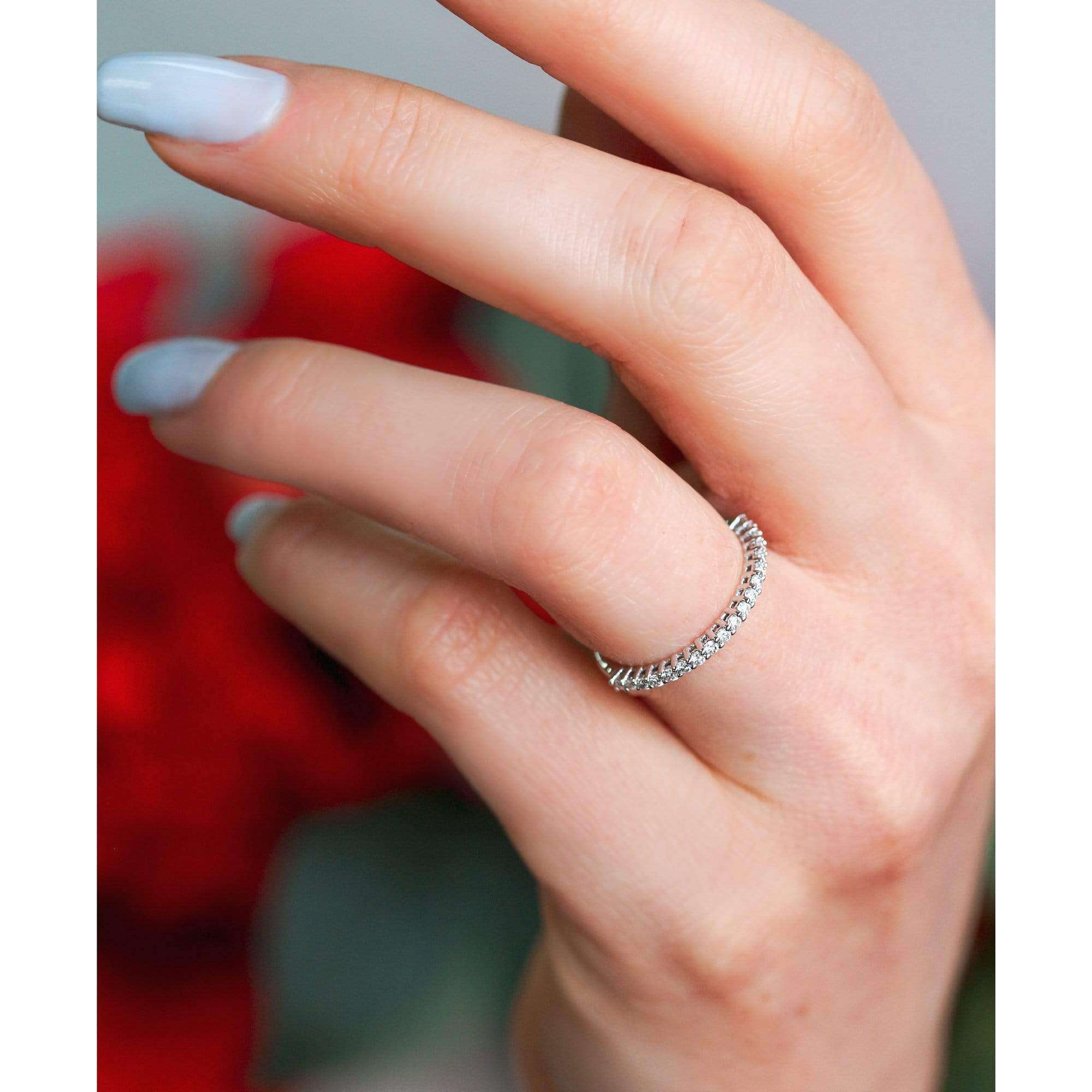 - Remember that the wider the width of the band is, the tighter it will fit. We recommend going up in size between 1/4 and 1/2 for rings with a wider design. This may also apply when wearing bridal sets and stackable rings.