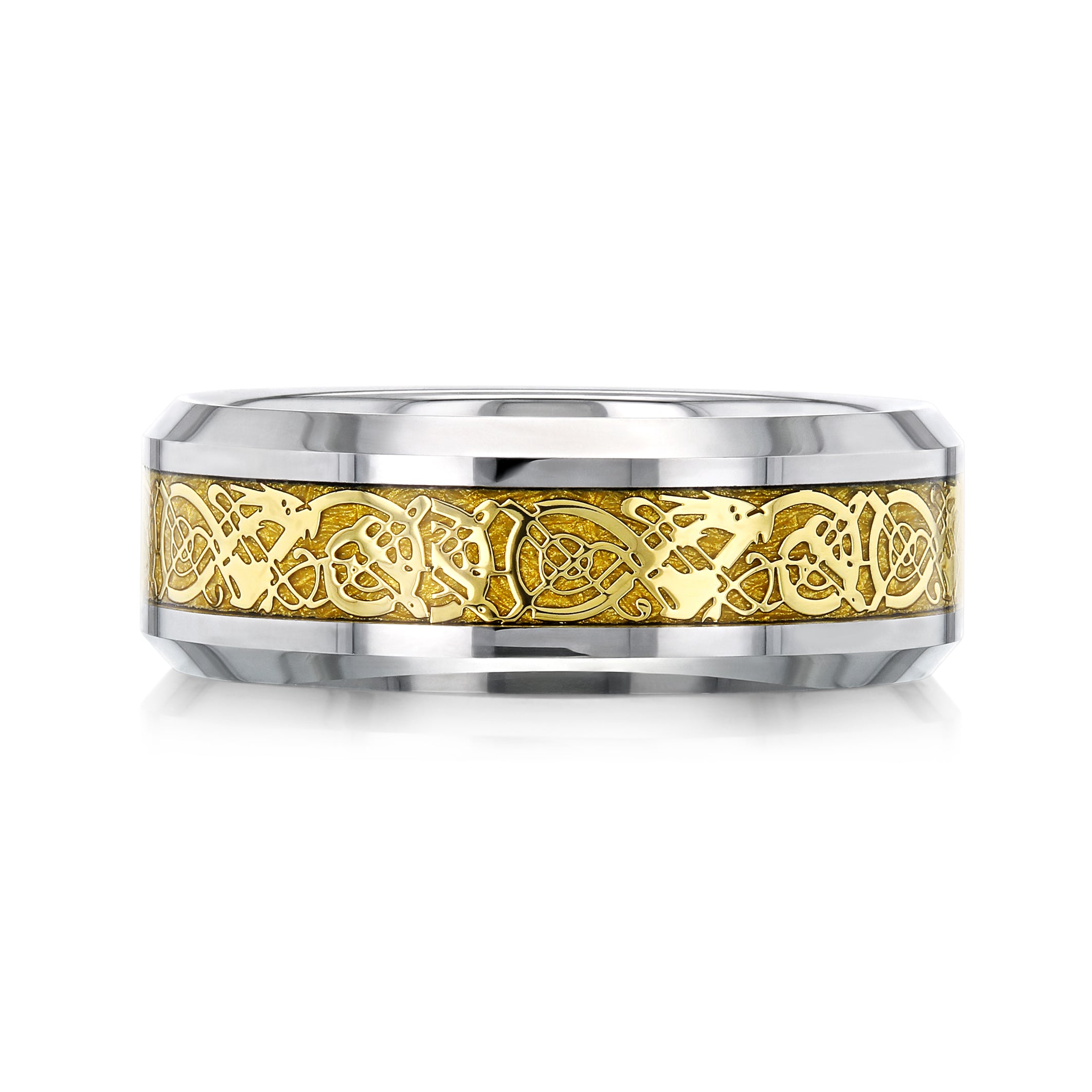 Comfort fit men's wedding band or fashion ring with gold celtic dragon inlay. This scratch resistant ring is highly durable and made to last a lifetime.