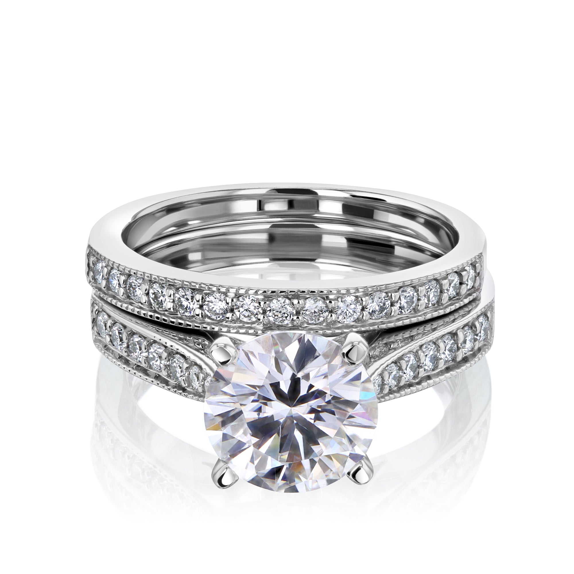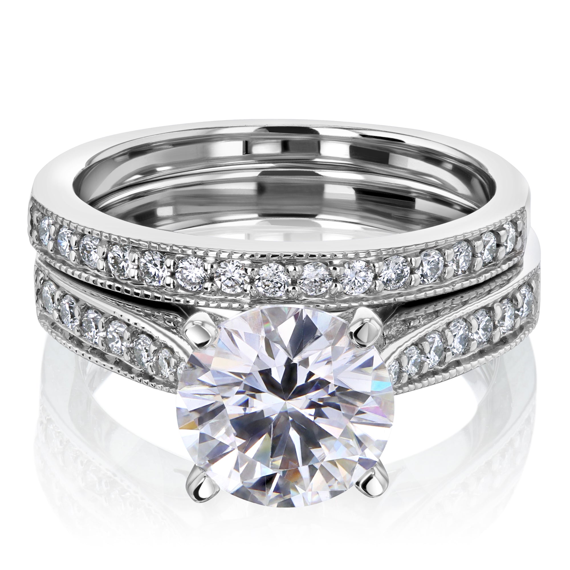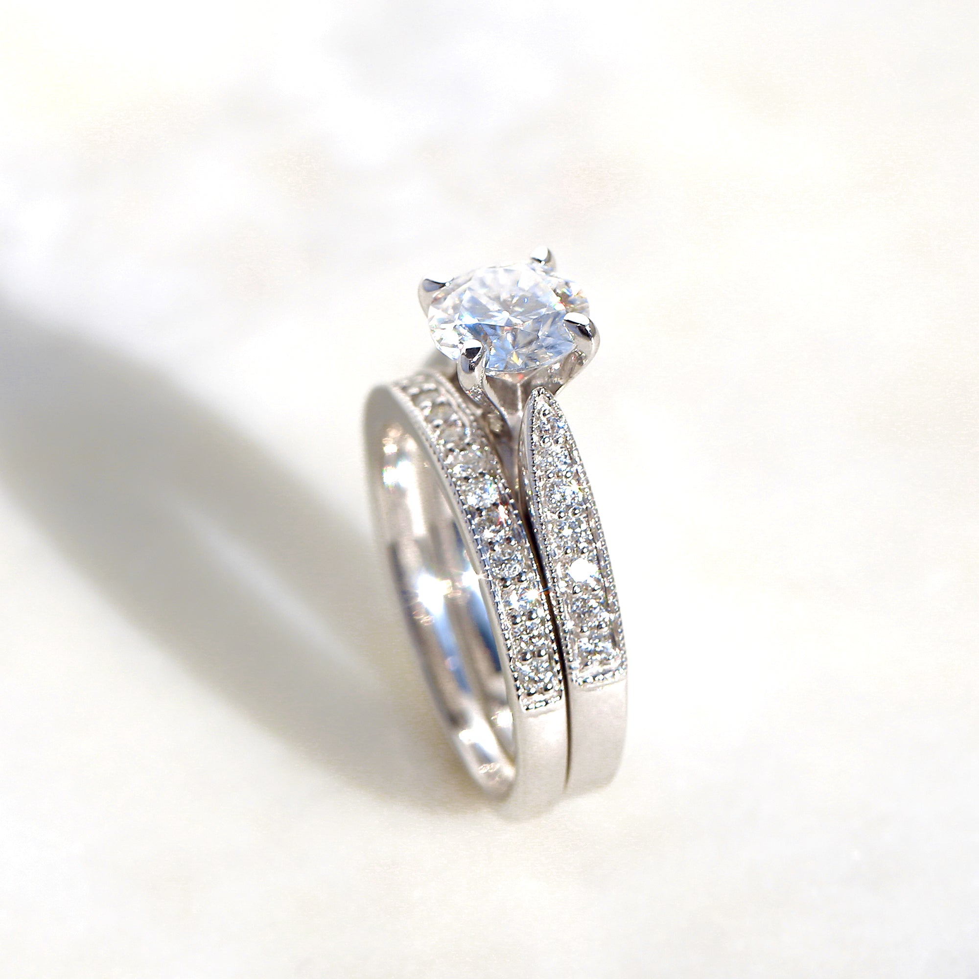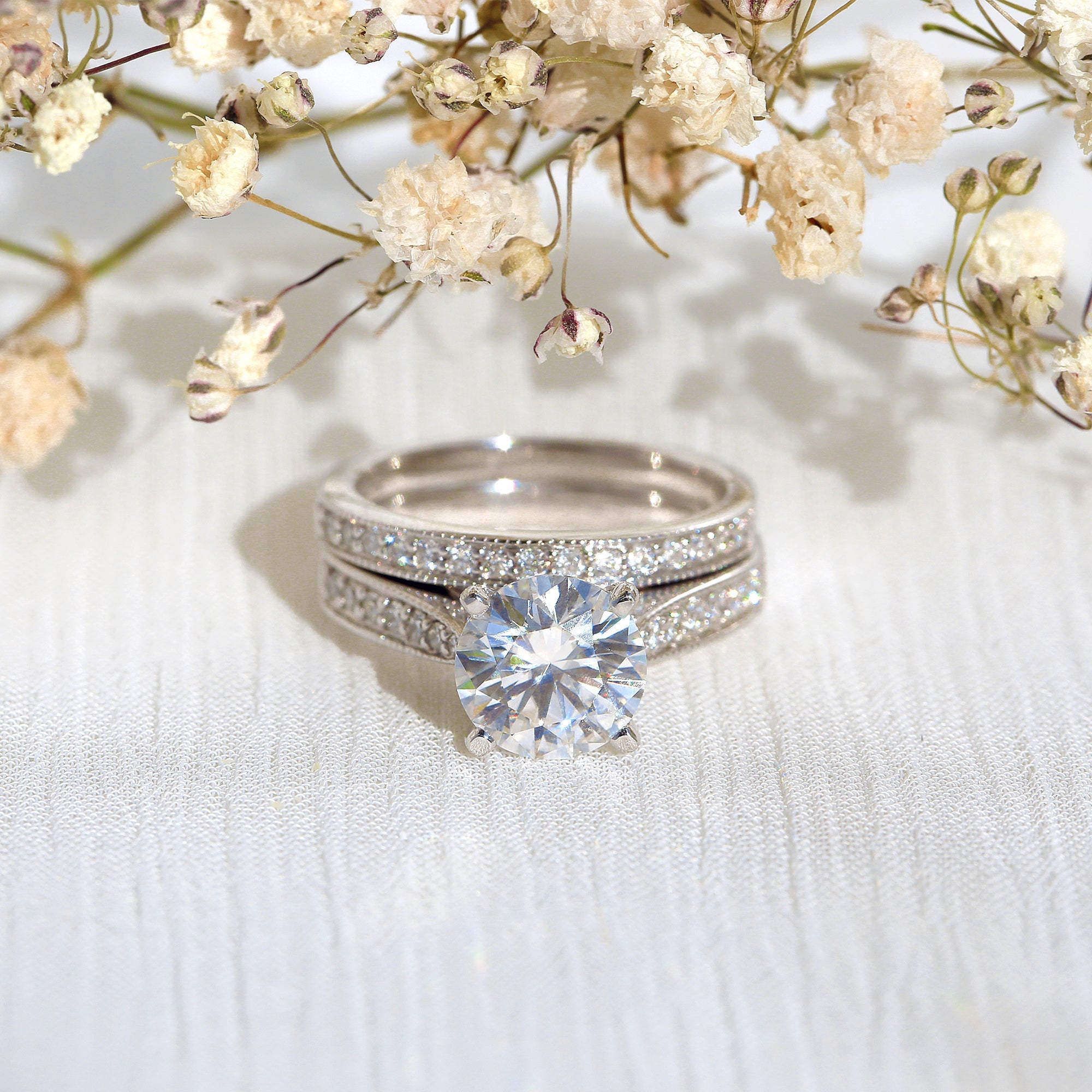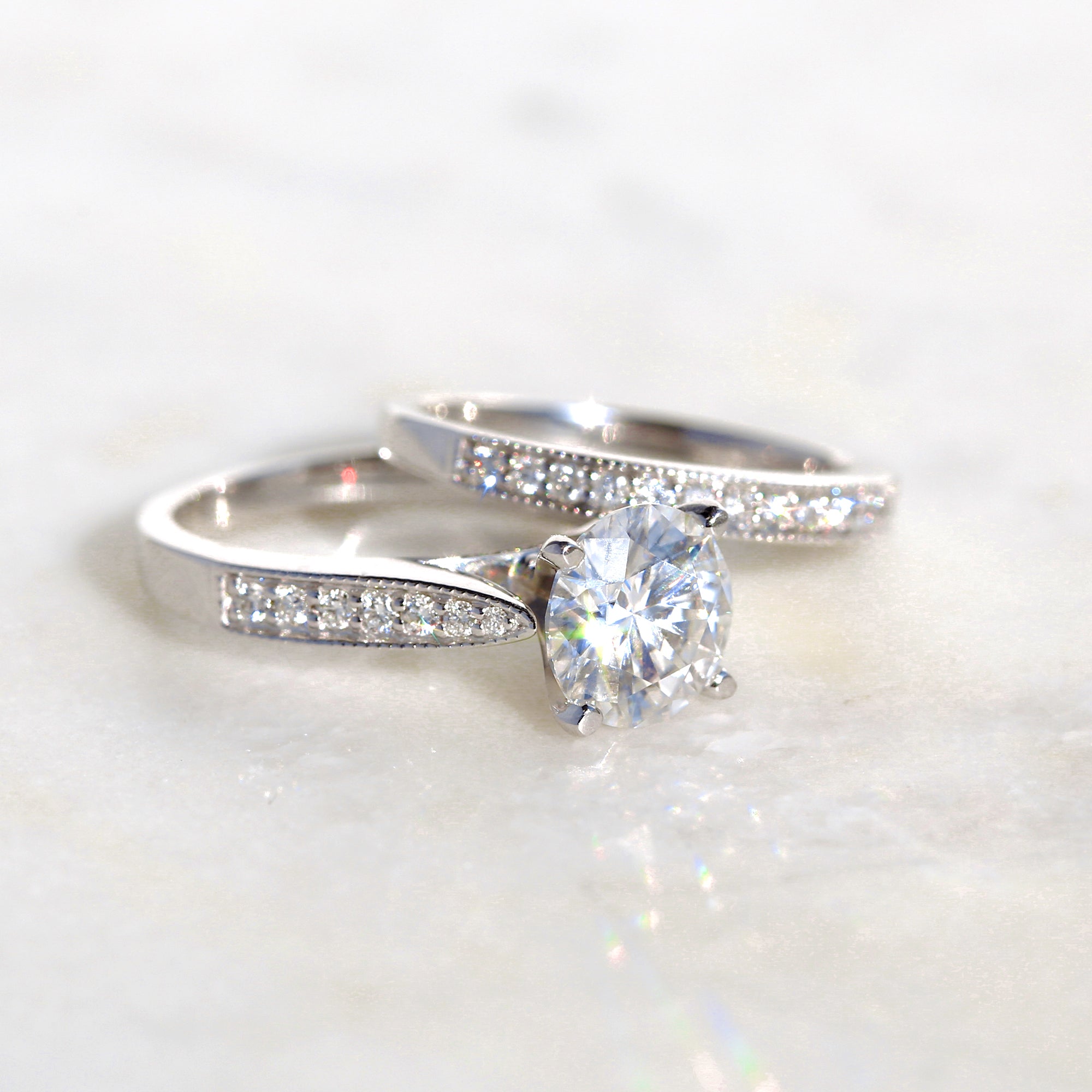 Round Moissanite and Pave Diamond Milgrain Vintage Bridal Set in 14k White Gold
