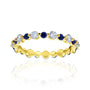 A continuous pattern of round white diamonds and round blue sapphires line this solid gold ring in beautiful unison. Single bead shared-prongs are wedged between each stone having each stone showcased in maximum exposure from top to bottom.