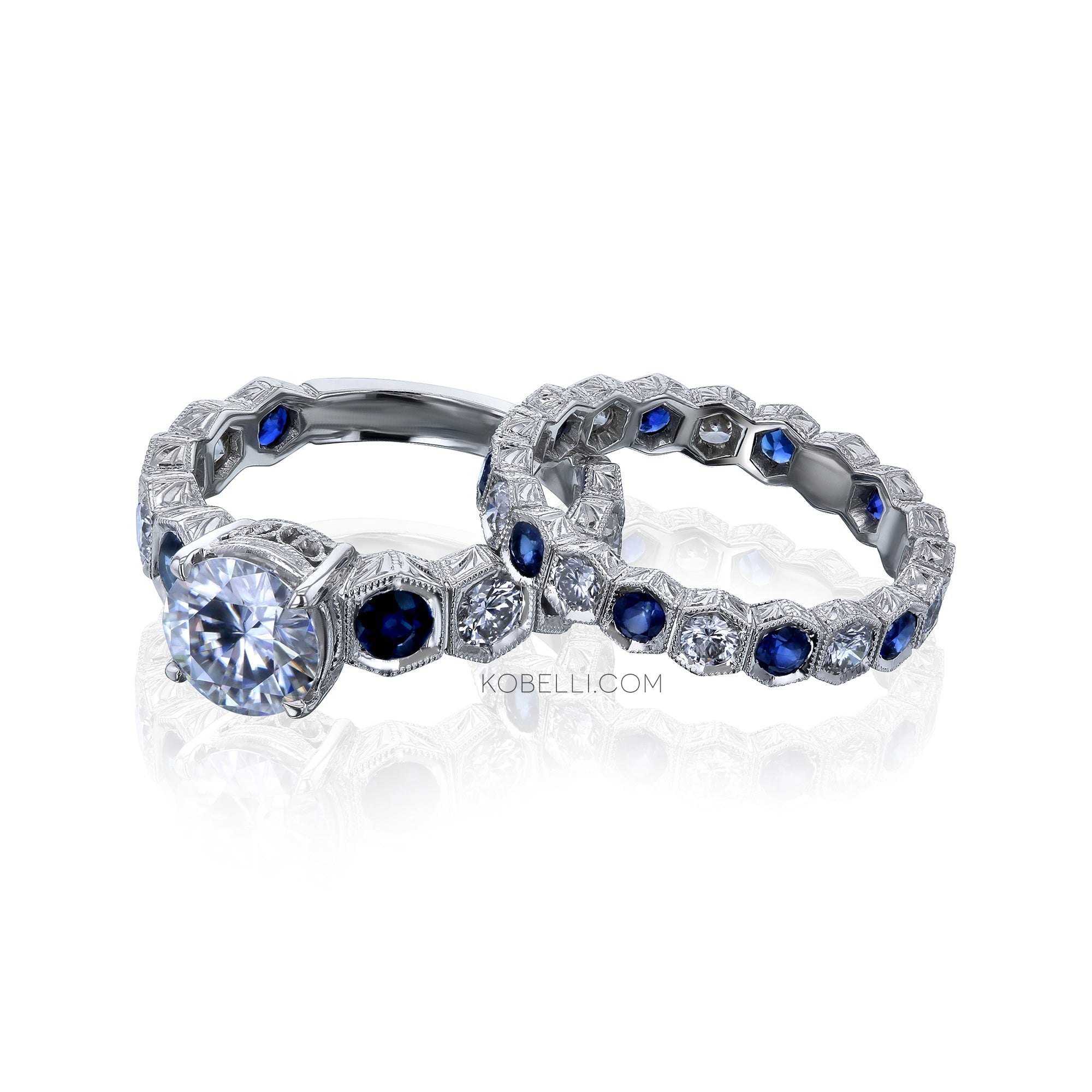 A single 1.50 carat round brilliant-cut moissanite tops the engagement ring while all other white stones on the set are comprised of natural white diamonds situated in alternating-fashion with bright blue sapphire gemstones.