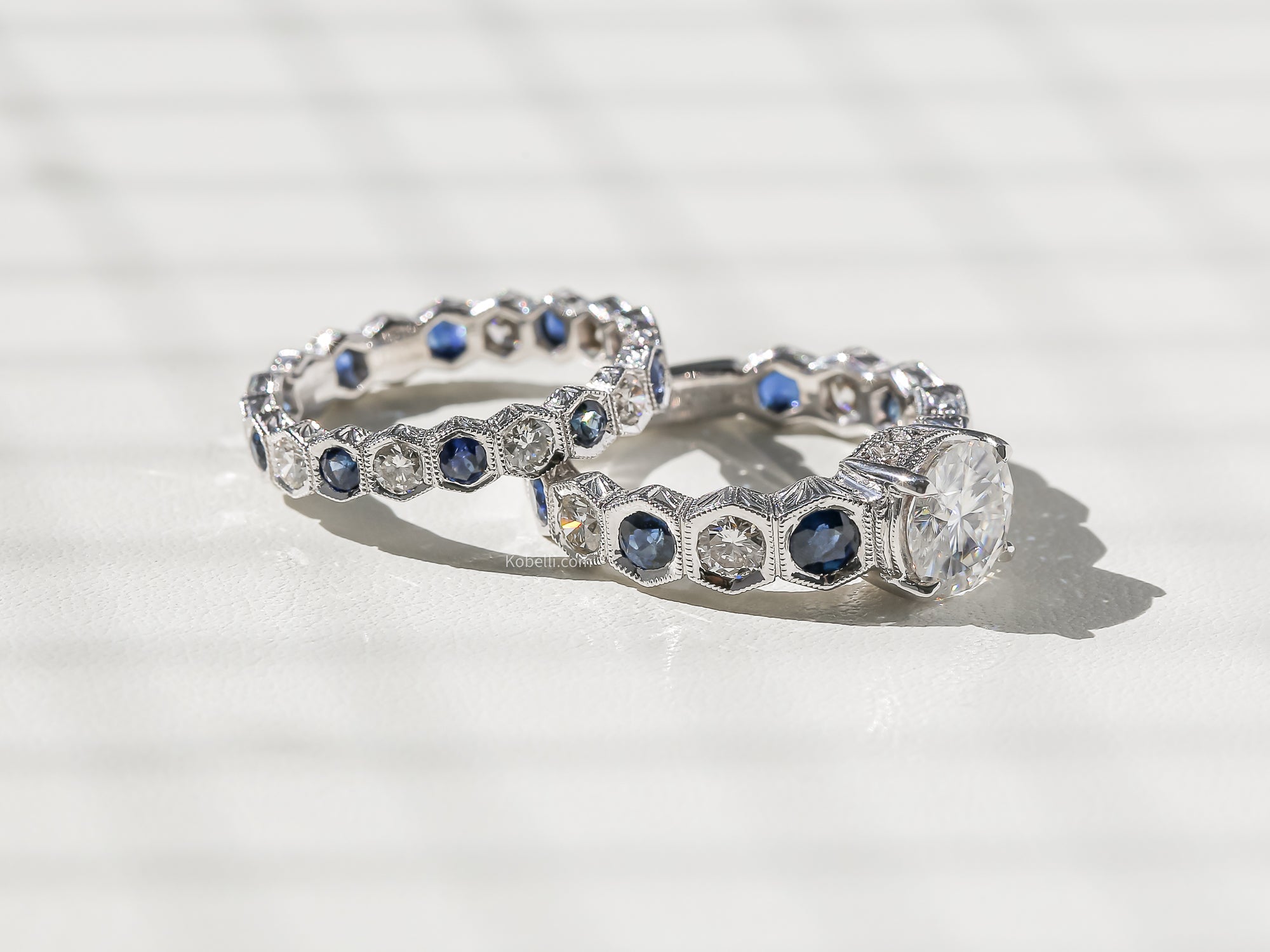 4.84 Carat Hexagon Eternity Blue Sapphires & White Diamonds in 18k Gold - Moissanite Center