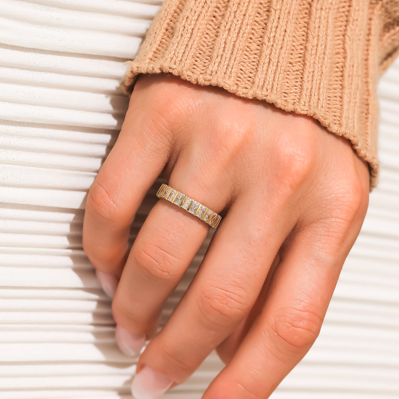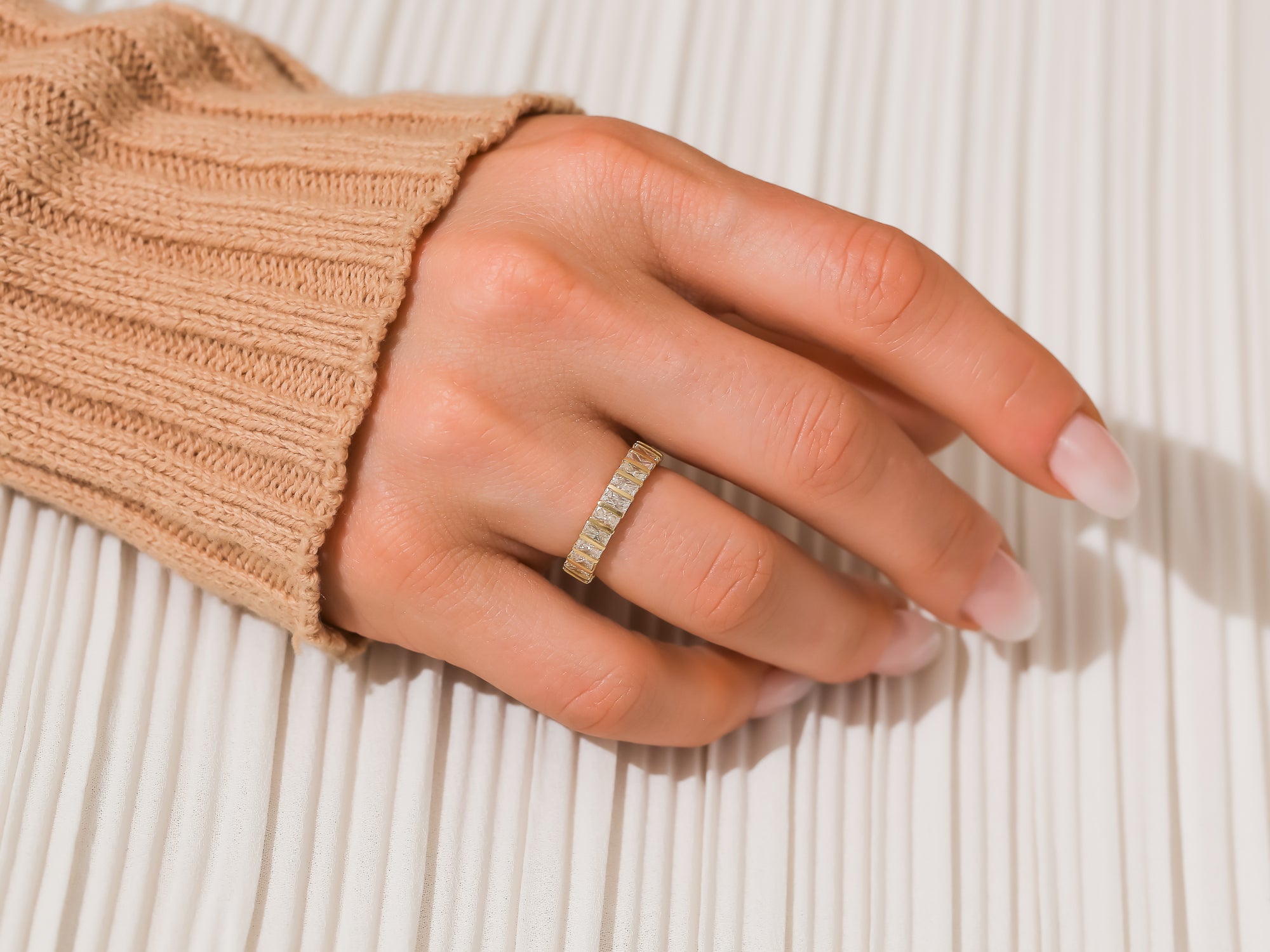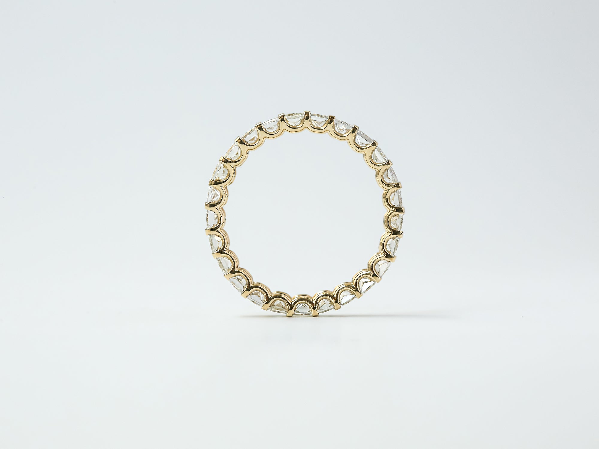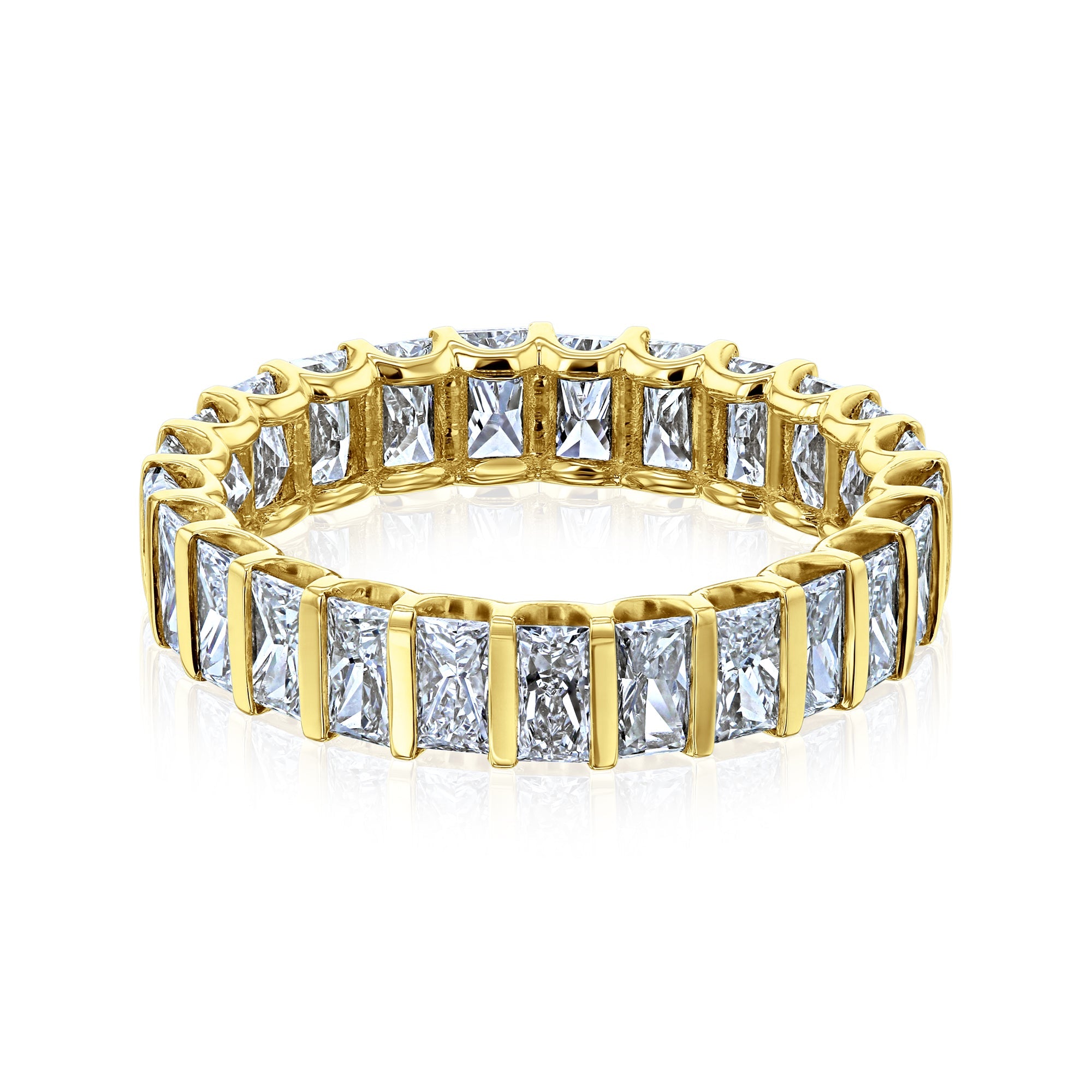 The symbolism of eternity bands is straightforward in itself -- with no beginning and no end, these elongated diamonds circulate your precious ring in infinite brilliance that will never fade.