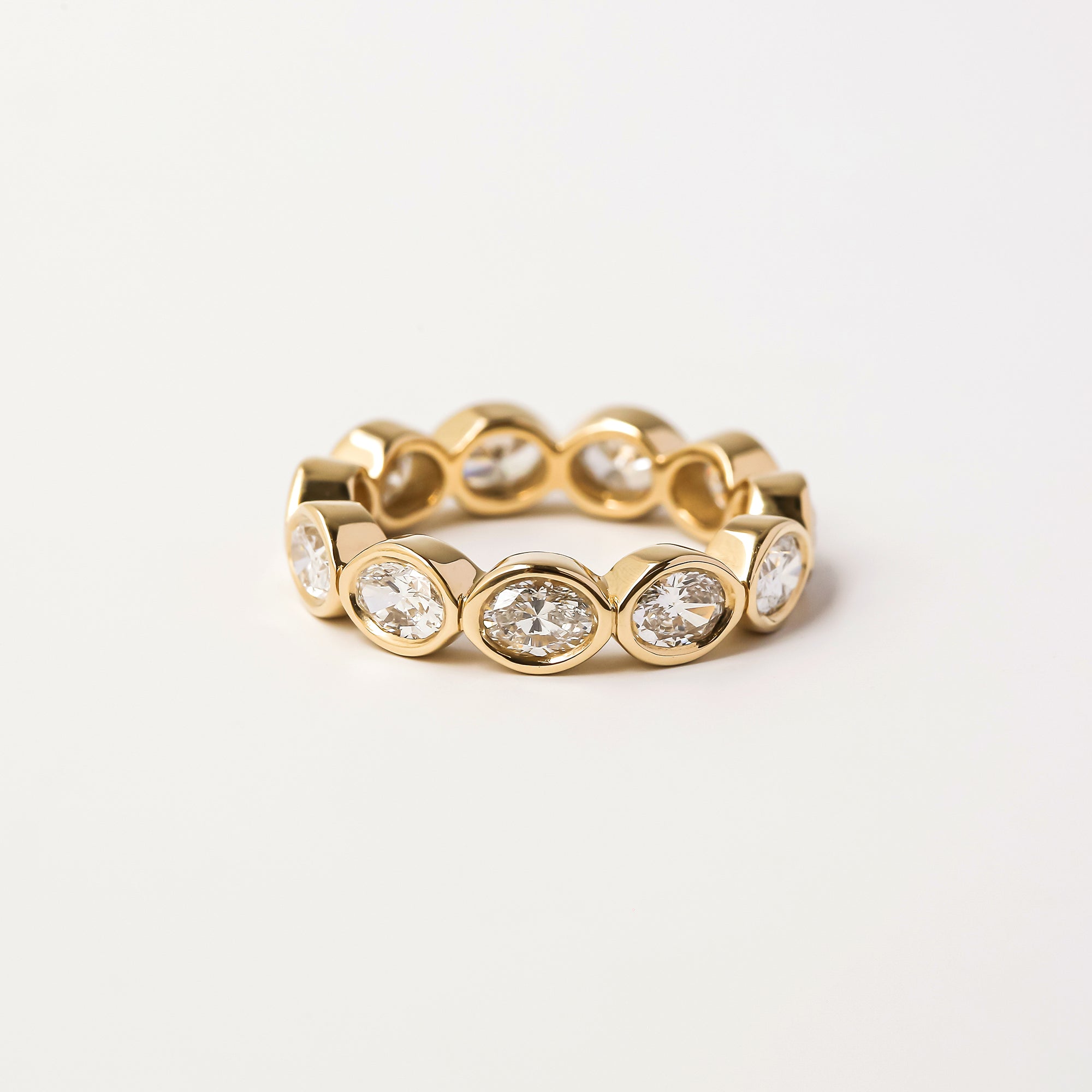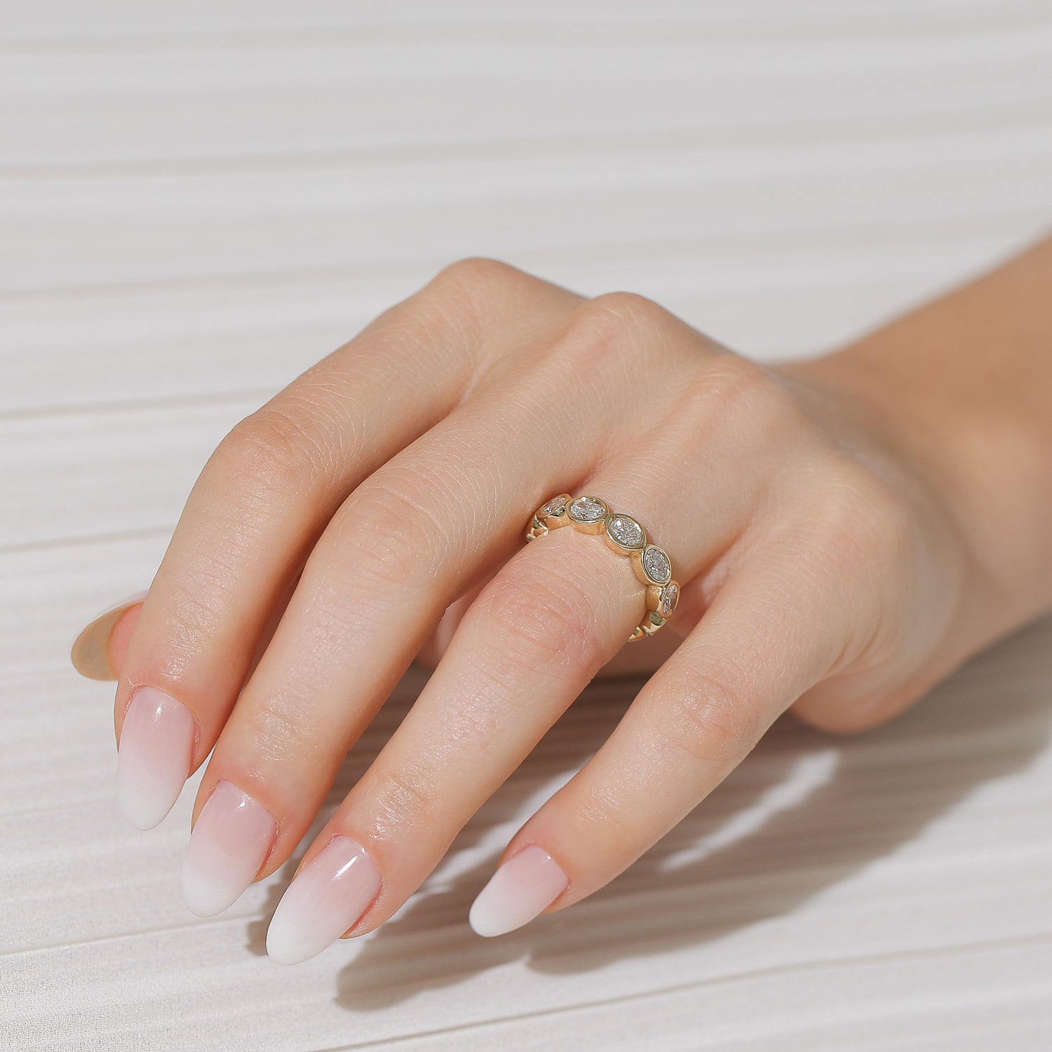 Lab grown genuine diamonds are each perfectly and bezel set into this solid 14k gold band. The brilliant-cut diamonds are set in east-west fashion, directly next to each other.