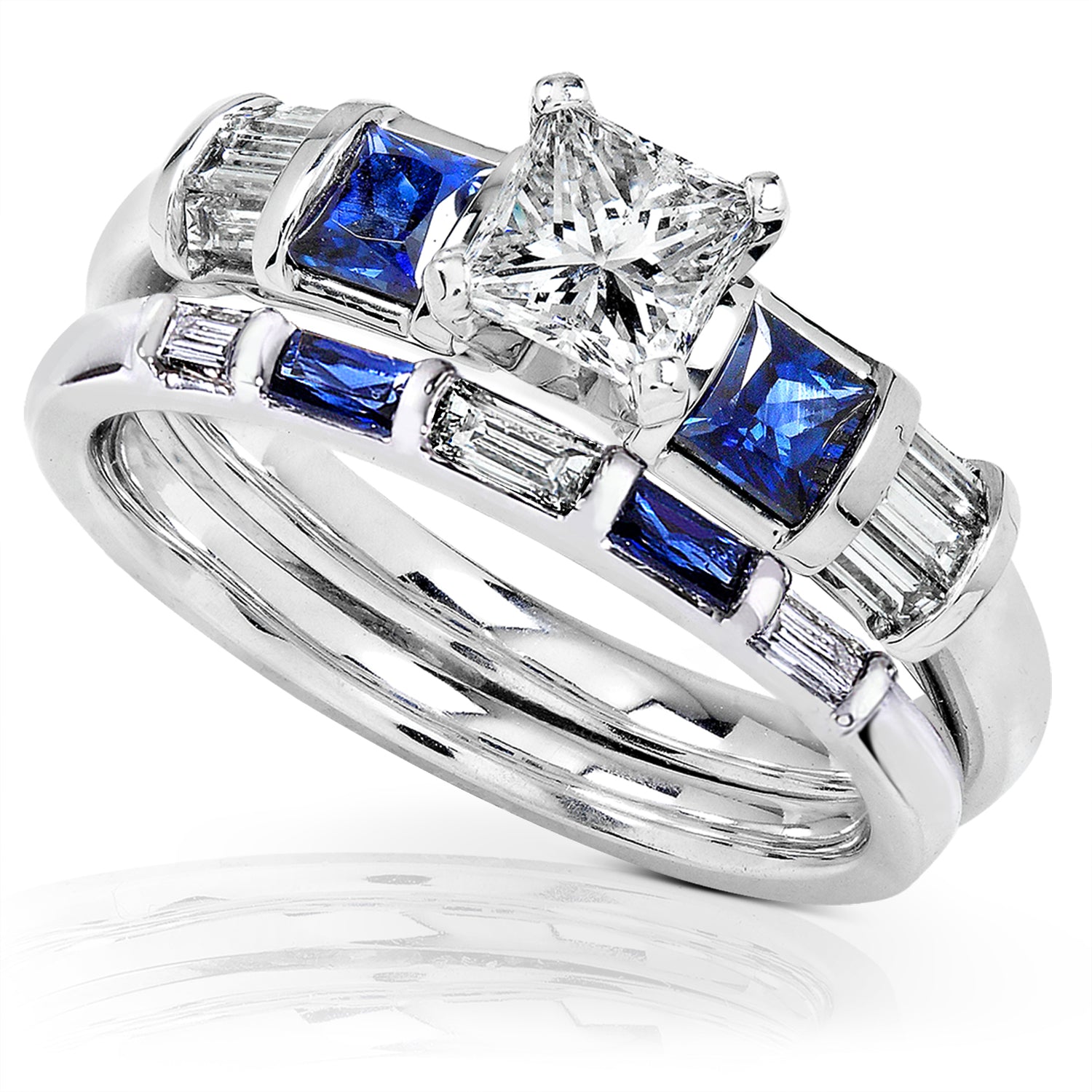 Blue Sapphire & Diamond Wedding Rings Set 1 1/4 Carat (ctw) in 14k White Gold