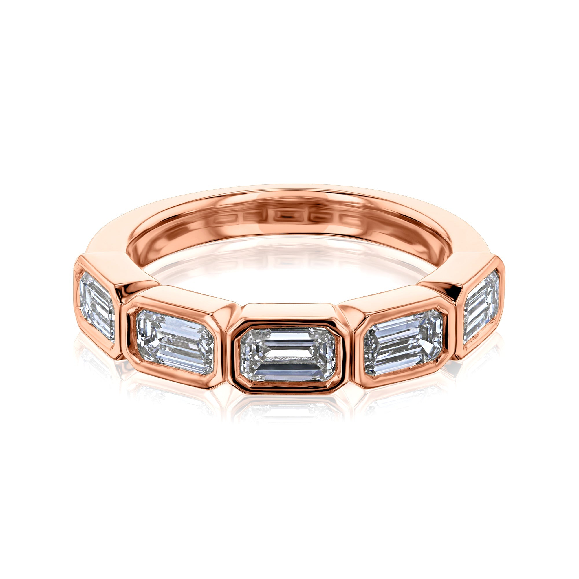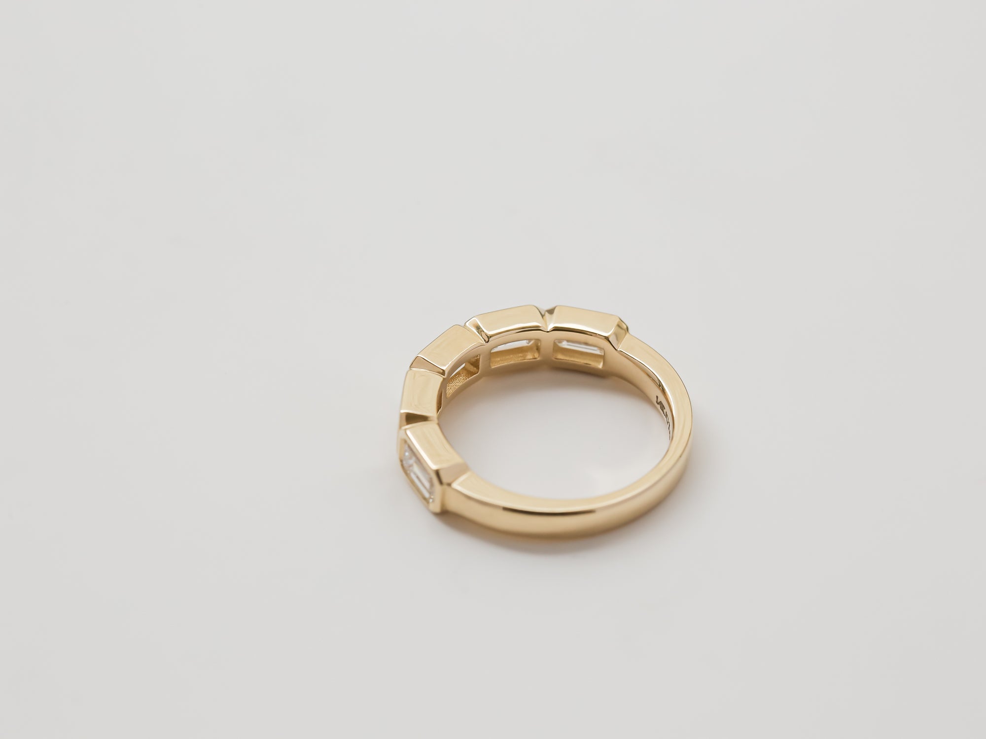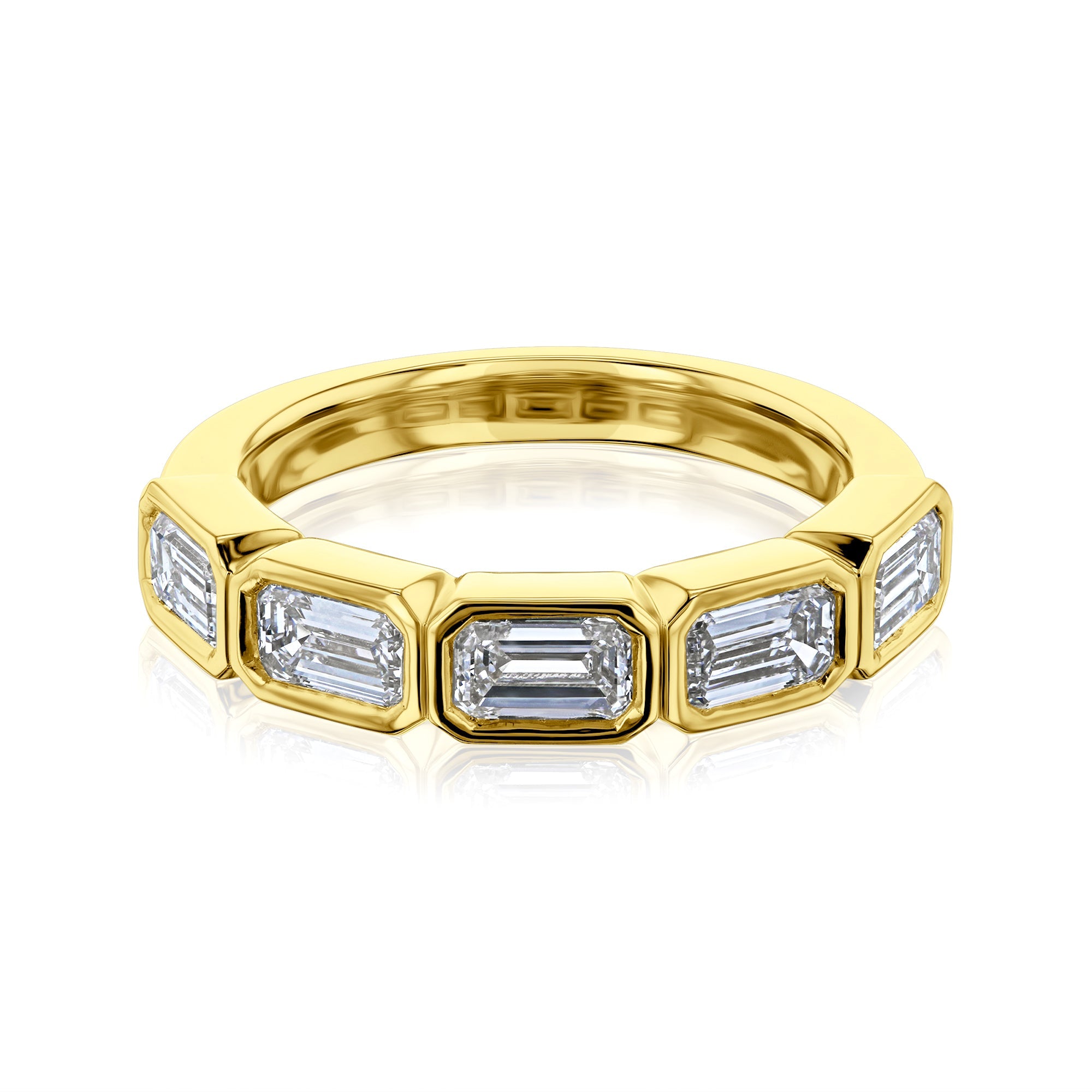 Lab grown genuine diamonds are each perfectly cut and bezel set into this solid 14k gold band. The diamonds are set in east-west fashion, directly next to each other.