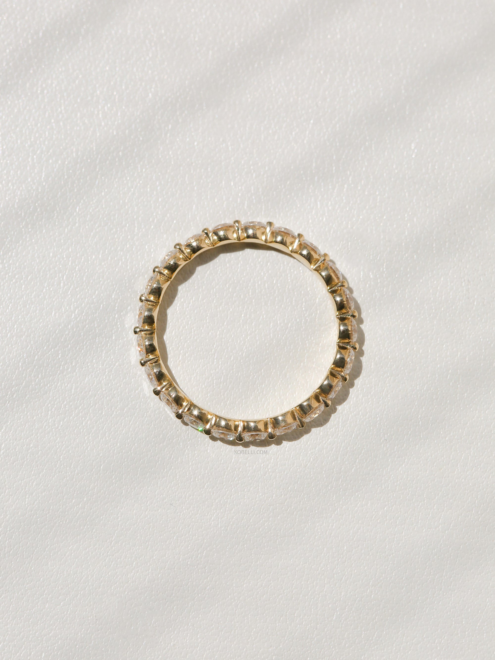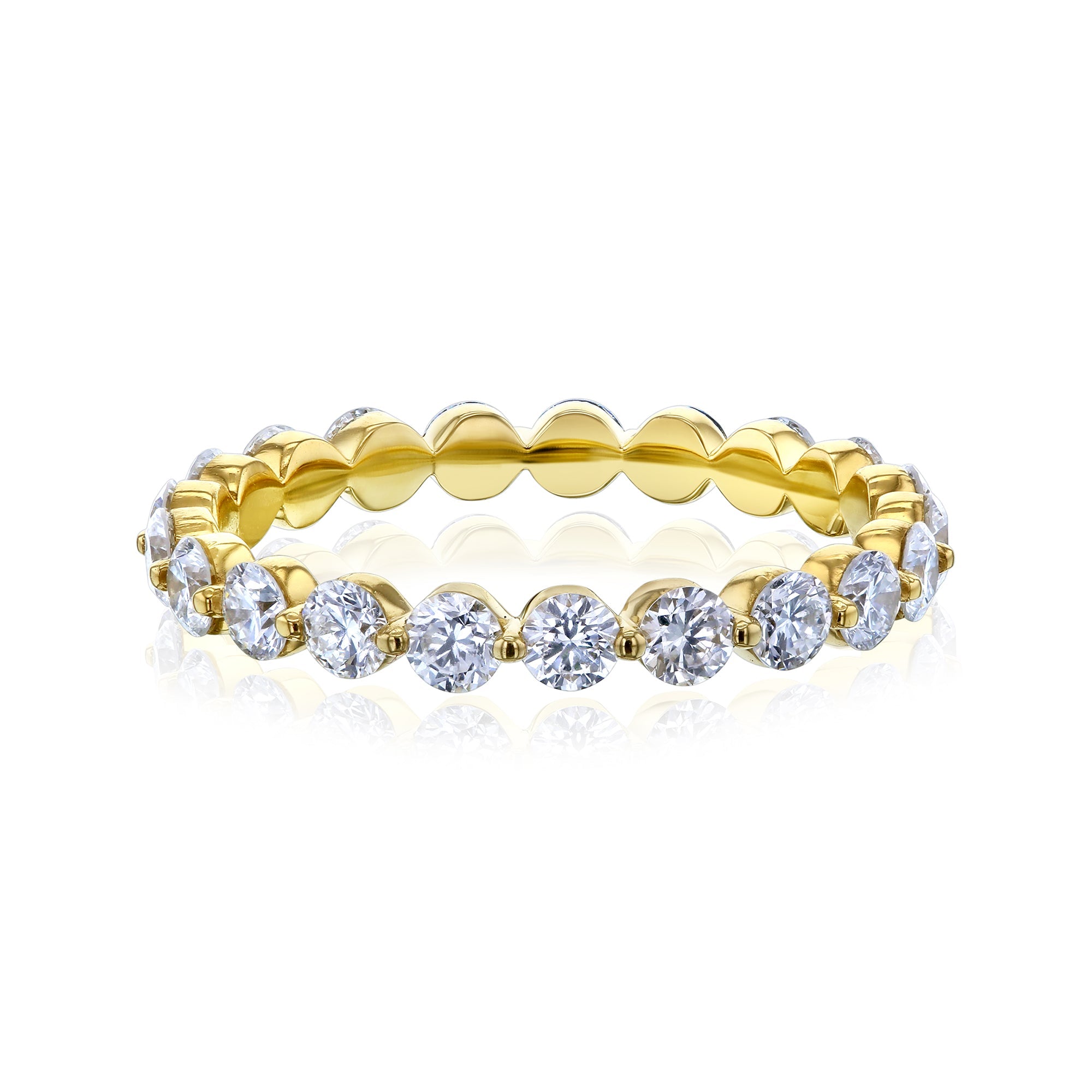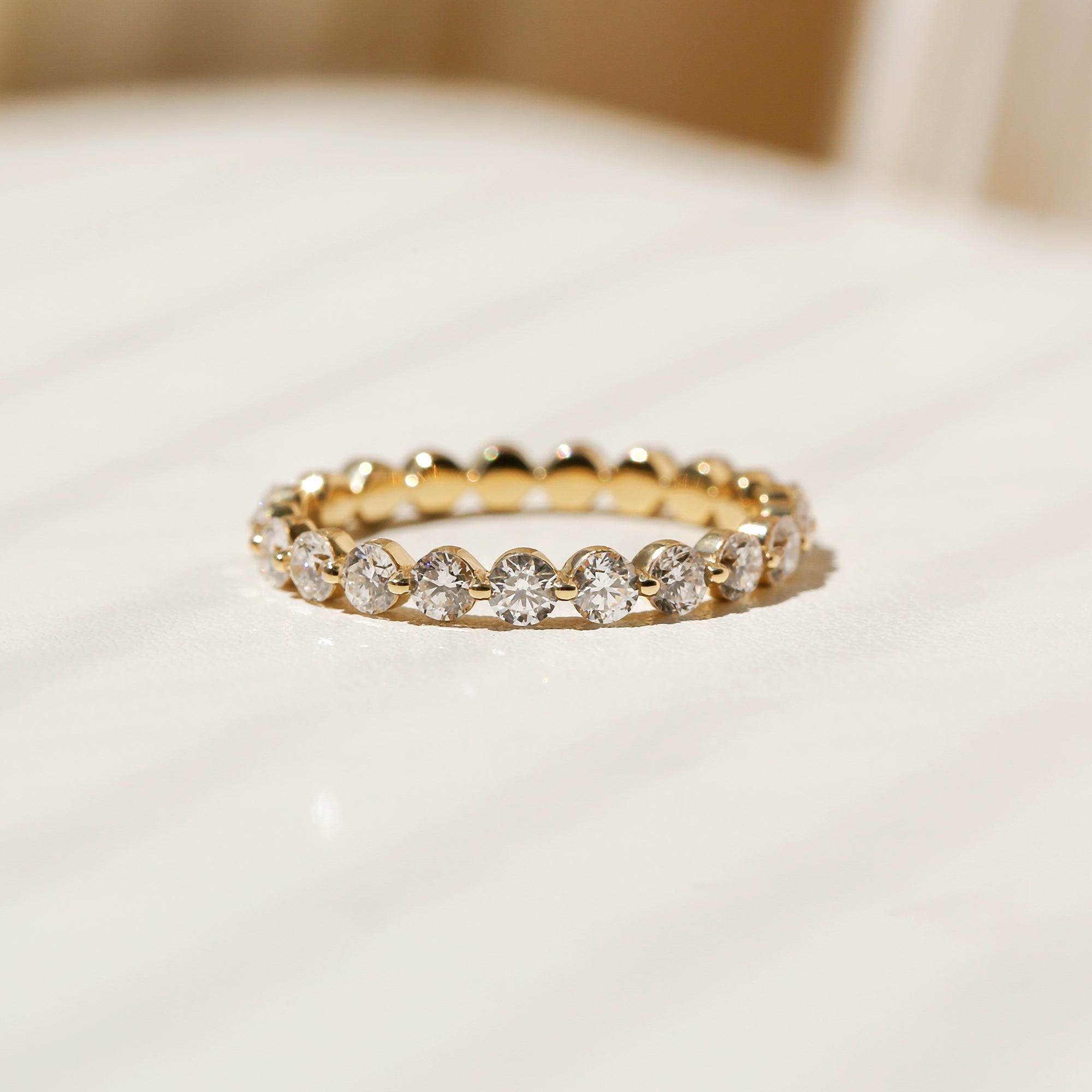 An endless series of round brilliant-cut diamonds lines this solid gold ring in beautiful unison. Single bead shared-prongs are wedged between each diamond having each stone showcased in maximum exposure from top to bottom.