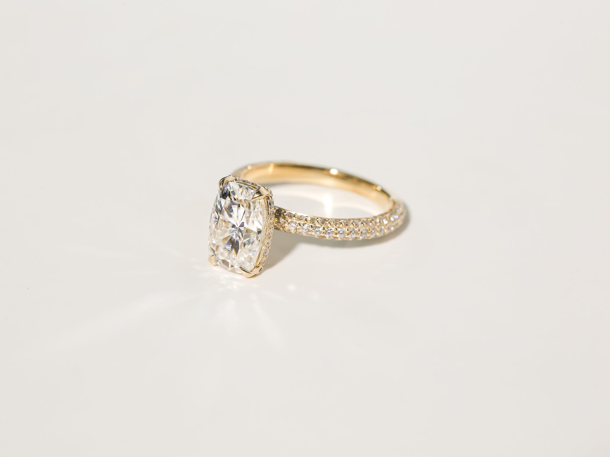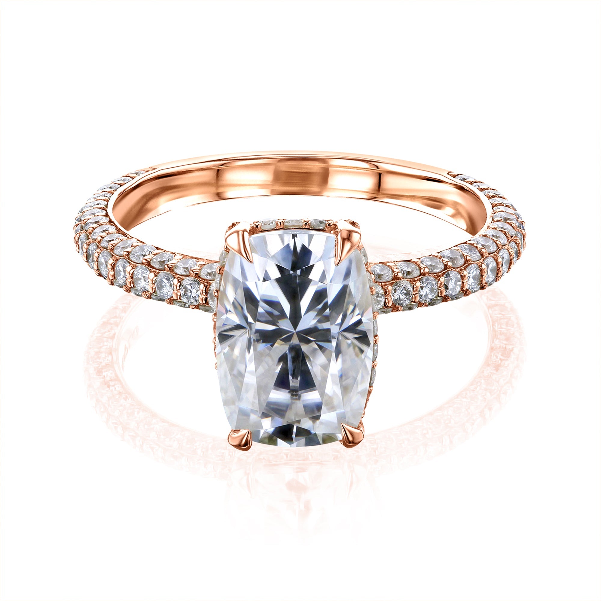 The Colette Diamond-Coated Ring features a gorgeous 3.20 carat moissanite center stone and approximately 0.95 carats in lab-grown side diamonds. The brilliant-cut elongated cushion center offers a captivating radiance that is fully complimented by the shimmering rows of diamonds sitting beside it.