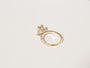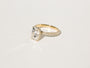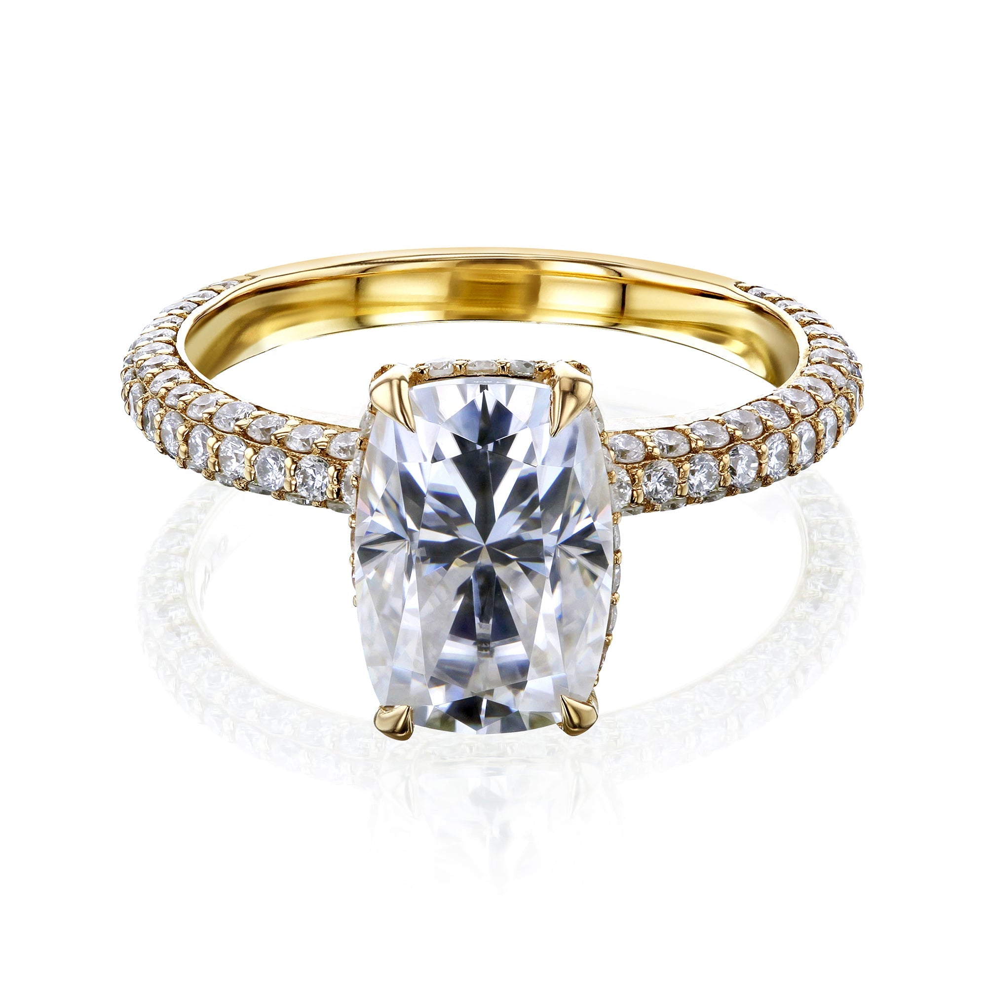 Completing the glimmering design, the center setting is held with a diamond basket and diamond hidden halo, for a full-on diamond decked mounting. The wrap-around hidden halo tucks just under the surface of the center moissanite allowing for light to hop right onto that center stone and bring out its overflowing fire.