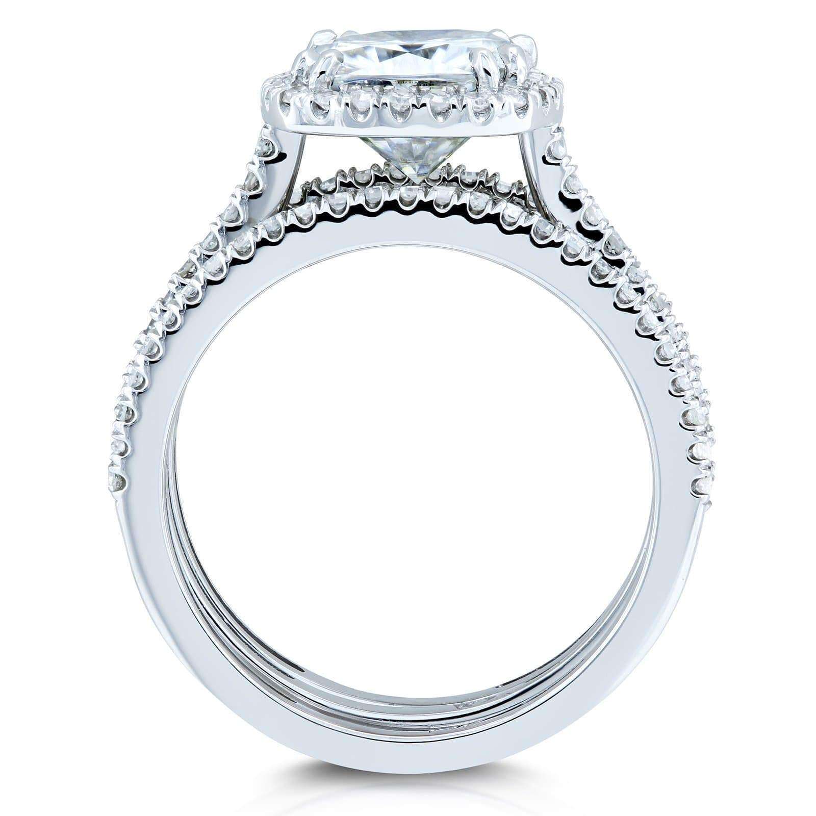 A 2 carat cushion-cut moissanite captures the most brilliant of sparkles over this diamond and gold 3-piece bridal set. Decorating this moissanite center stone are entirely natural earth mined diamonds for a perfect mix of contemporary and tradition. The moissanite showcases pristine clarity whereas the diamonds showcase shimmering luxury. The rings are made with 14-karat white gold and are finished with a beautiful high polish.
