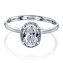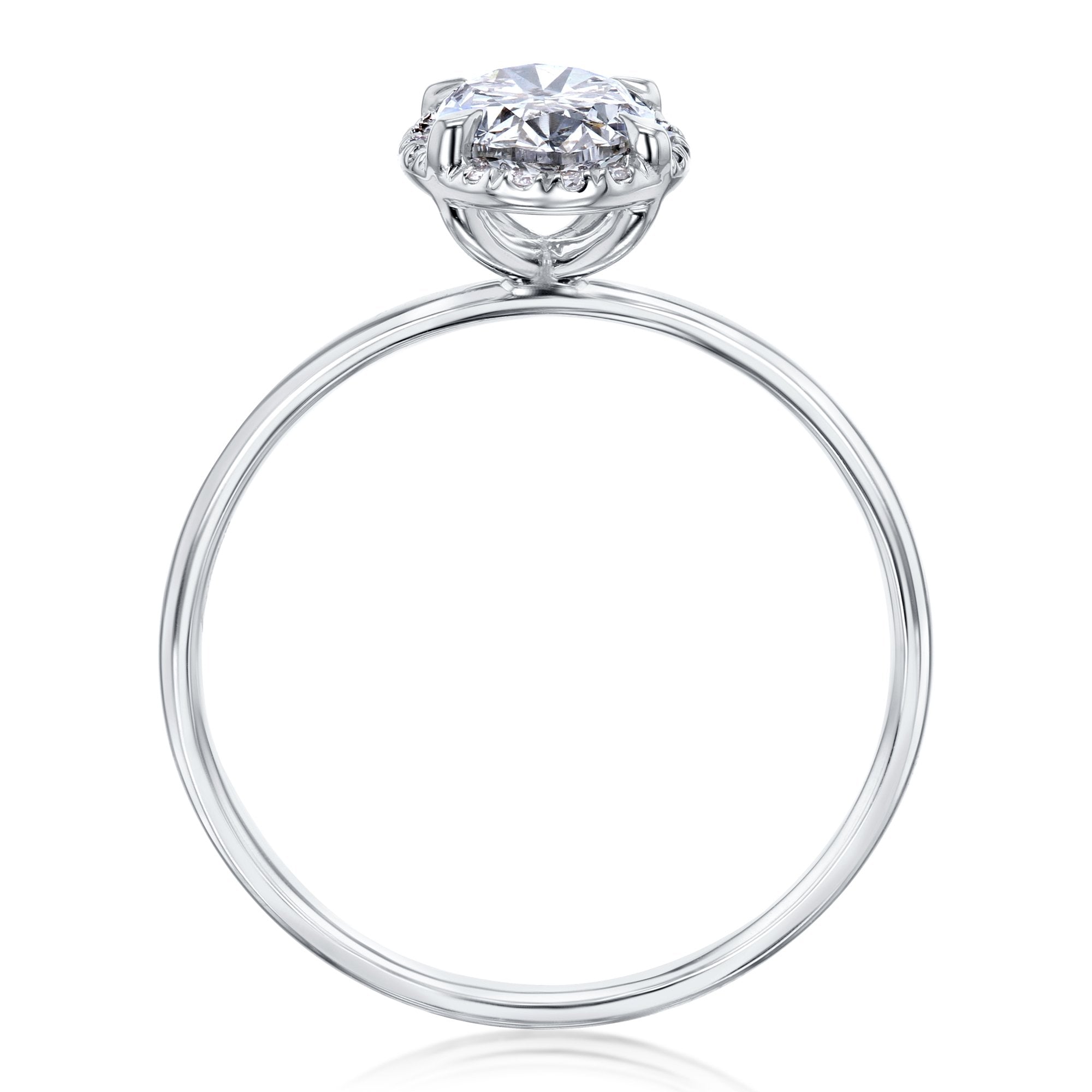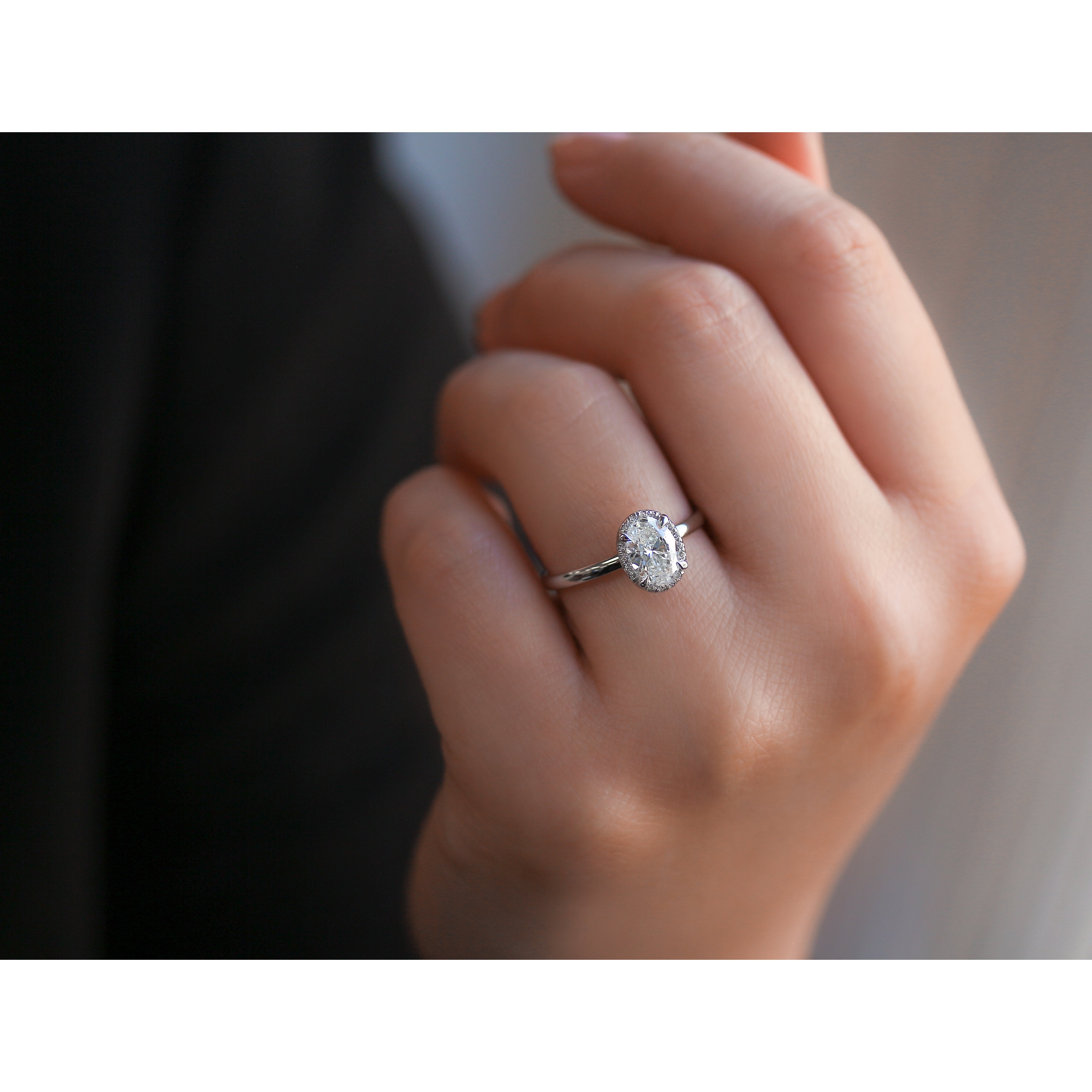 This petite diamond ring is truly a minimalist's dream! A 1-carat oval natural diamond with halo in a four-claw basket setting sits atop a slim comfort-fit band crafted in 14k solid white gold.