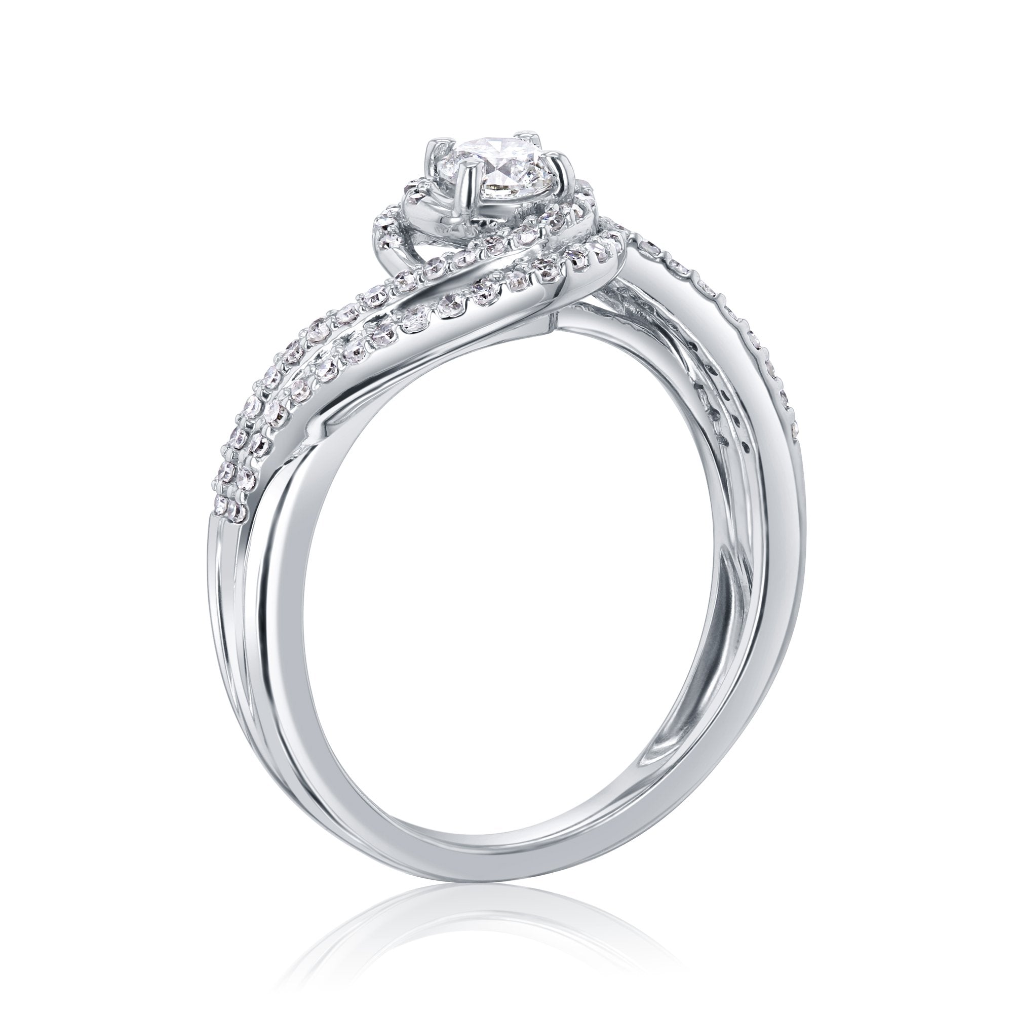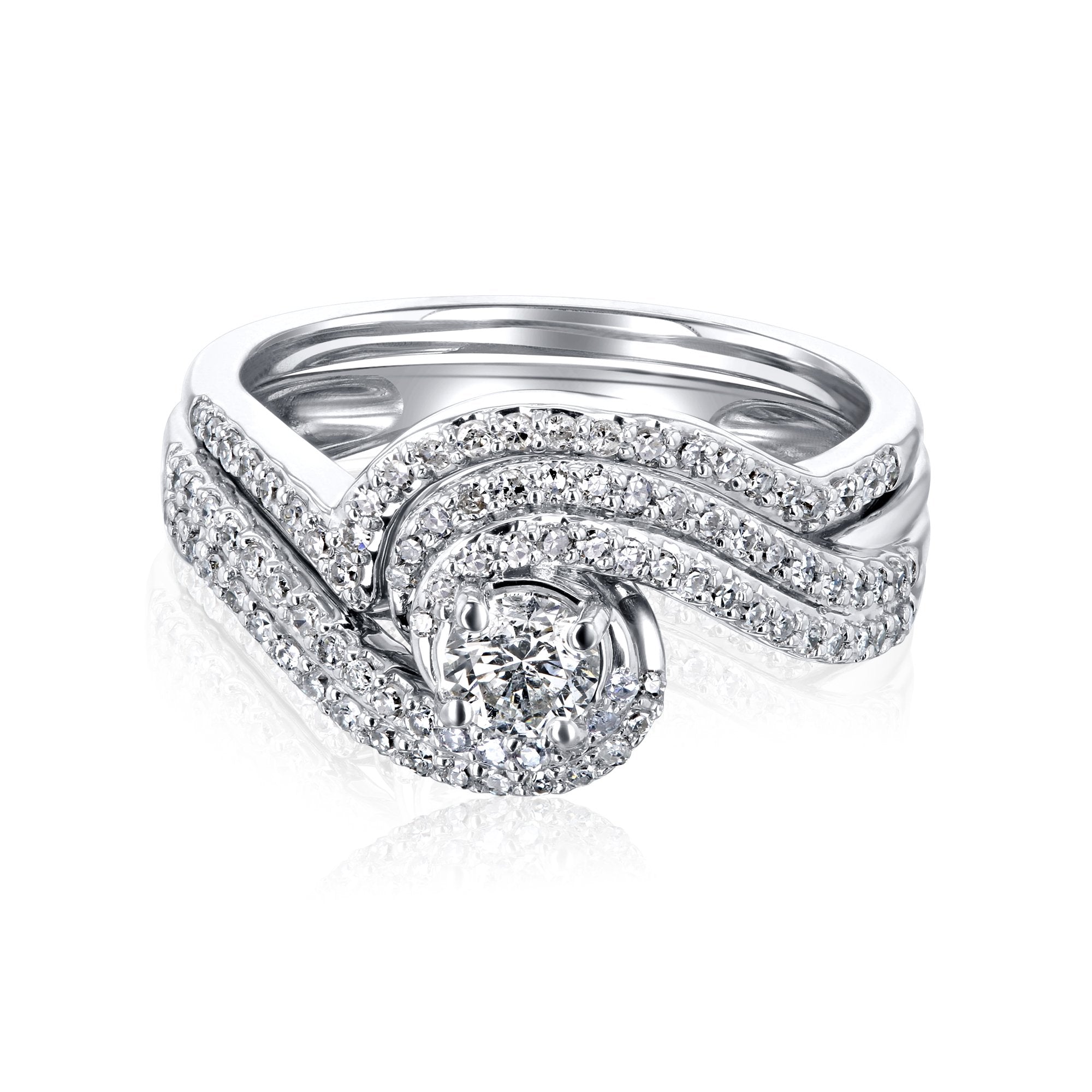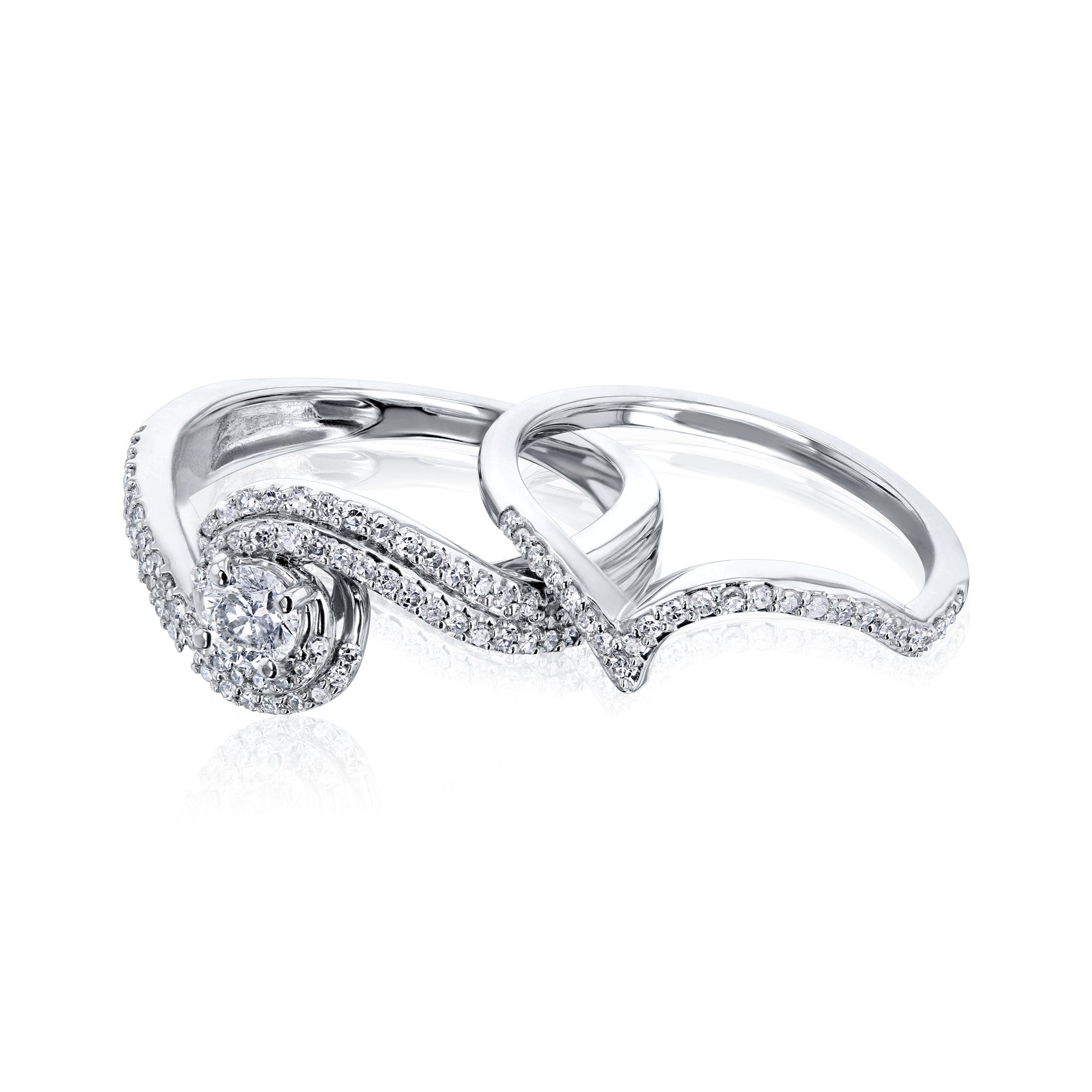 This unique engagement ring design features a 1/4 carat round natural diamond in a prong setting enveloped with two diamond-encrusted rows forming in a wave-like fashion. The set comes with a matching diamond wave band.