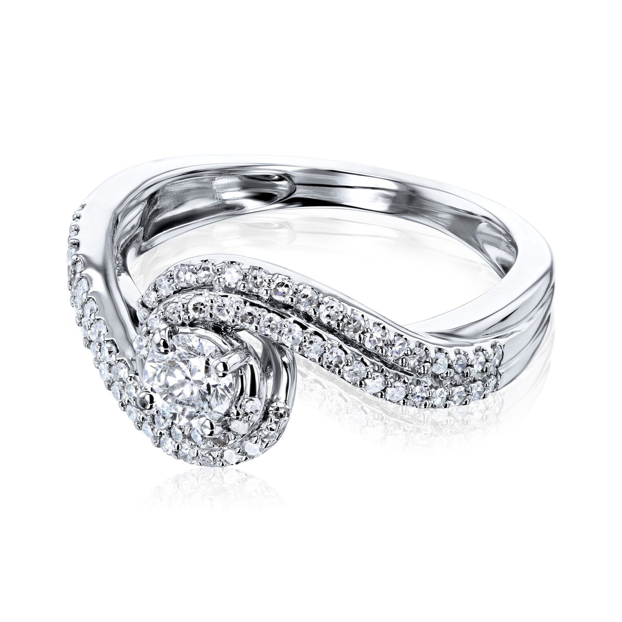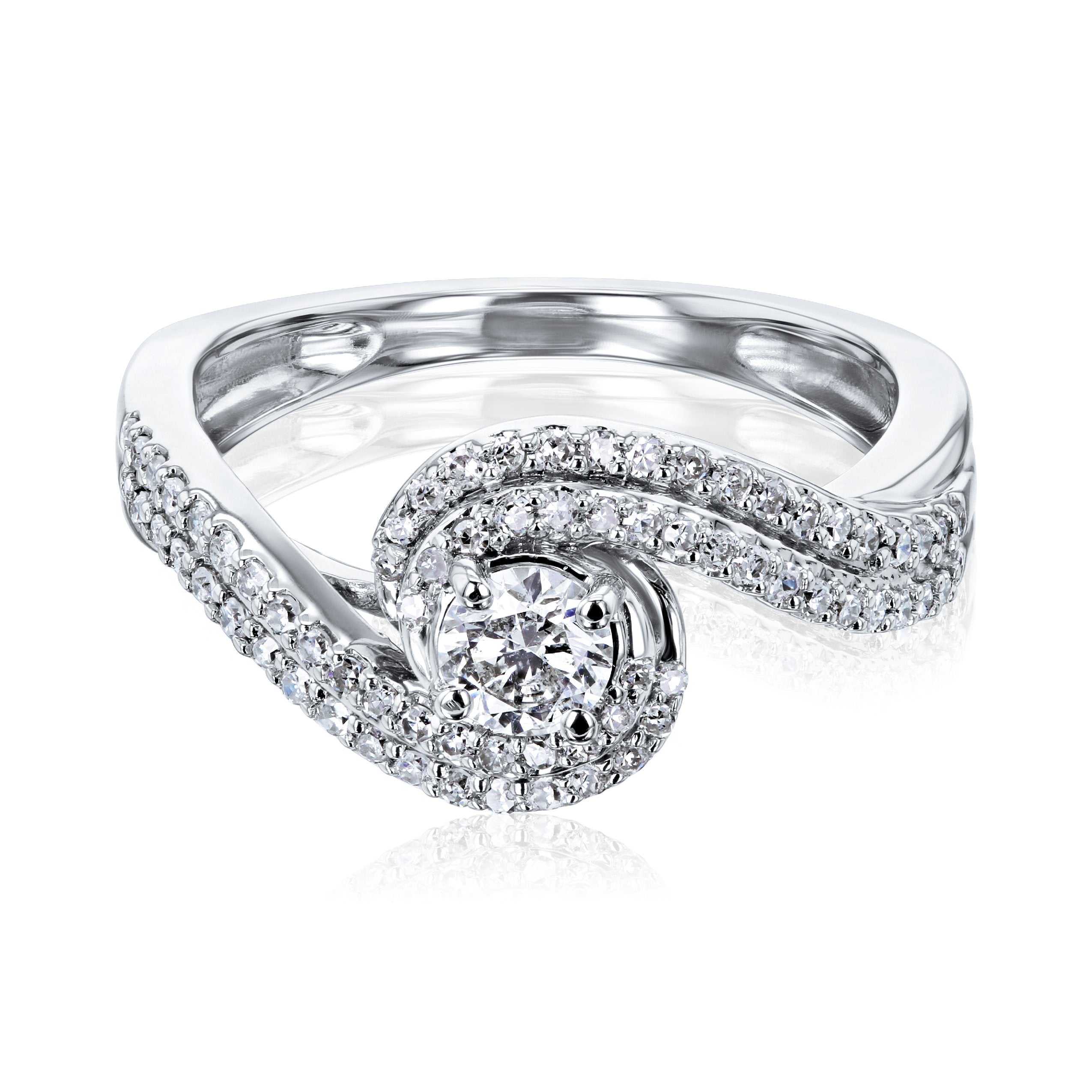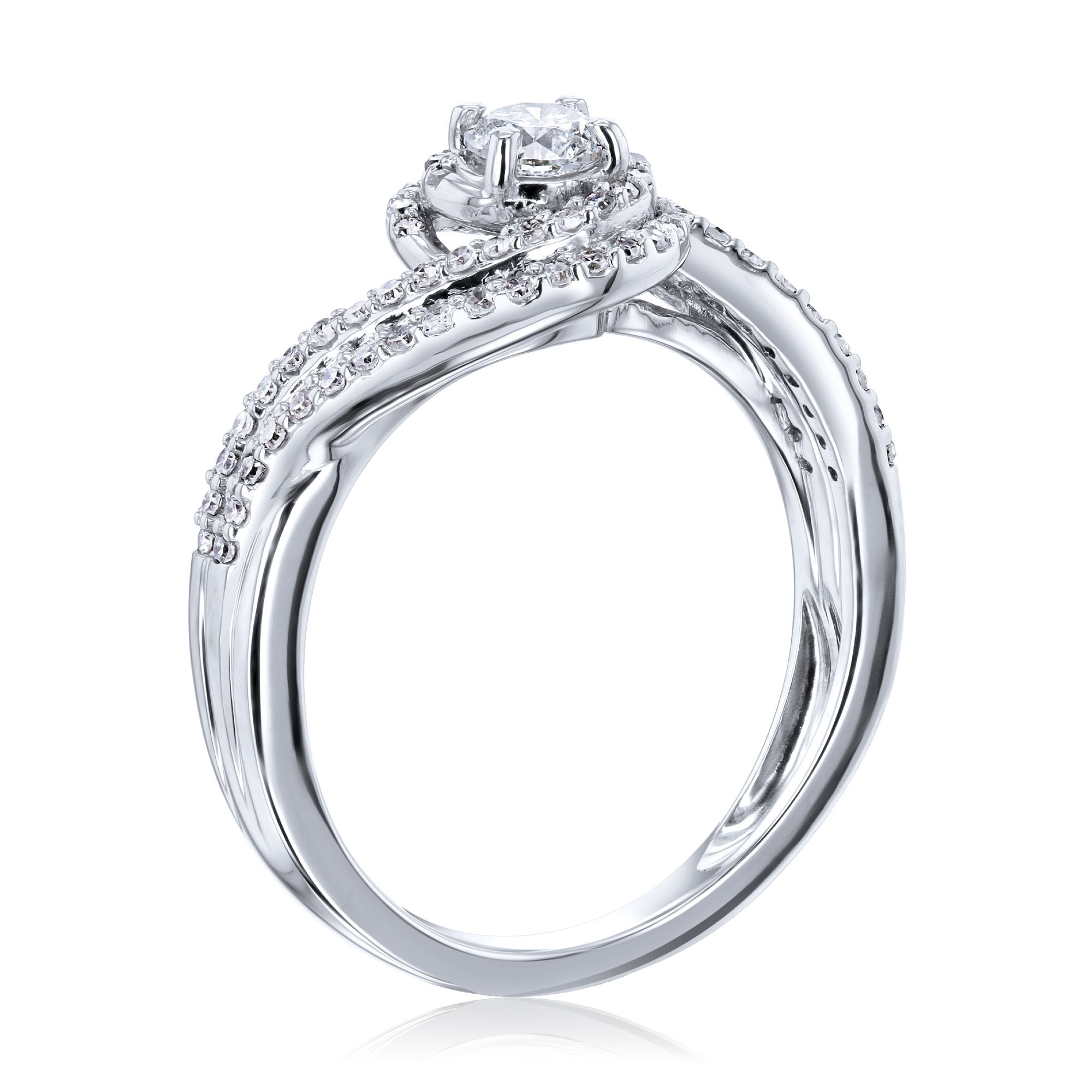 This unique engagement ring design features a 1/4 carat round natural diamond in a prong setting enveloped with two diamond-encrusted rows forming in a wave-like fashion.