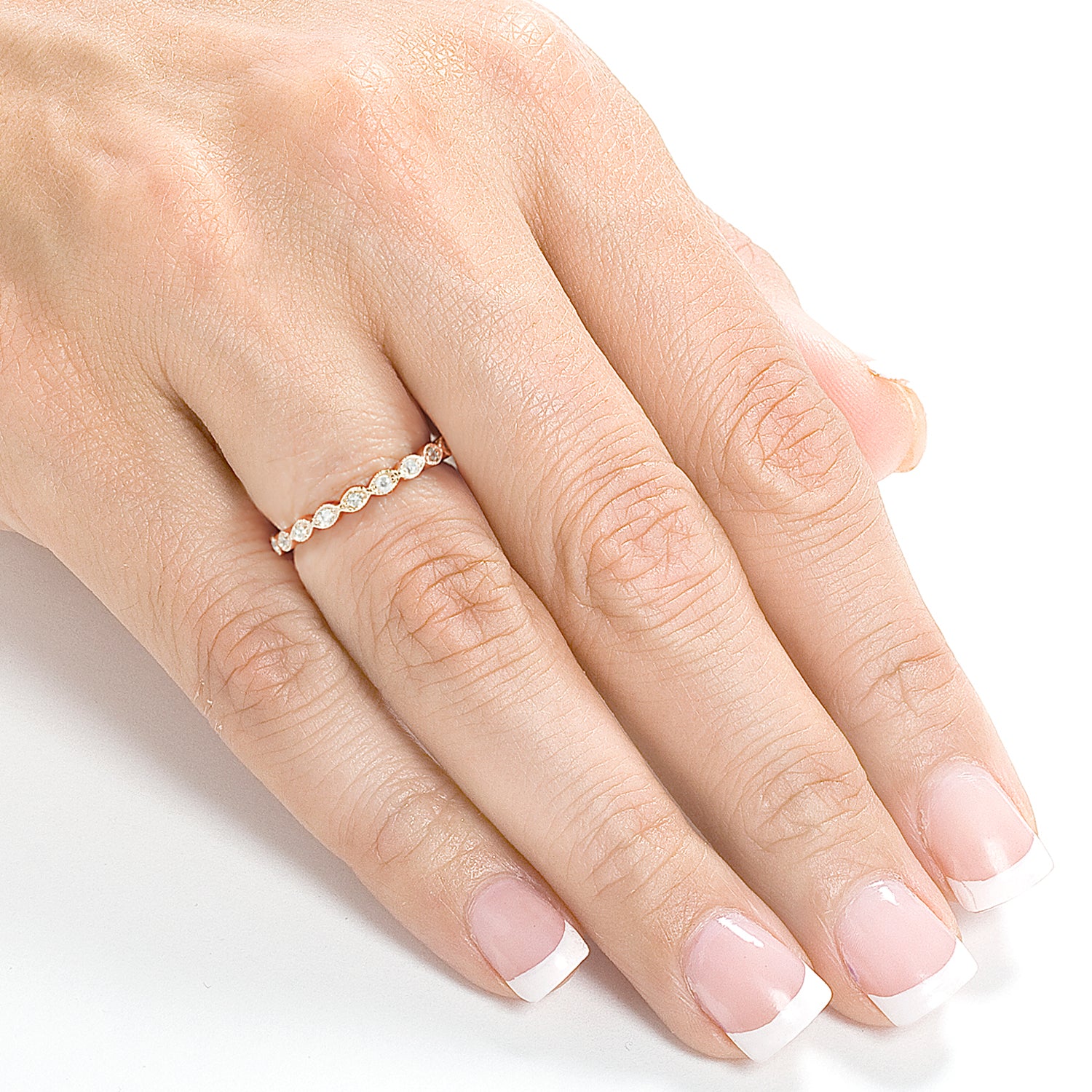 Our Eyelet Diamond Eternity Band is the perfect dainty piece you've been looking for. Wear it on its own or stack it along with other rings, it's sure to give a unique take on both your everyday and special occasion essentials. With up to 22 sparkling diamonds illuminating this charming band and a feminine curvature design all throughout, this is a staple every modern woman should own. But then again, we might be biased... can you blame us?