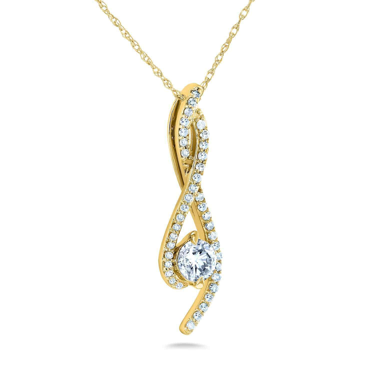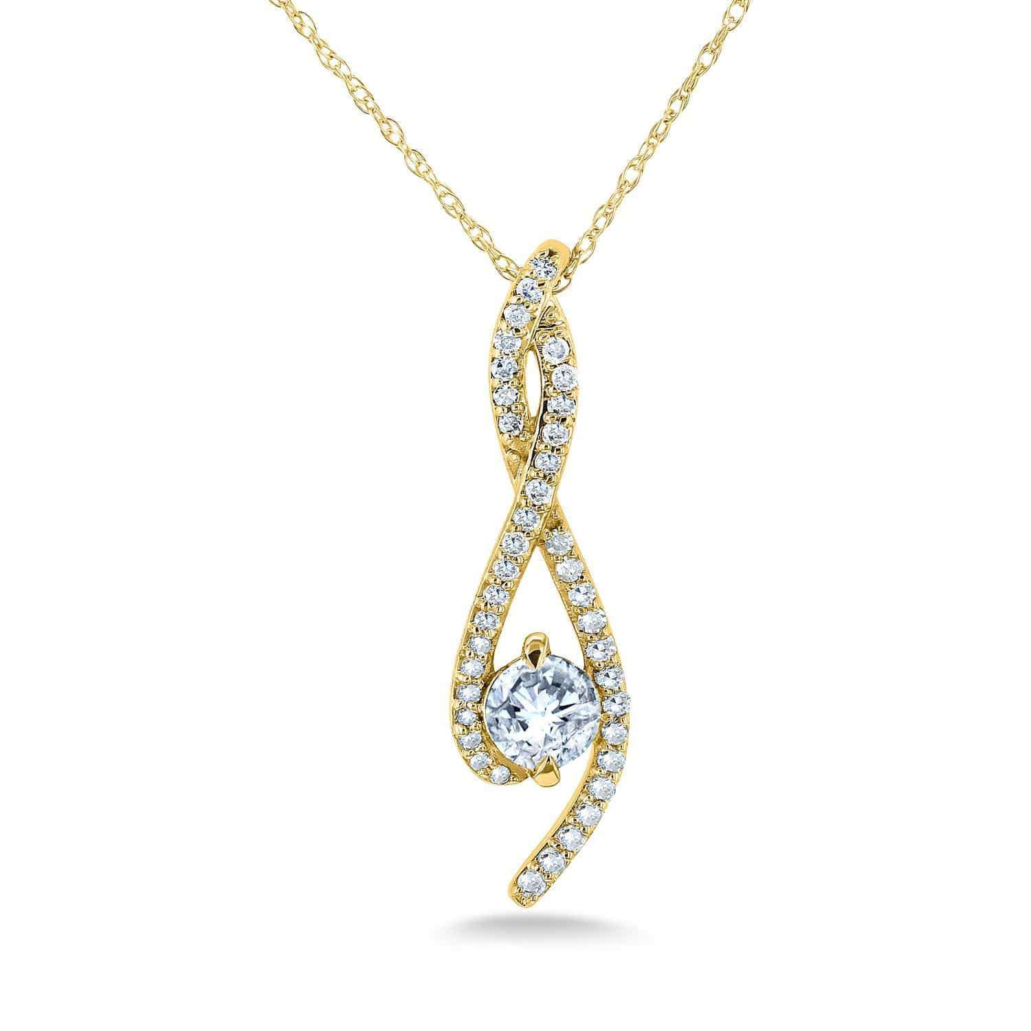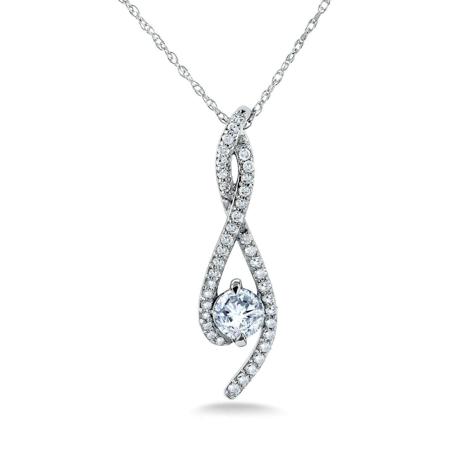 An elegant twirl wraps its way towards a central 1/3 carat diamond on this praiseworthy fine jewelry pendant. The pendant is strung to a delicate 18 inch chain which secures easily with a traditional spring ring clasp. Hanging in sheer wonderment, this endearing style is a gift of perfection.