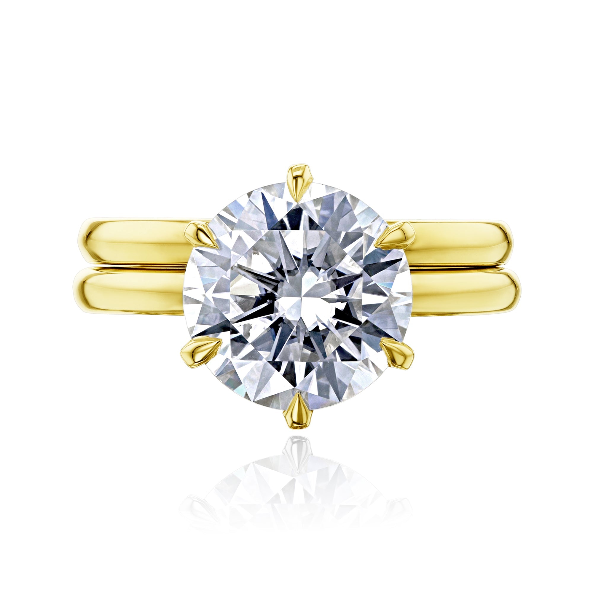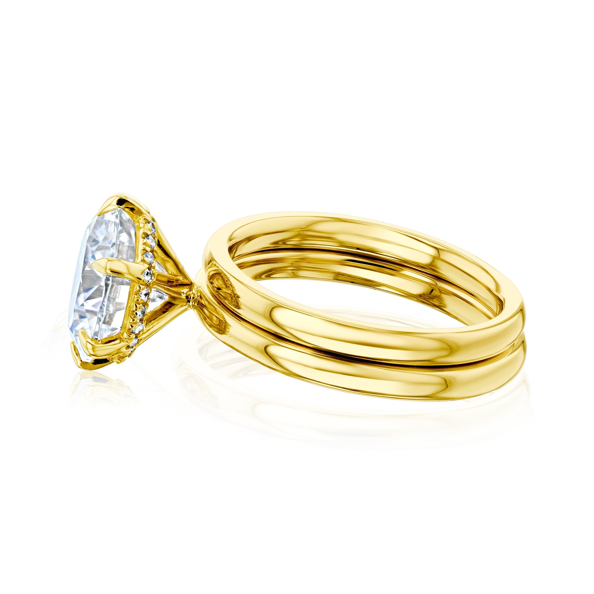The Rosemarie Diamond Bridal Set features a 3 carat round diamond center stone with a hidden eternity halo of lab-grown diamonds in a slim basket setting. The solid gold bands are finished in a high polish with no extra accents for a clean look that brings attention directly to the breathtaking center stone on the engagement ring.