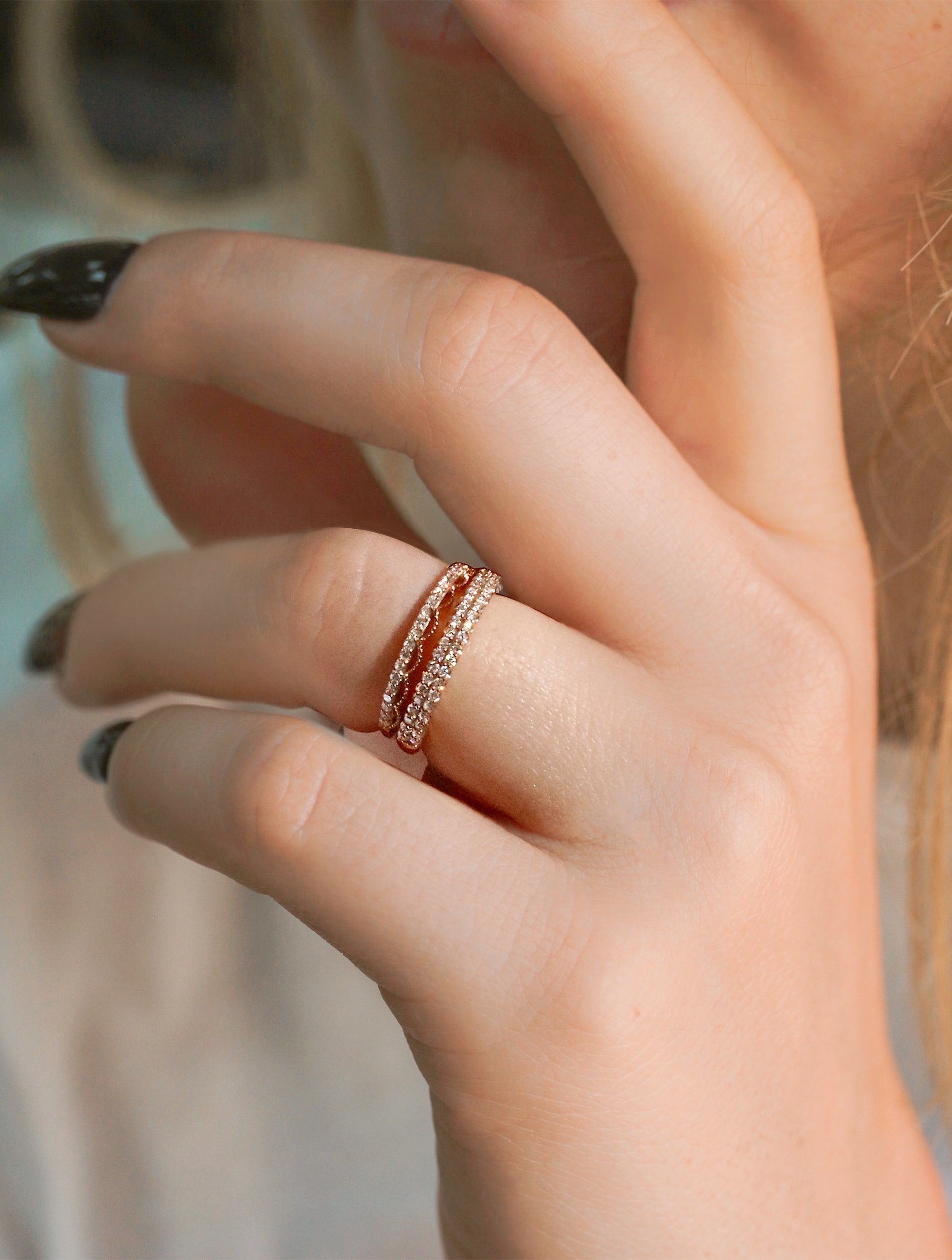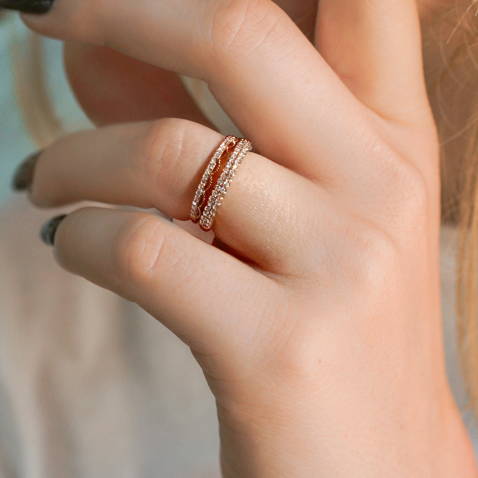 The perfect stacking ring for the modern woman. This high-polish finished ring in solid 14k rose gold is the fine jewelry piece you didn't know you needed! Two rows of sparkling round lab-grown diamonds are the centerpiece of this stylish diamond ring. A tapered solid gold shank means comfort for the wearer, which means you can wear it all day and all night!