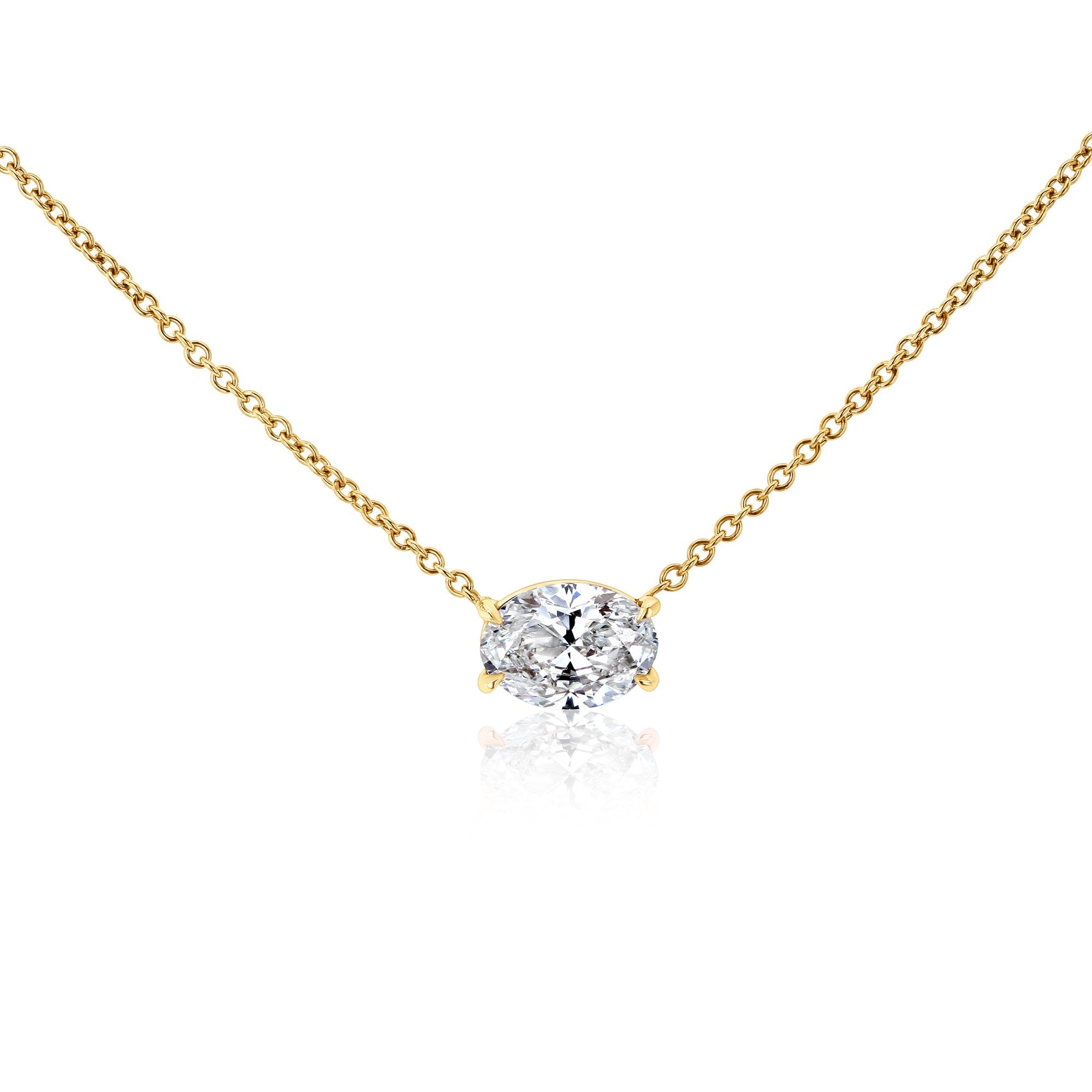 A minimal design that transcends seasons. Our new solitaire pendant necklace features a 1 and 1/4 carat oval lab-grown diamond set in a 4-prong east-west formation, exuding elegance on any given day no matter the occasion.