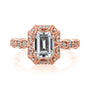 Experience wearing an artwork with our Easton Halo Scallop Vintage Engagement Ring. This ring features a 1.75-carat moissanite emerald-cut center stone in a halo setting bordered by diamond side stones in a 14K pave band. Creating a vintage vibe, milgrain engraving is used for a royal look. Every tiny dot is a picture of hard work and true craftsmanship to deliver the best engagement ring worth having.