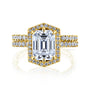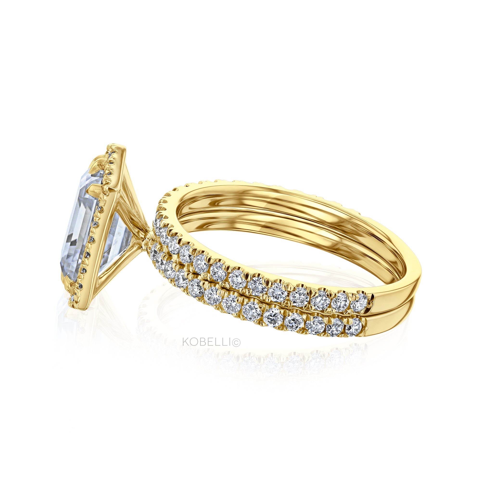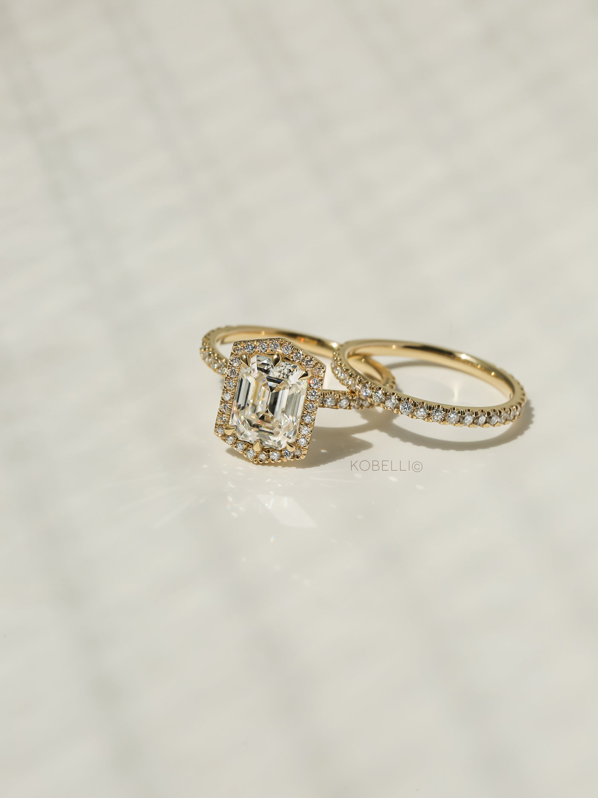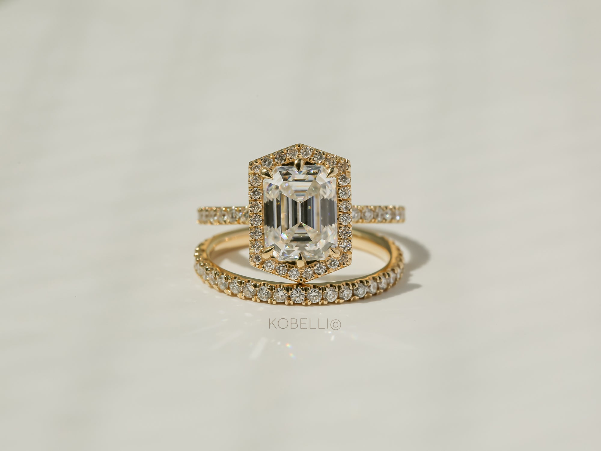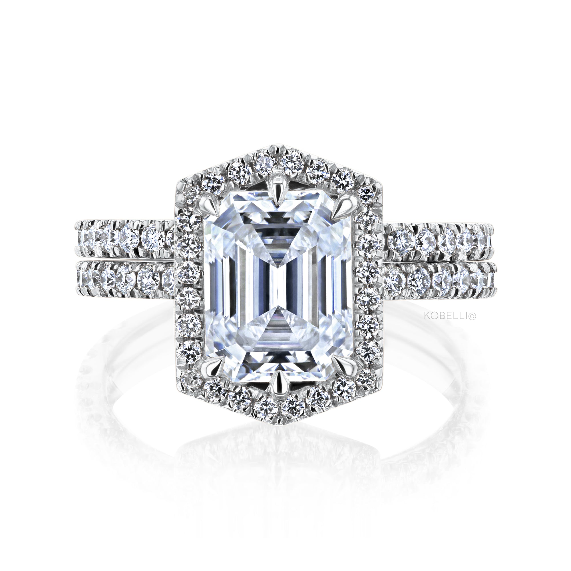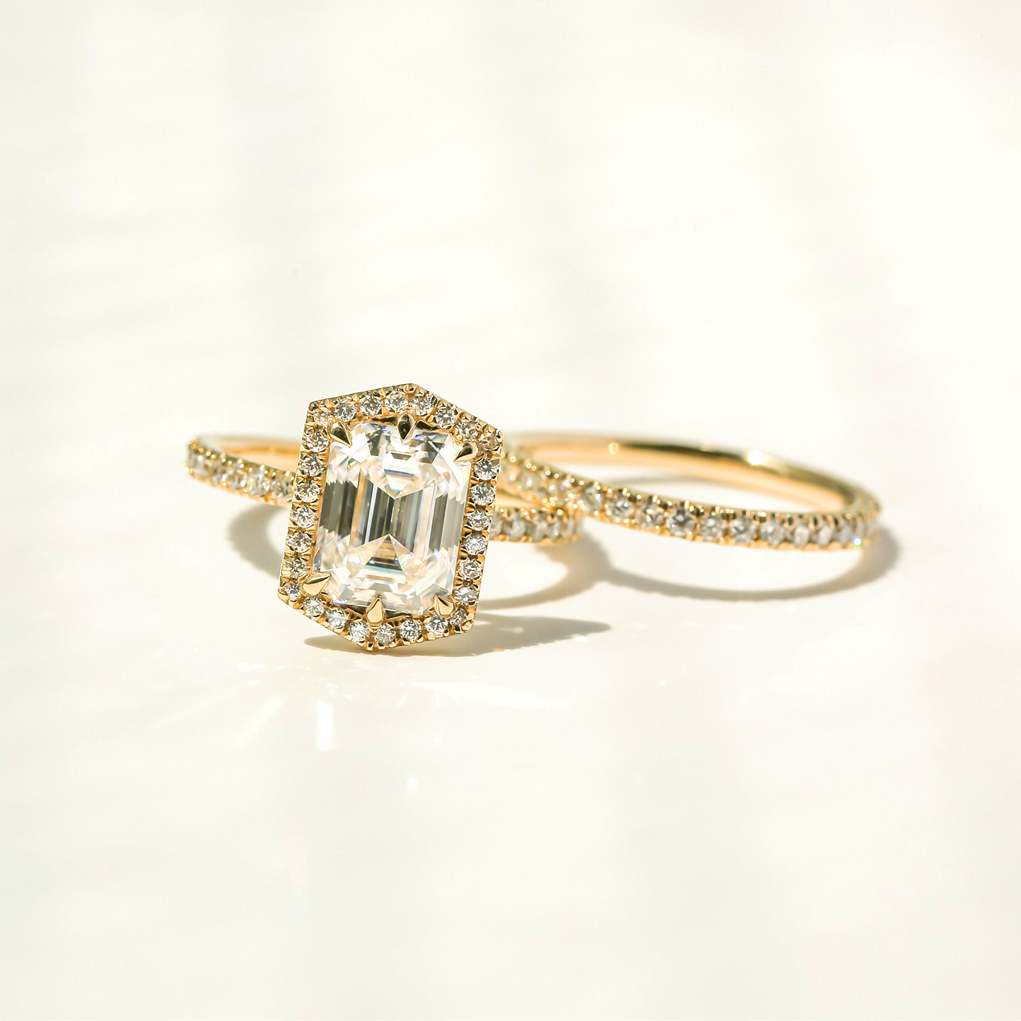 A grand 2.45 carat emerald step-cut moissanite is centered in a moderately high floating setting. Lab-grown white diamonds line the halo as well as both bands in micro-prong pavé settings.