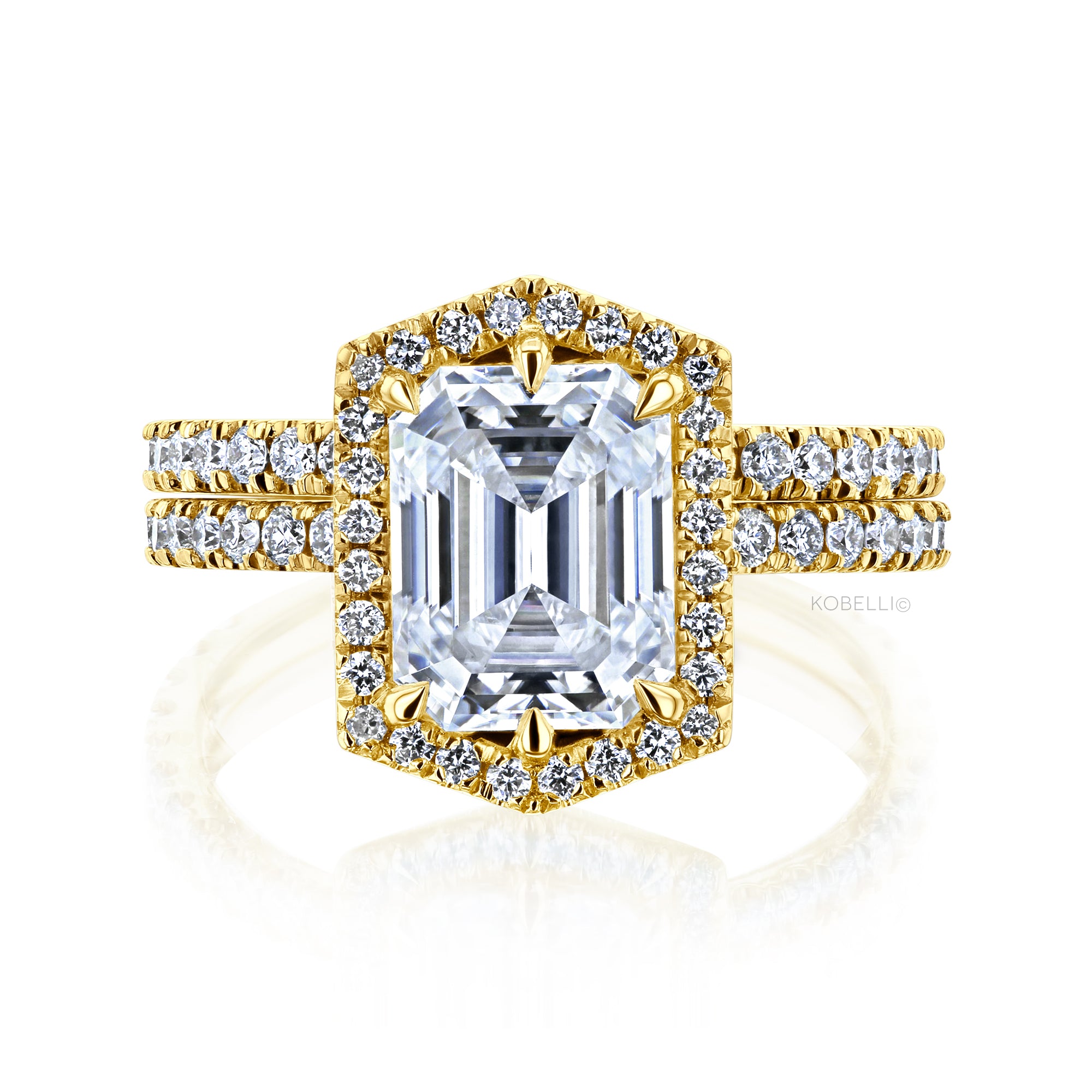 Hexagon Halo 2.45ct Emerald Moissanite & 0.89ct Diamond Vintage Style Bridal Rings Set - 3.34ct.tw in 14k Gold