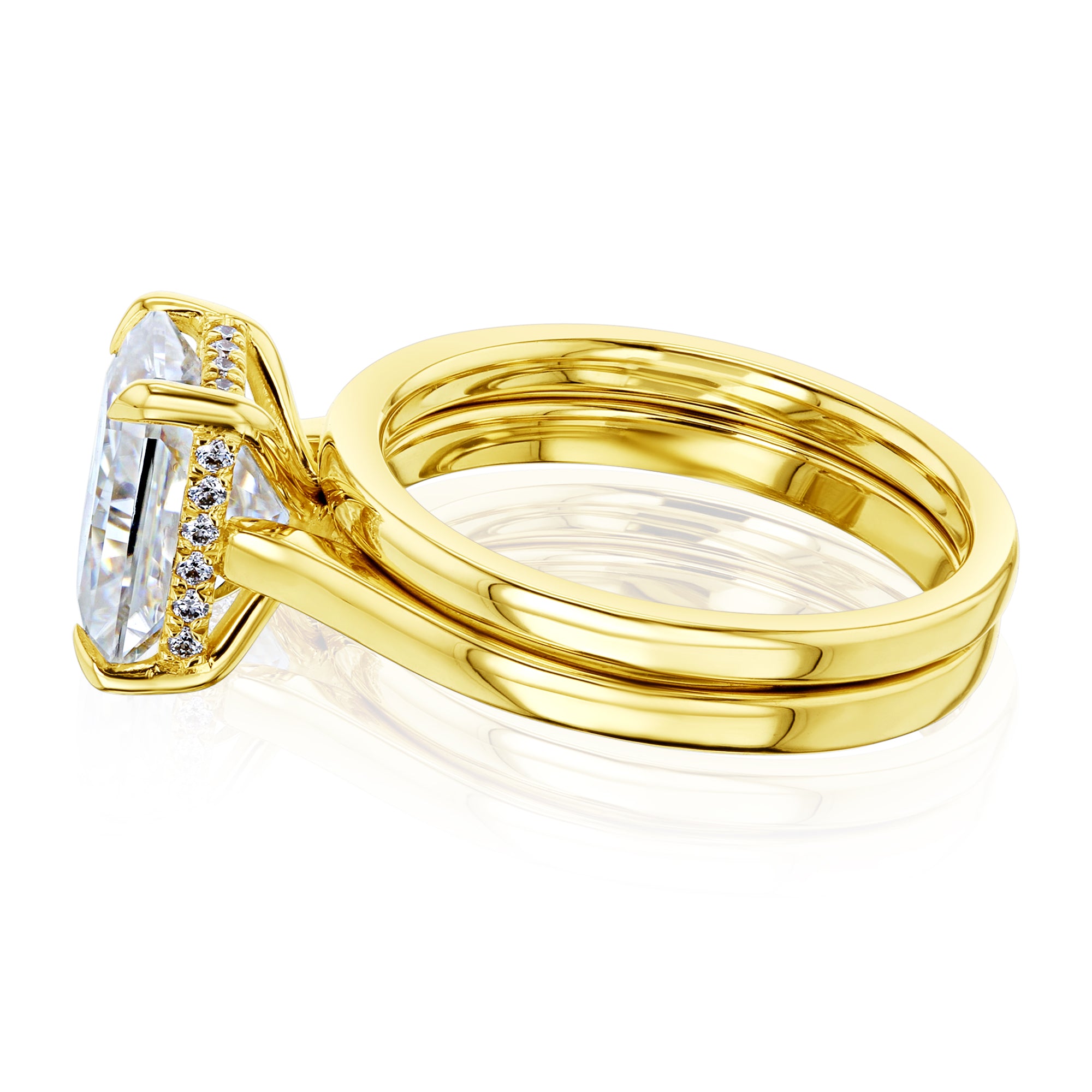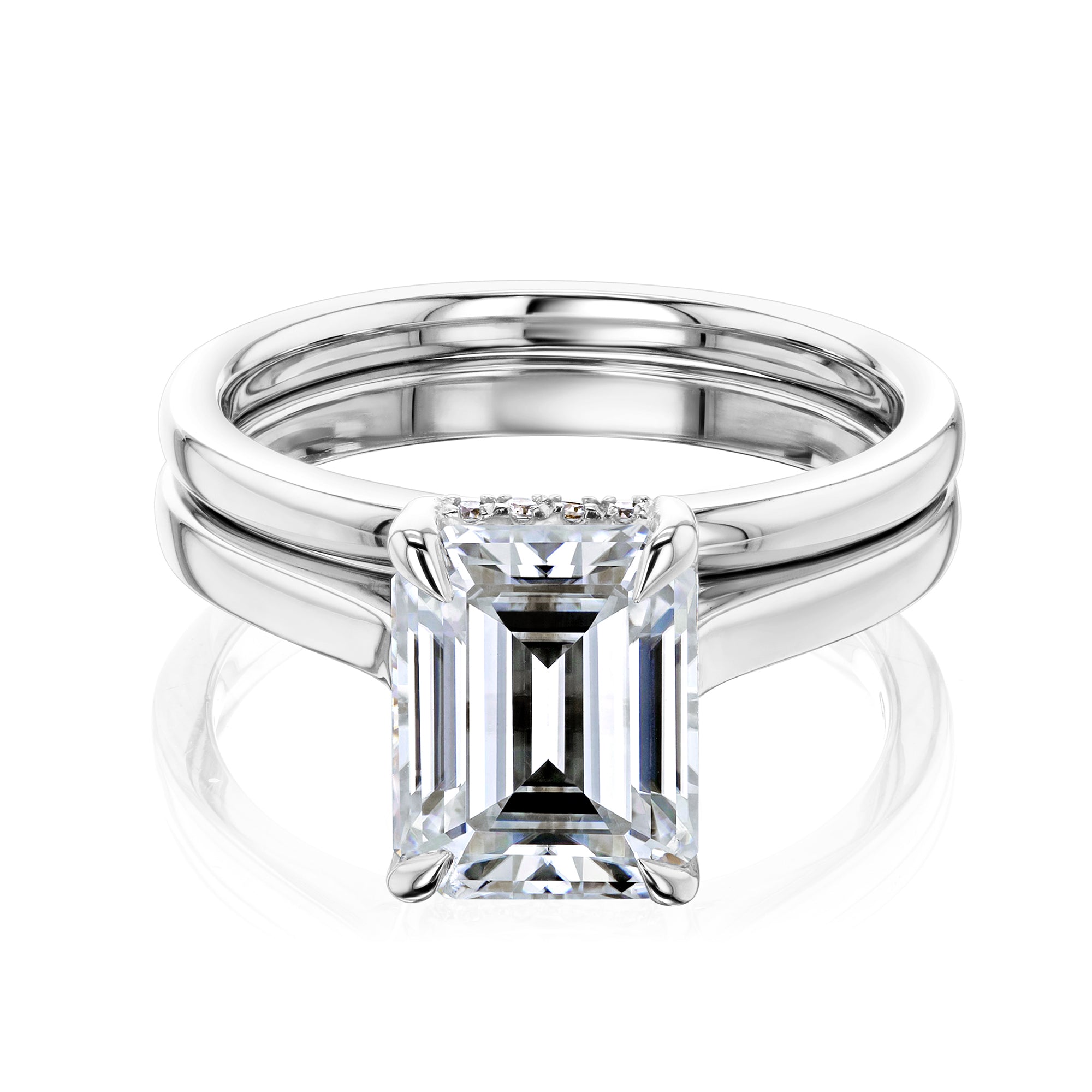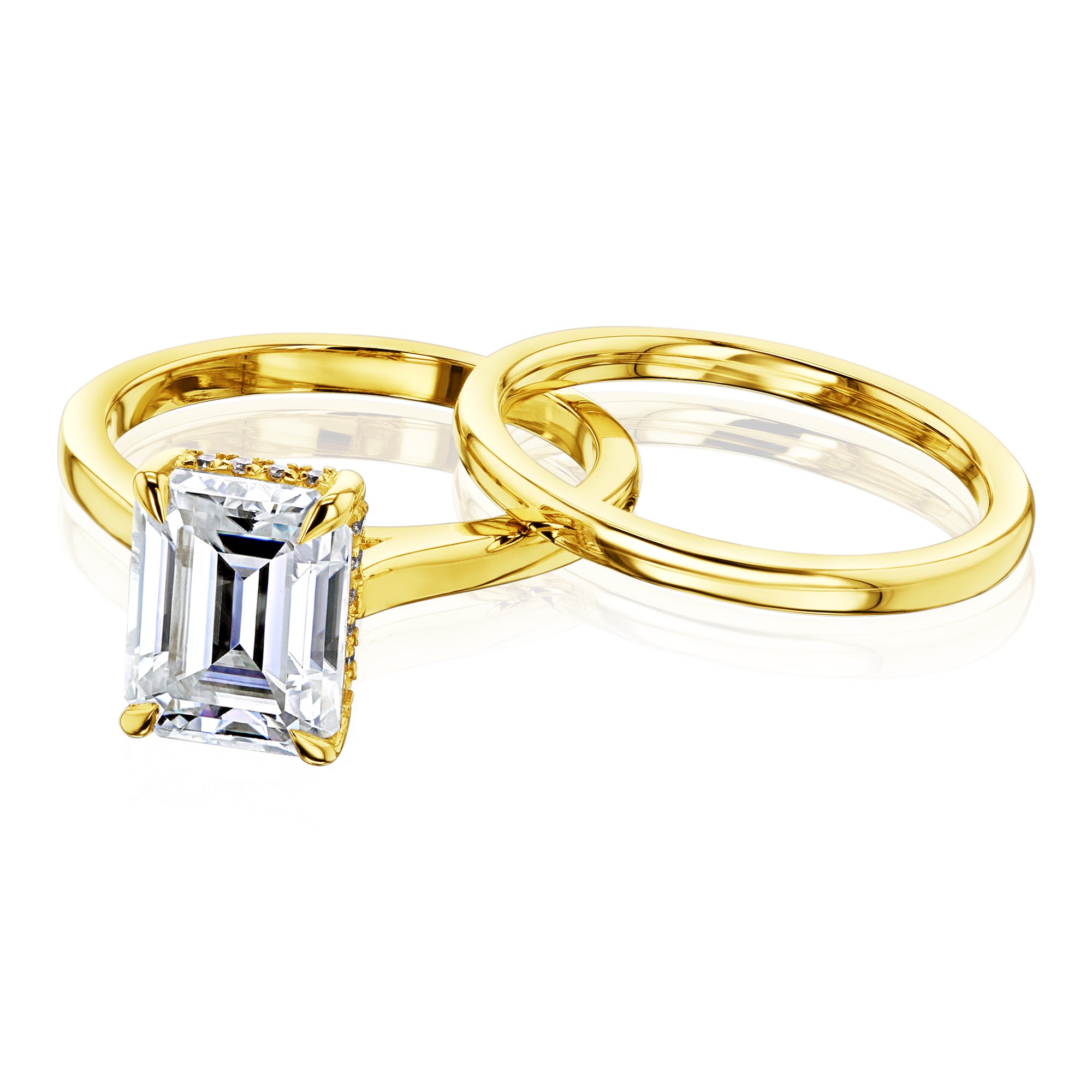 Forever is sometimes defined by a set of bridal rings. The clean geometric shapes and prominent color that moissanite stones create lift the character of an emerald-cut engagement ring. Our Eden Bridal Set is a luxurious 2.45-carat emerald-cut moissanite engagement ring encrusted with 20 round diamond side stones in a cathedral setting and a matching wedding band, both in 14k solid gold medal. Special moments become a treasure for generations to come in this sleek and modern bridal set.